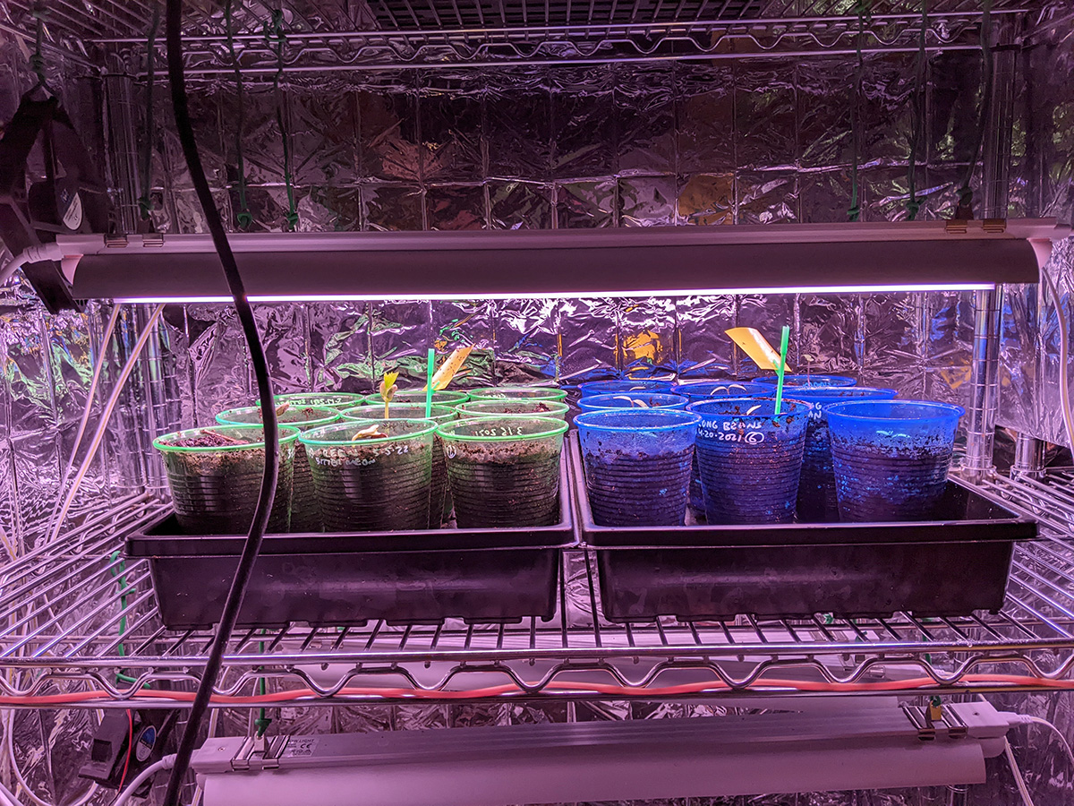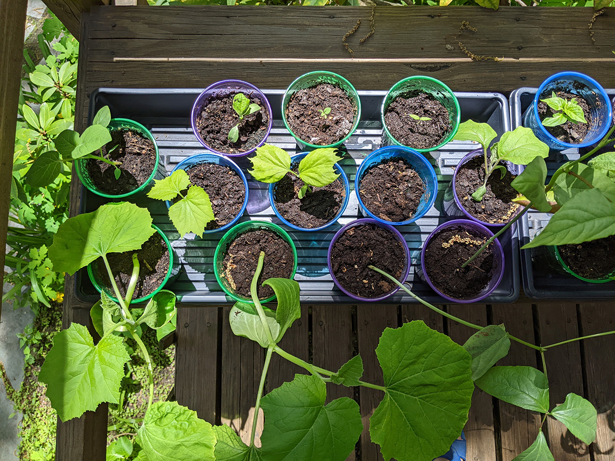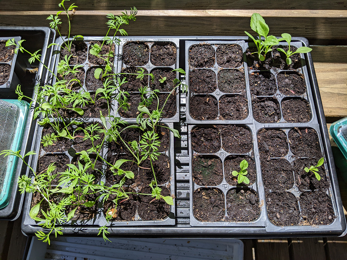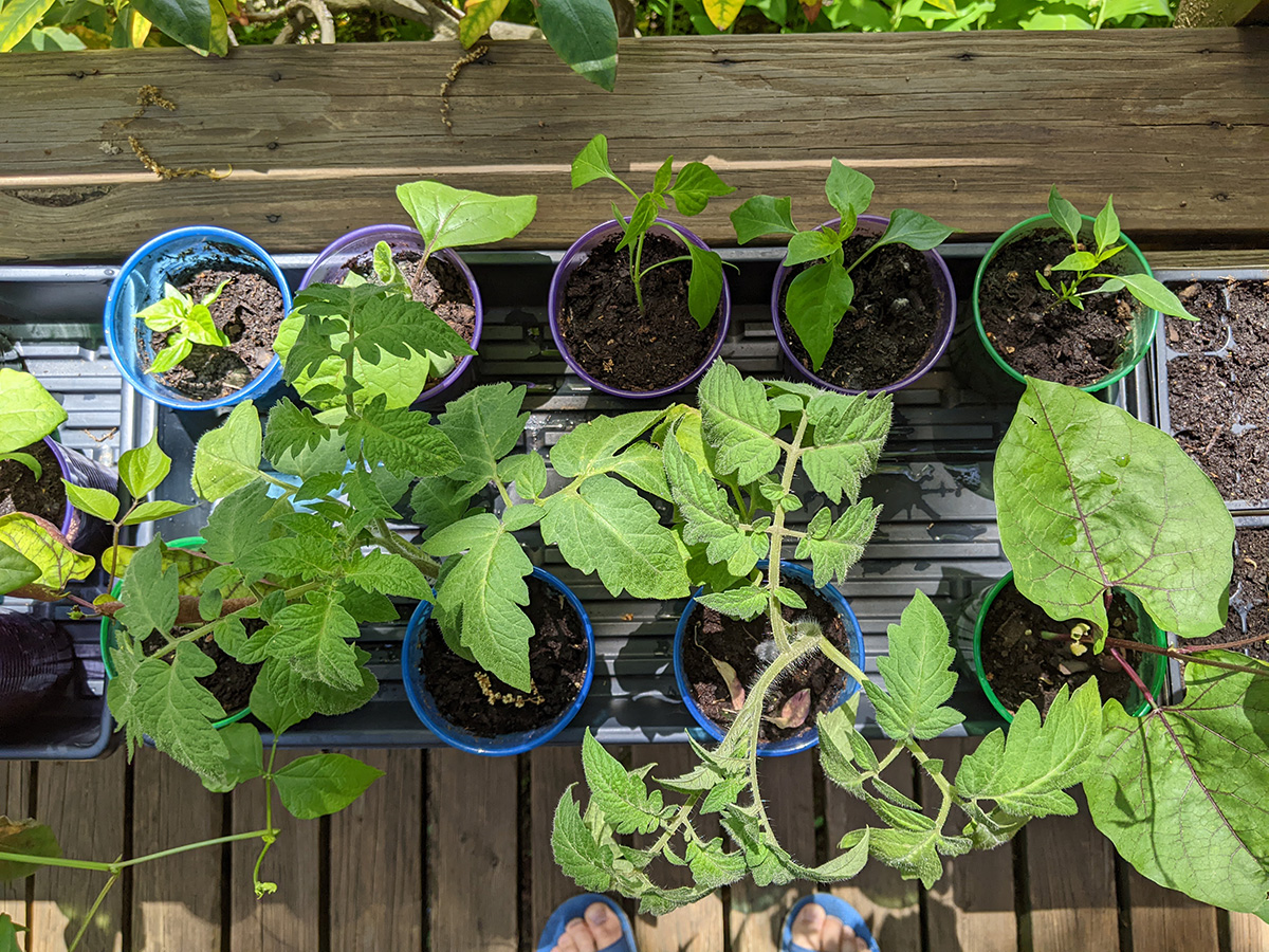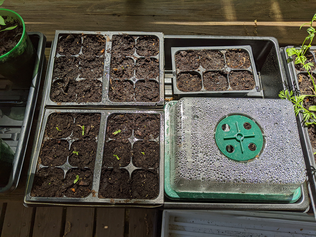 most of the seedlings were wilting from the heat. i had to do a quick emergency watering to restore their turgor pressure. if it gets this hot again, i'll need to move them so they're not sitting out in the sun all day. full grown plants can tolerate this heat, but up until a few days ago these seedlings were growing in the relative calm of my grow closet.