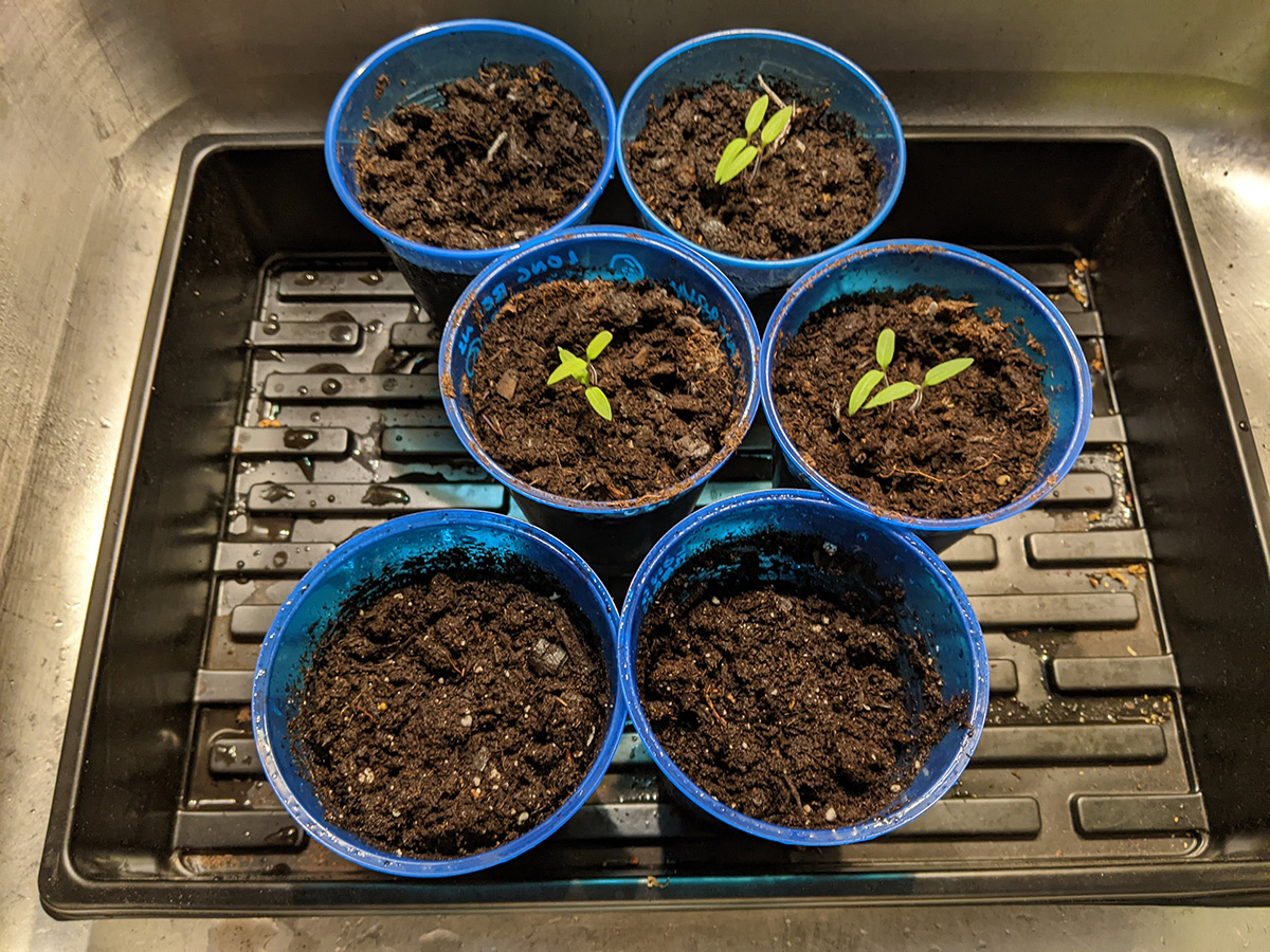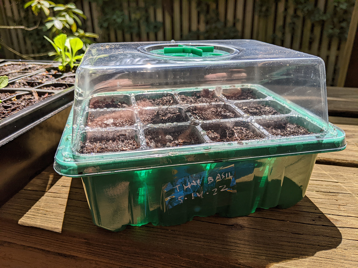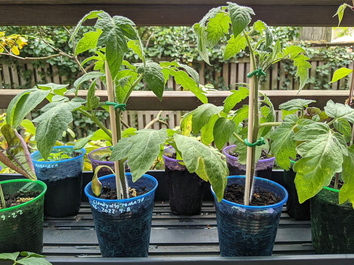 i did some at-home gardening this morning. i tended to my seedlings, watering them and spacing them out so they weren't crowded next to each other. i separated out some cherry tomato seedlings, making out with 3 additional tomatoes. i'm still keeping a single shelf active in my grow closet, for delicate seedlings (like emerging tomatoes) and emerging seedlings (bitter melons). i planted 12 planter cells with thai basil. i should've started them earlier, but they'll have all summer to grow, and thai basil is one of those plants that i grow every season but i almost never use it. finally, i staked my tomato plants, as i noticed they were drooping. i didn't have any skewers but i had plenty of disposable bamboo chopsticks that i used along with rubber coated garden wires.