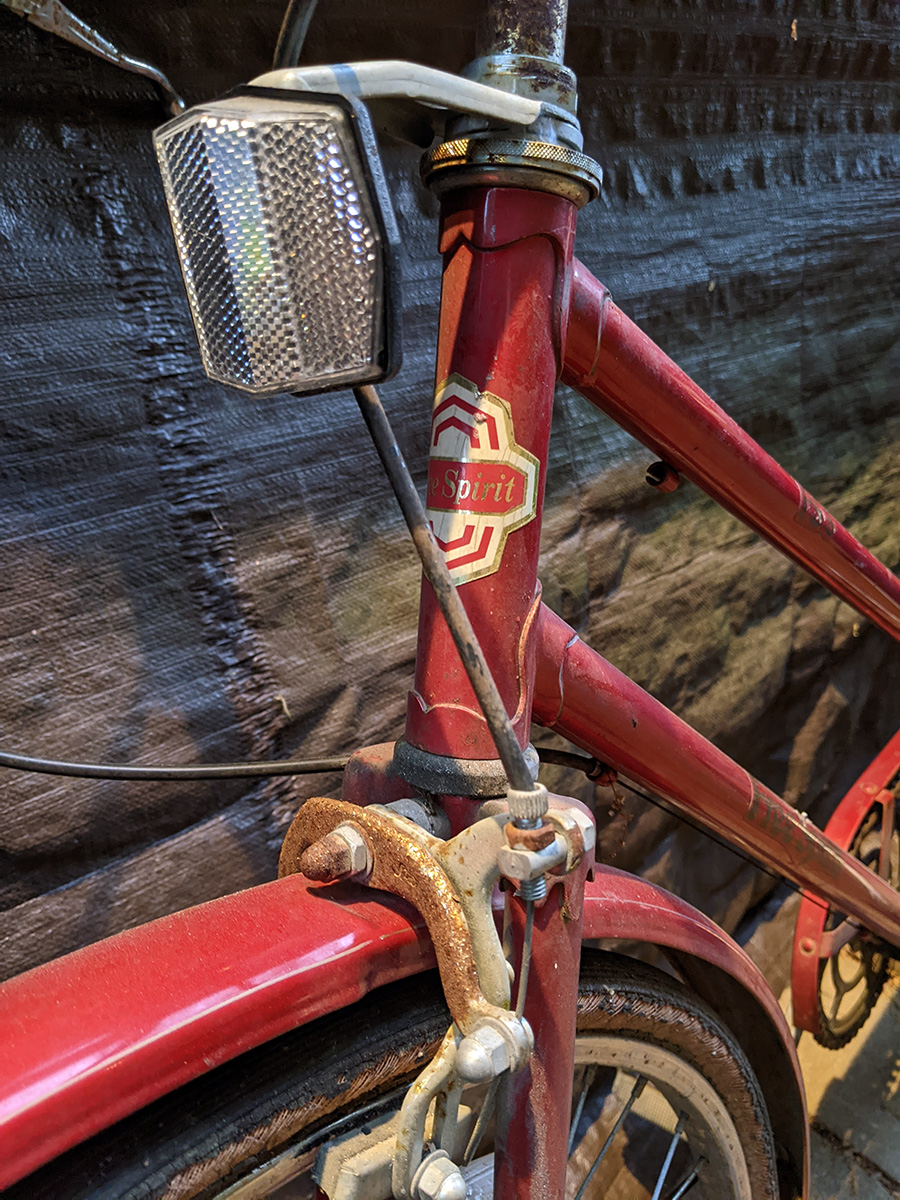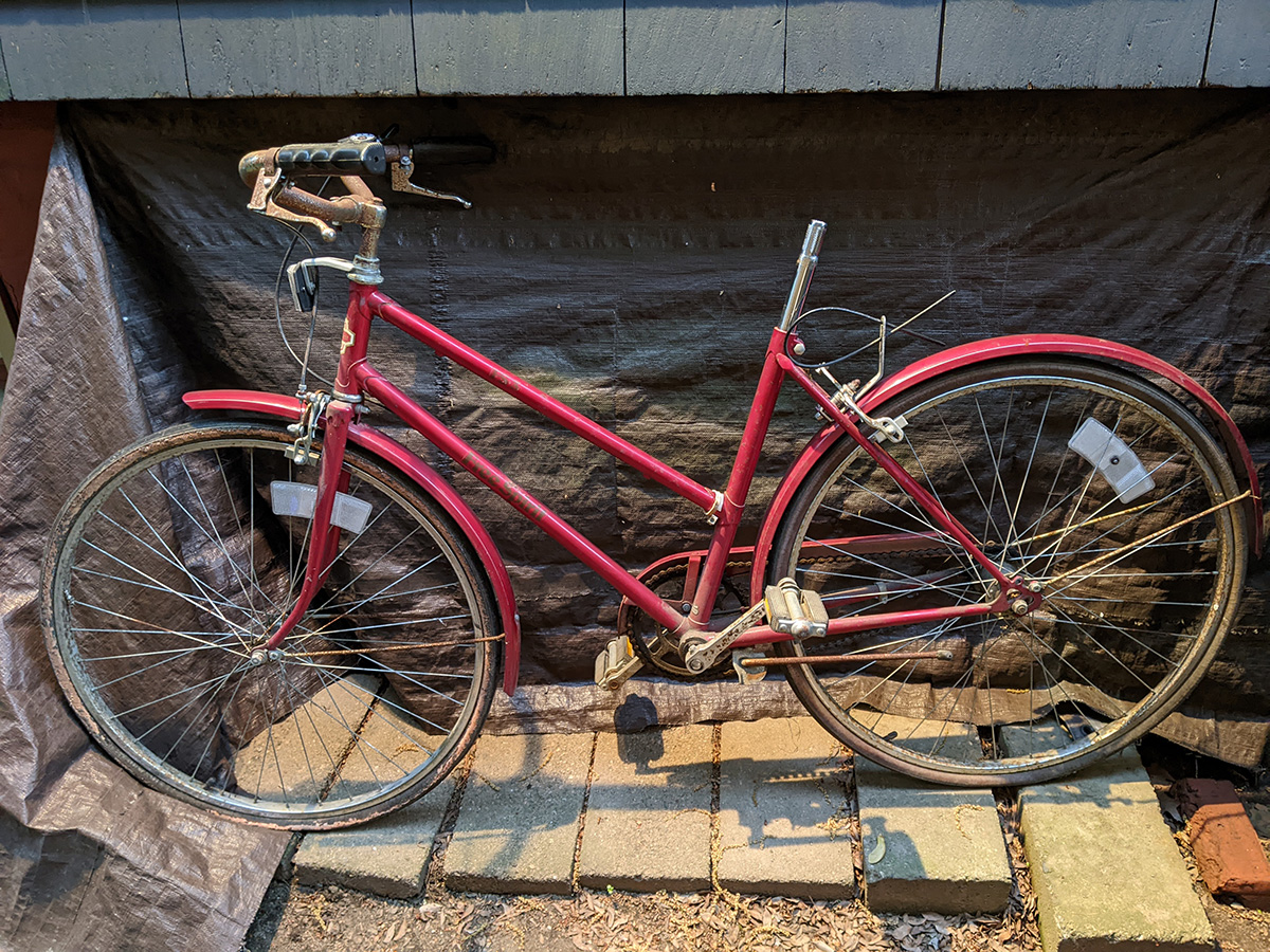 i left belmont around 7:15pm. approaching home, i noticed that bike i saw earlier this afternoon was still there. that's usually a sign that the bike isn't in very good condition, otherwise somebody would've taken it by now. i stopped to check it out anyway, it was a red "free spirit" women's bike. there was rust on the handlebars and it was missing the bike seat (but the seat post was still there) and the rear reflector, the two tires were flat (and cracked), but otherwise seems to be in an okay shape, or at least easy enough to bring back to riding condition. so i decided to take the bike. to do that, i first locked my own bike to a sign post, then wheeled the found bike back to my house. once i got the bike in the basement, i walked back to where i locked my bike and rode it back home.