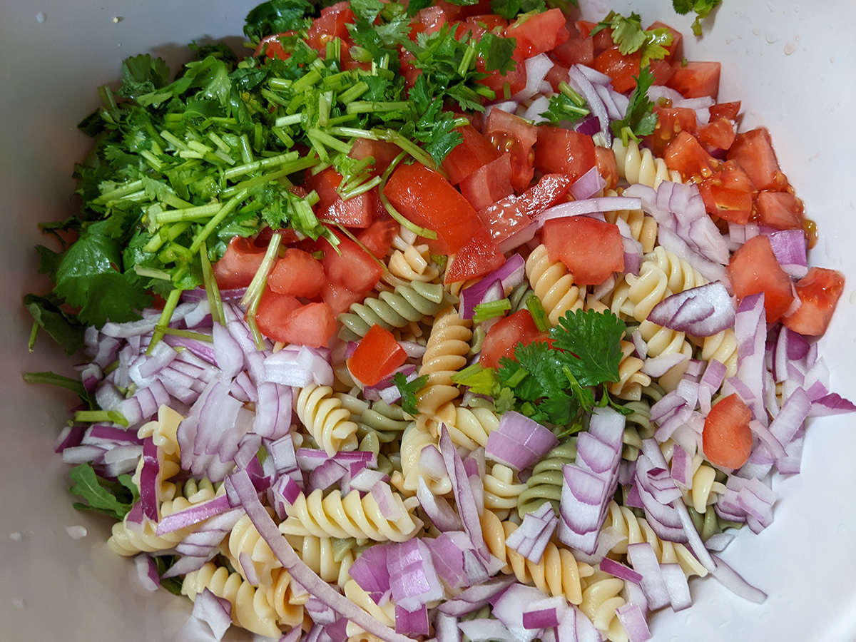 | cook pasta. let cool. mix with remaining ingredients including dressing. serve cold. | |