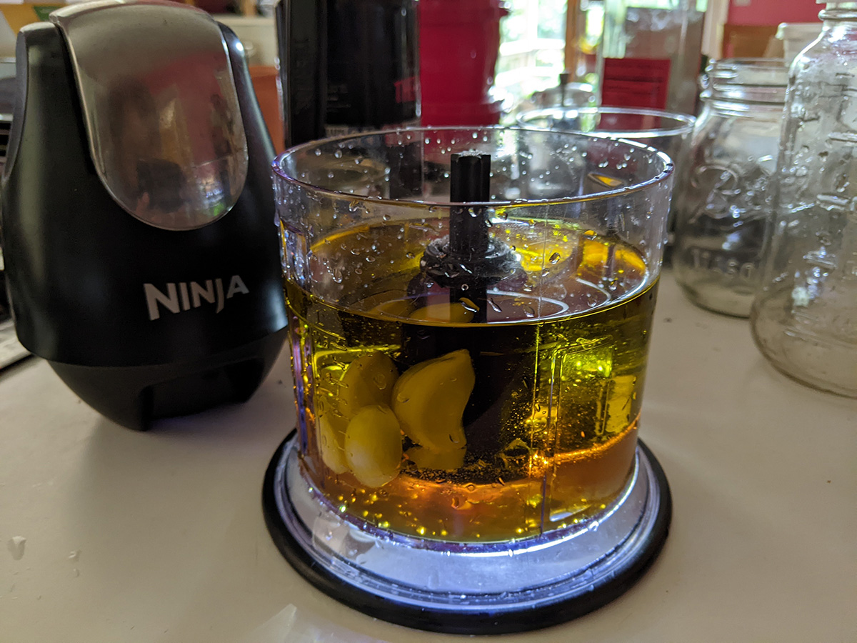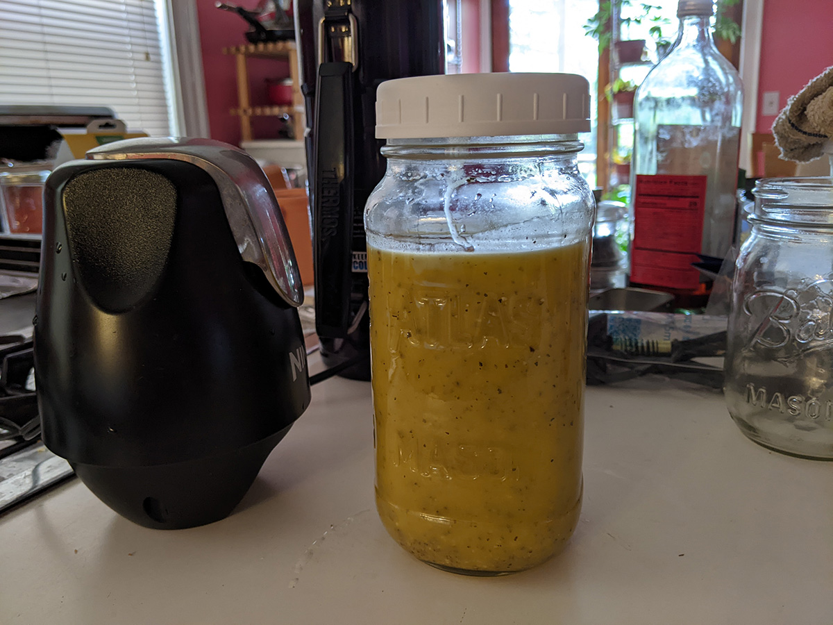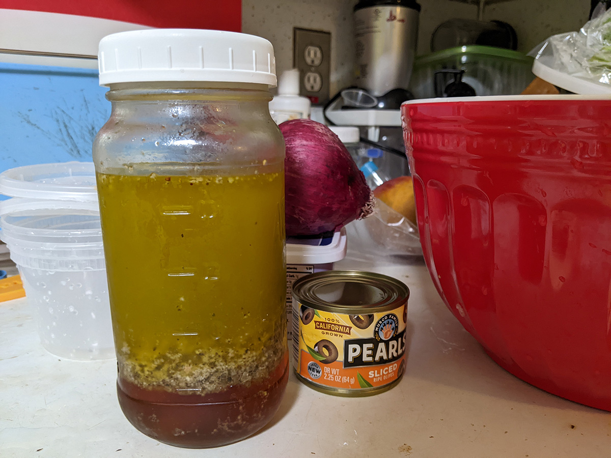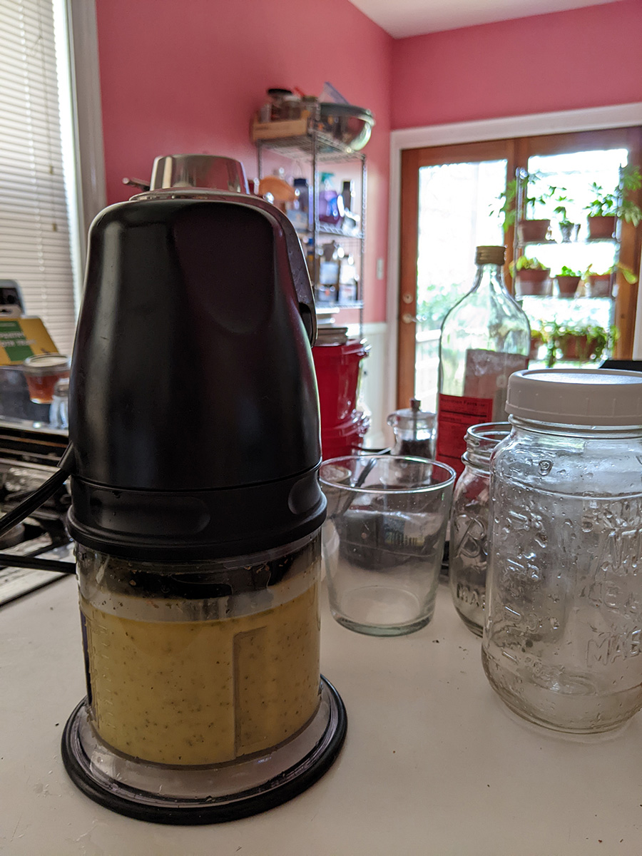 in the afternoon i was starting to head out to my parents' place to do some gardening there. but before i left, i went to market basket to get some ingredients for making pasta salad. i came back and made the dressing first (so i didn't have to bring my food processor), storing it in a leak-proof mason jar. for some reason it overflowed the processor even though i was using the same amount i always use.