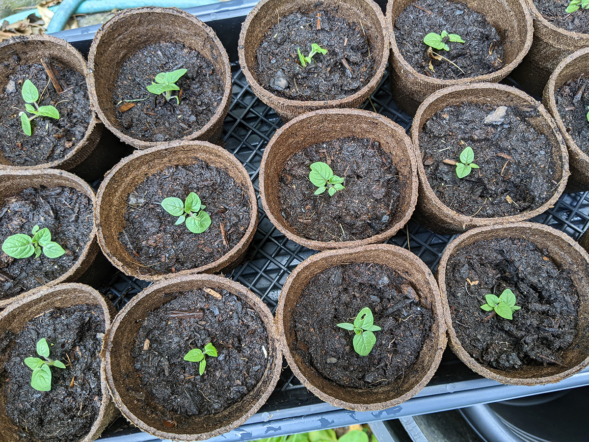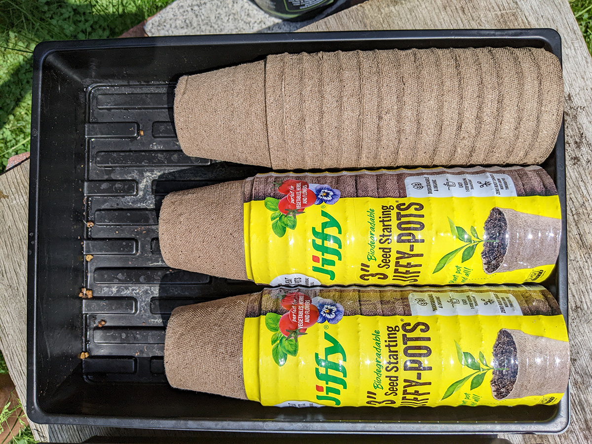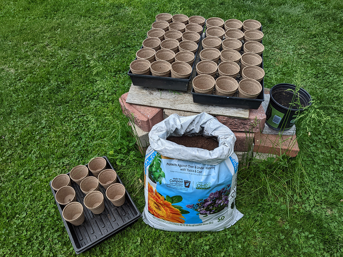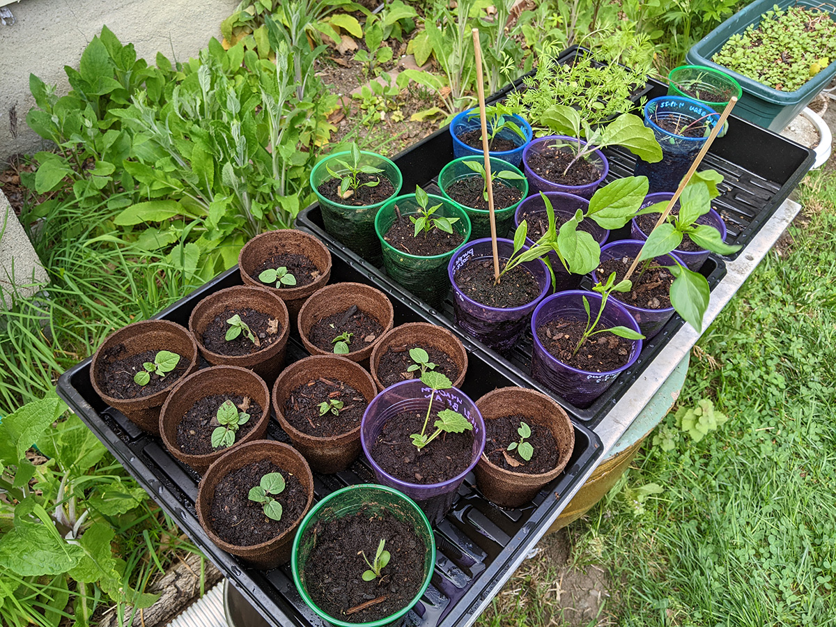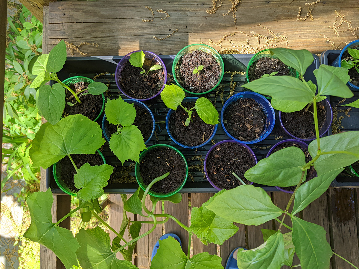 i started my morning with a check of my seedlings on the backyard porch. the neighbor's large oak tree is currently shedding catkins and my plants were buried in them. i'm hoping to move my plants this week to the community garden. i did some math, trying to figure out how many grow bags i need. i currently have 5 existing grow bags in my garden, but i need at least one more: 2 regular tomatoes, 1 cherry tomatoes, 2 eggplants, 1 ground cherry. i probably also need another bag to grow 4 small hot pepper plants.