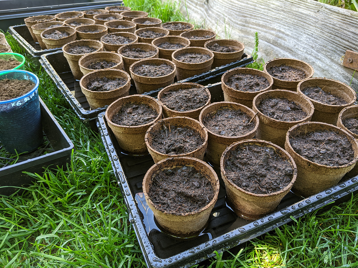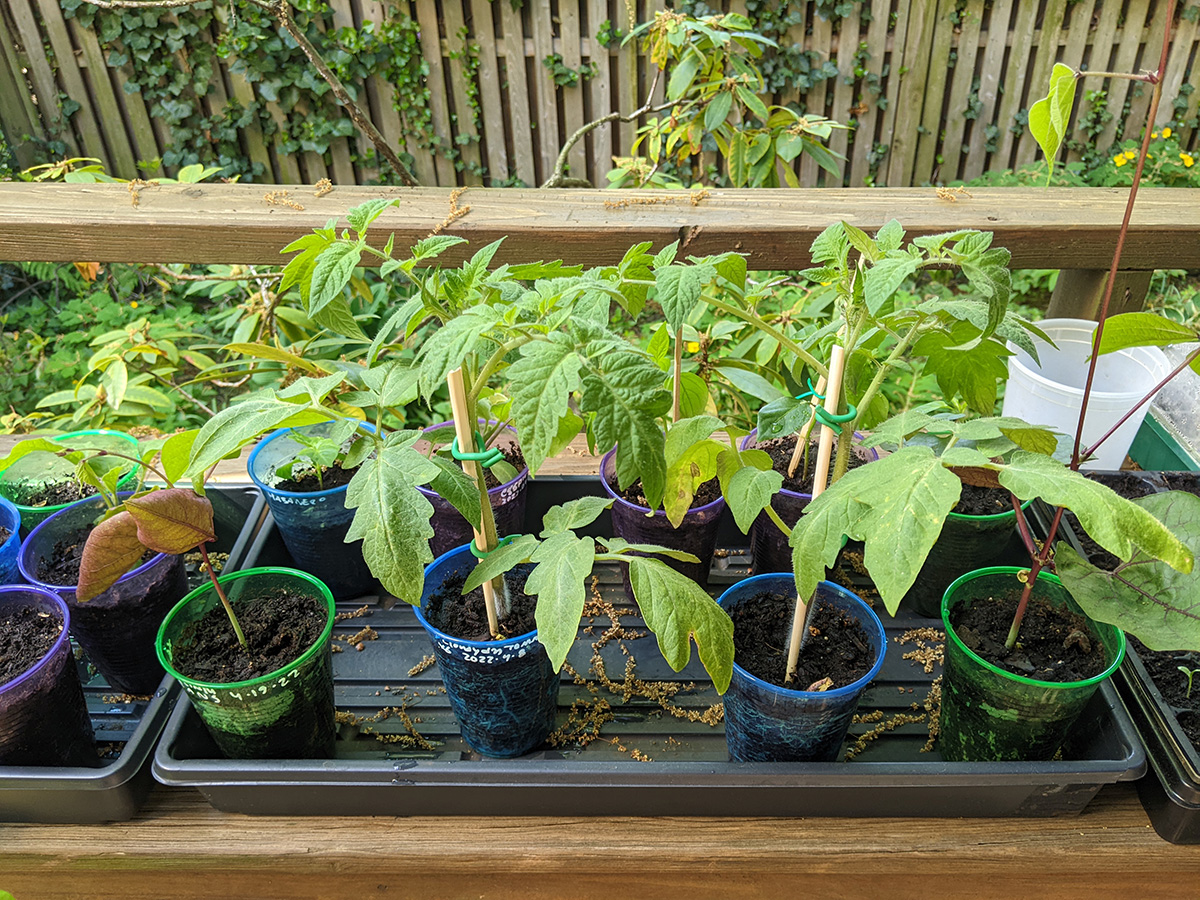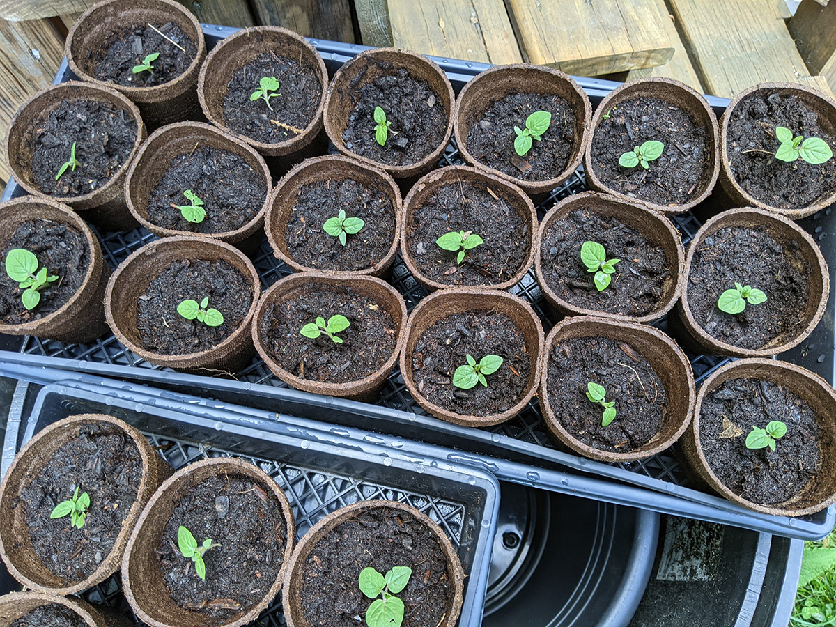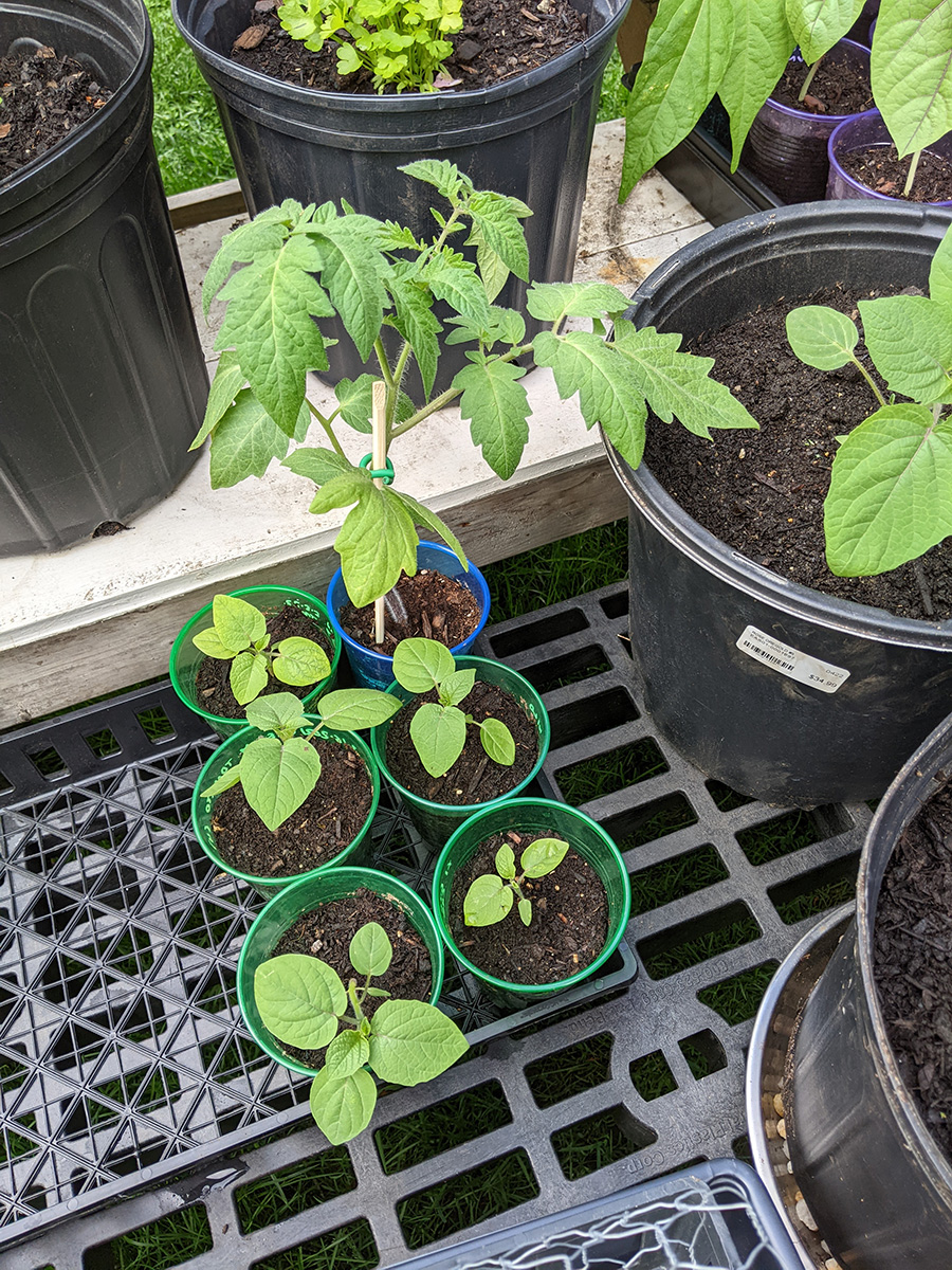 i started my morning with a check of my seedlings on the backyard porch. the neighbor's large oak tree is currently shedding catkins and my plants were buried in them. i'm hoping to move my plants this week to the community garden. i did some math, trying to figure out how many grow bags i need. i currently have 5 existing grow bags in my garden, but i need at least one more: 2 regular tomatoes, 1 cherry tomatoes, 2 eggplants, 1 ground cherry. i probably also need another bag to grow 4 small hot pepper plants.