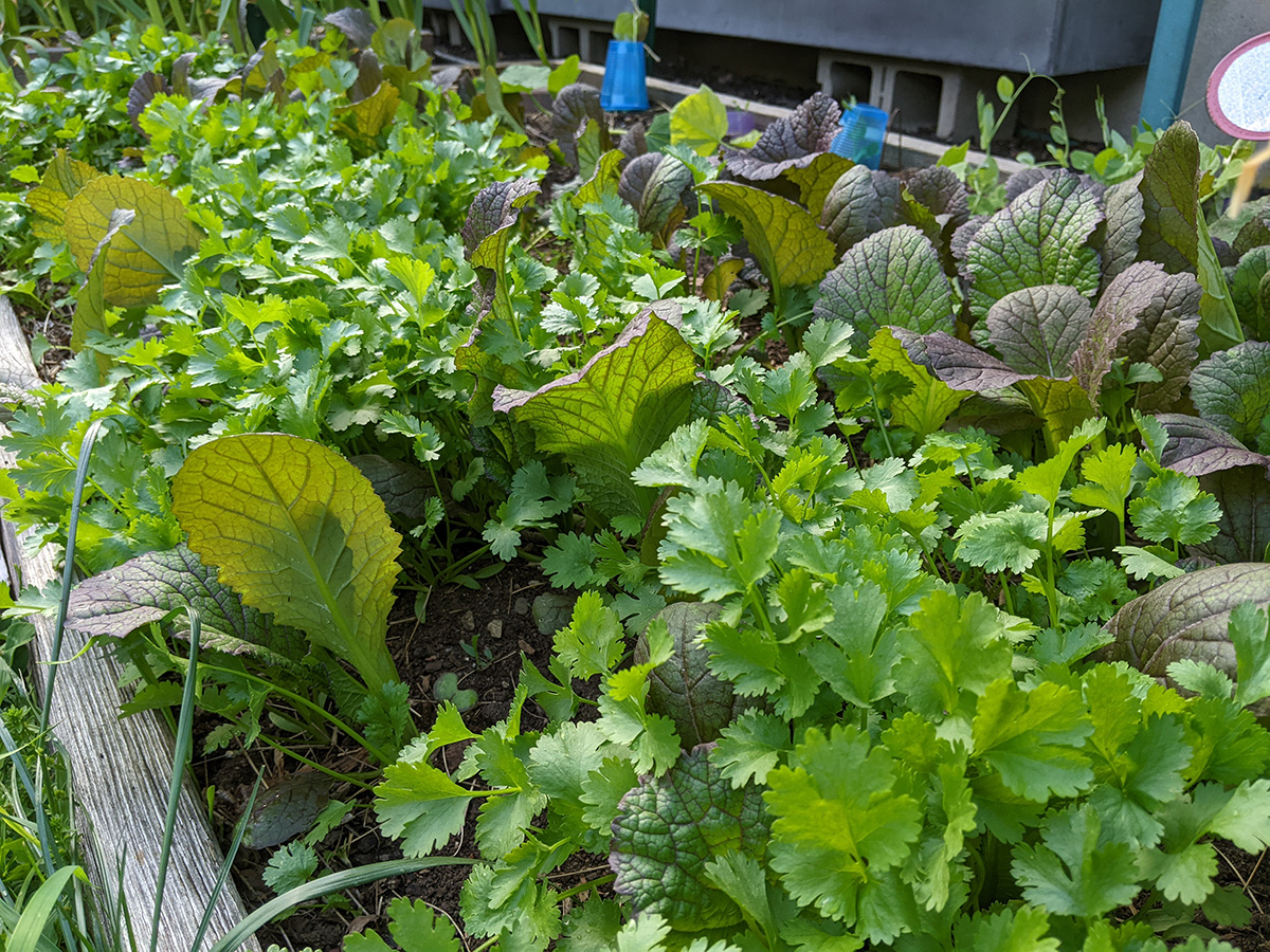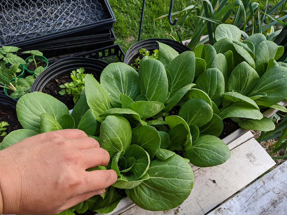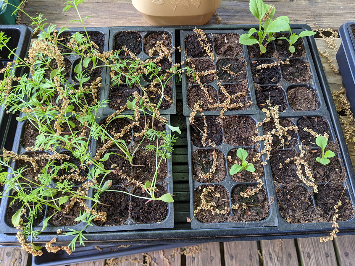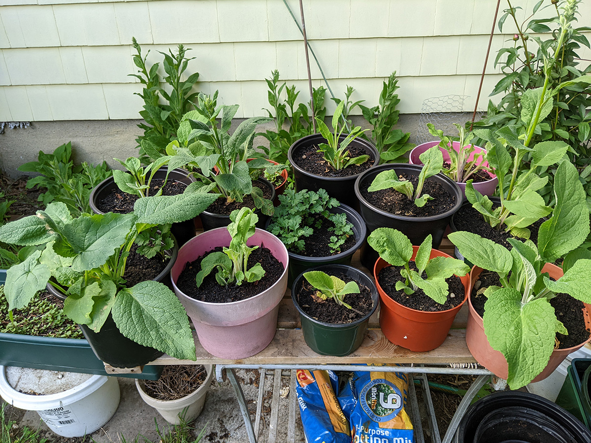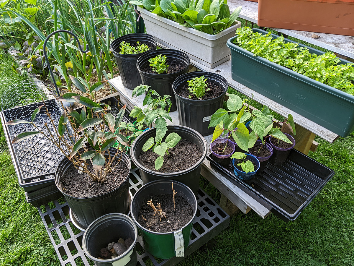 i started my morning with a check of my seedlings on the backyard porch. the neighbor's large oak tree is currently shedding catkins and my plants were buried in them. i'm hoping to move my plants this week to the community garden. i did some math, trying to figure out how many grow bags i need. i currently have 5 existing grow bags in my garden, but i need at least one more: 2 regular tomatoes, 1 cherry tomatoes, 2 eggplants, 1 ground cherry. i probably also need another bag to grow 4 small hot pepper plants.