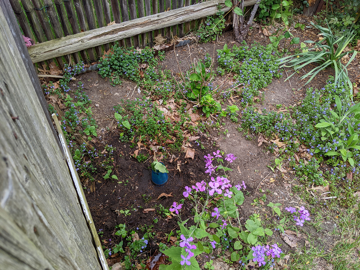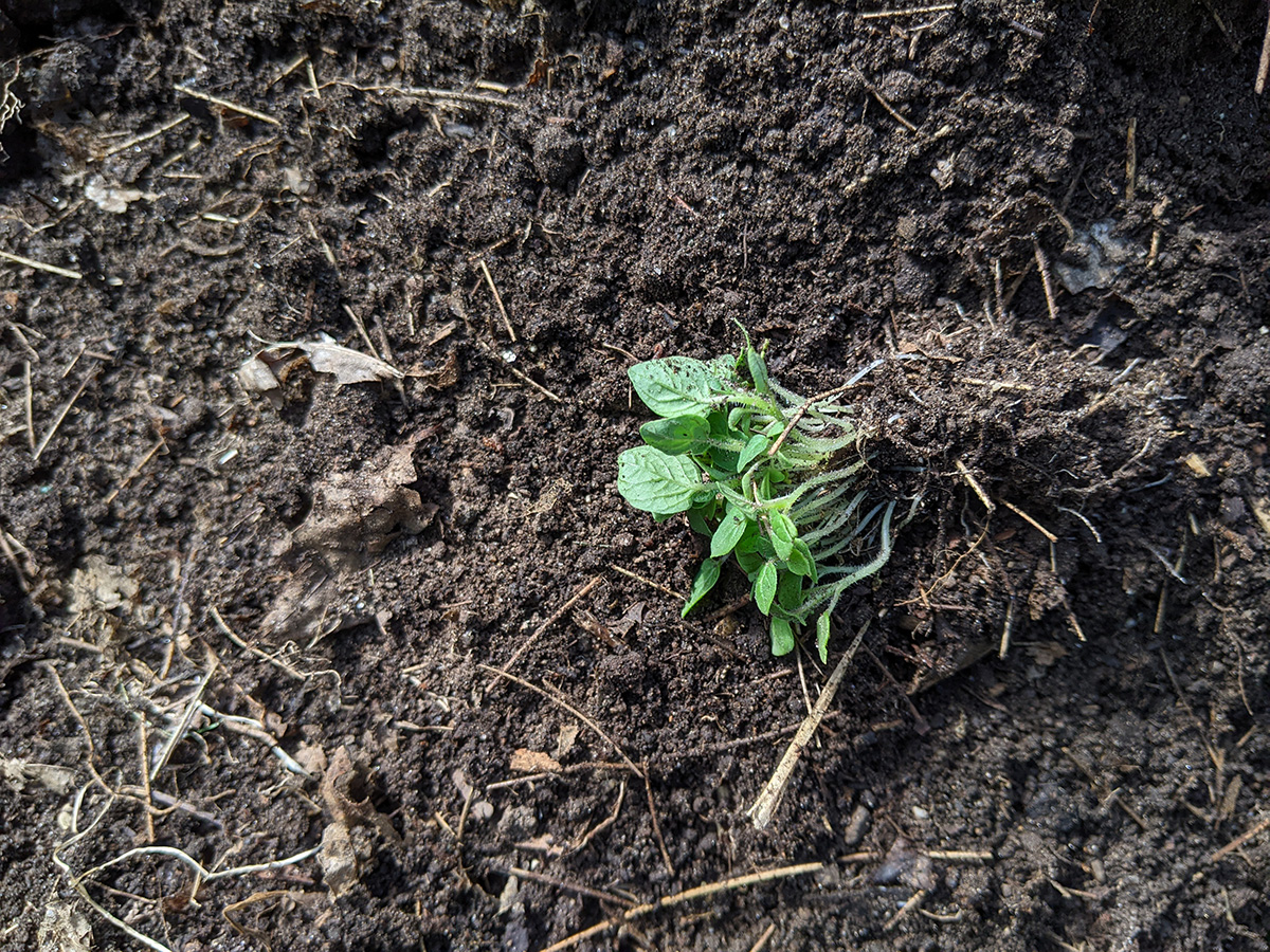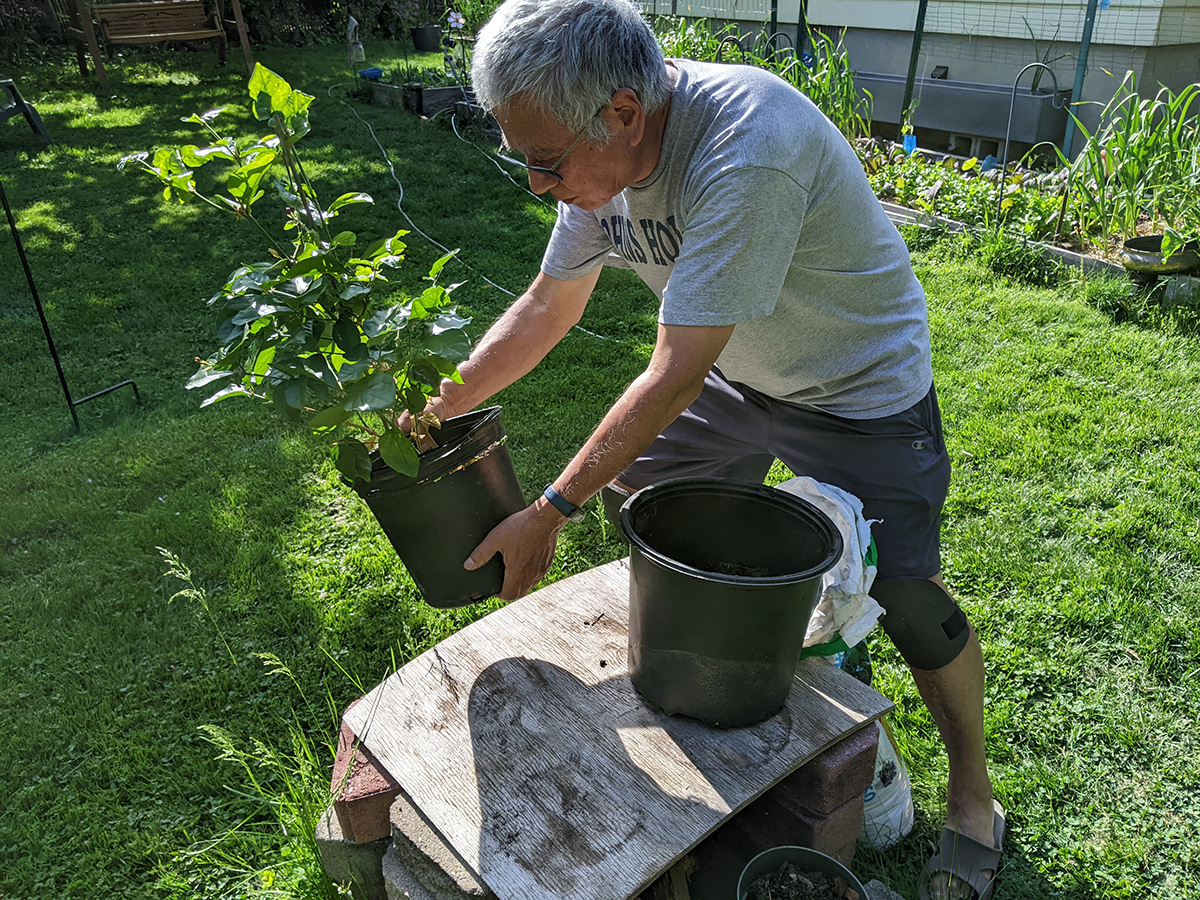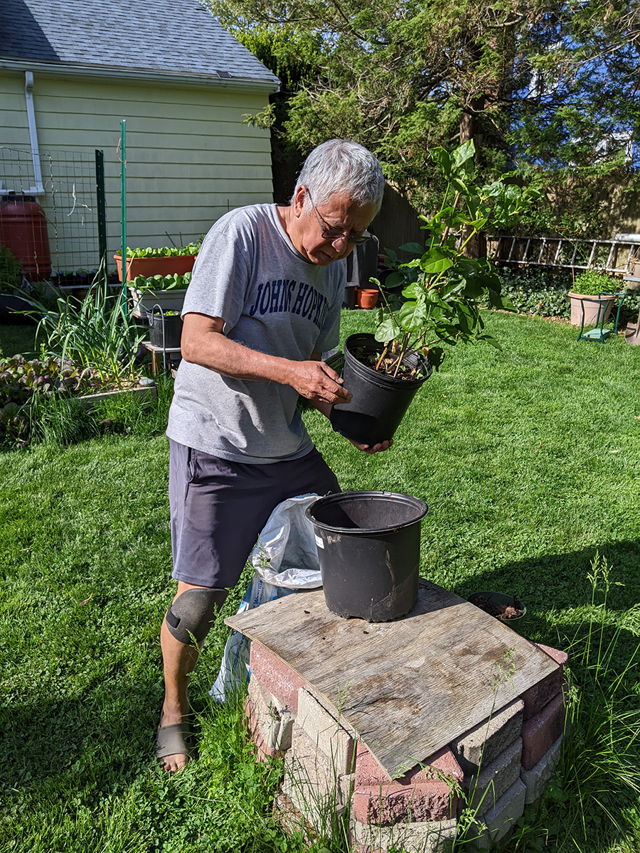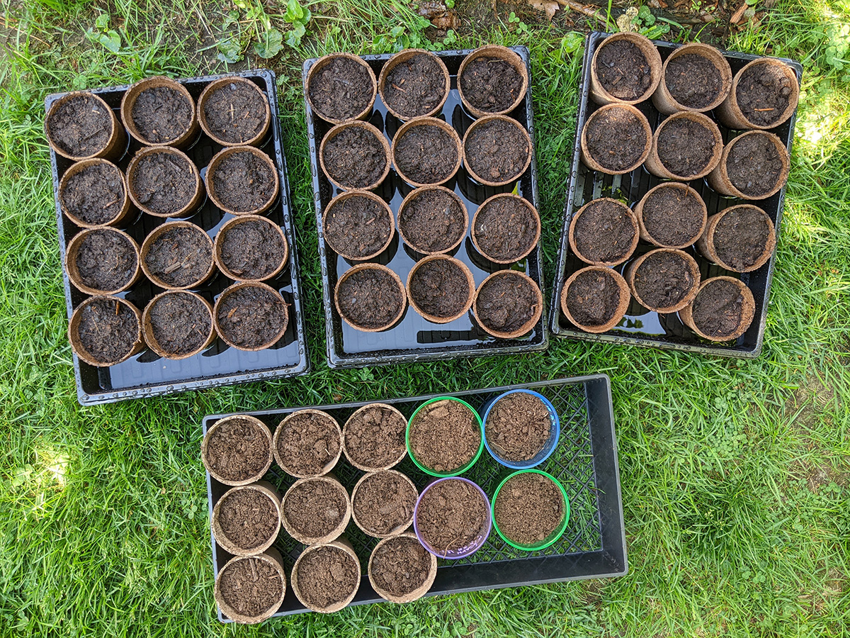 while my father went to go take a nap, i was busy in the backyard filling up the 45 jiffy pots with organic miracle-gro potting soil and soaking them in water. i felted some itchiness on my ankle that i thought was just dry skin but when i looked down it was a mosquito. are they back already? made me want to go back to wearing pants again. later my father came out to help me dig out the fattest ground cherry seedlings from RB4 and transplant them into the jiffy pots. once these a little bigger, we'll give them away for free for cafe customers.