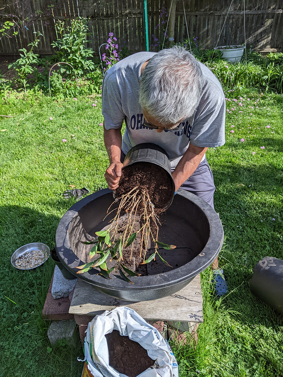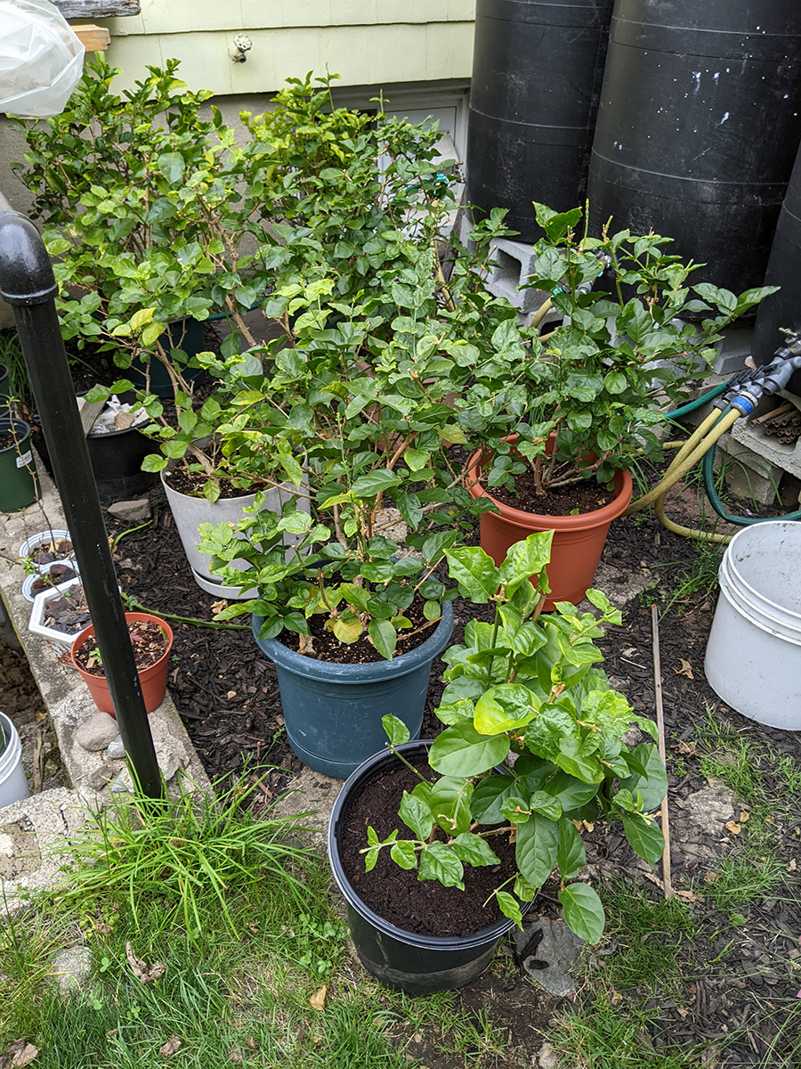 we repotted 2 plants: a jasmine and the fudingzhu osmanthus. the jasmine was in a pot that was disintegrating, we moved it into one of the larger heavy duty pots i found a few days ago. i filled the bottom with some grass/leave compost and the rest with cambridge city compost. as for the osmanthus, this was either the 3rd or 4th time we repotted. my father went with an all-compost medium this time, but when he watered it afterwards, it didn't seem to be draining that well, even though the compost itself seemed very good at draining. we also planted a single ground cherry plant in a heavy duty pot, half grass/leave compost, half city compost. that one seemed to drain better, maybe a mulch/compost bottom is the way to go?
