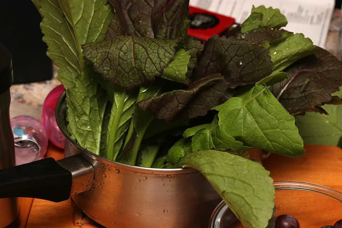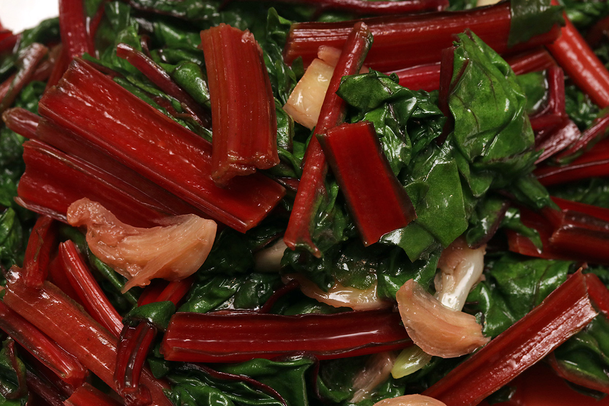 my mother hasn't cooked at all since returning from taiwan (other than the wonton soup yesterday), relying on my father instead. tonight he stir-fried some swiss chard i bought last week and cooked up some smoked kielbasa sausages. we've never had swiss chard before, always seen it at super markets and thought it looked pretty with its red-orange-yellow stems. the ones we cooked up had mostly red stems, and the juice was red as well. it reminded me of beets, and it tasted like beets as well, had that earthy flavor. it didn't surprise me that chards and beets are in the same family, and chards are also called leafy beets. supposed swiss chards have a bitter taste when eaten raw but loses it after cooking.