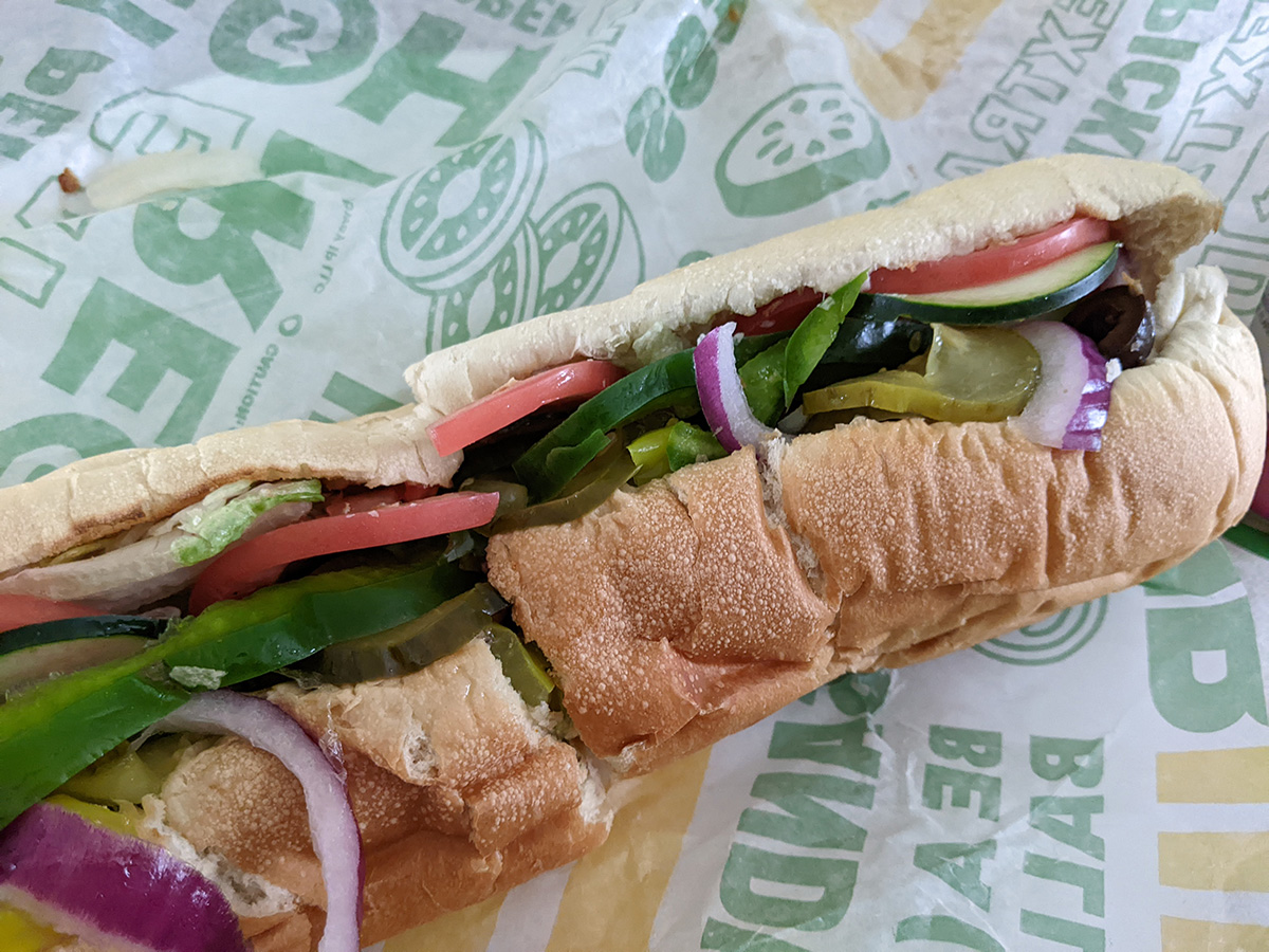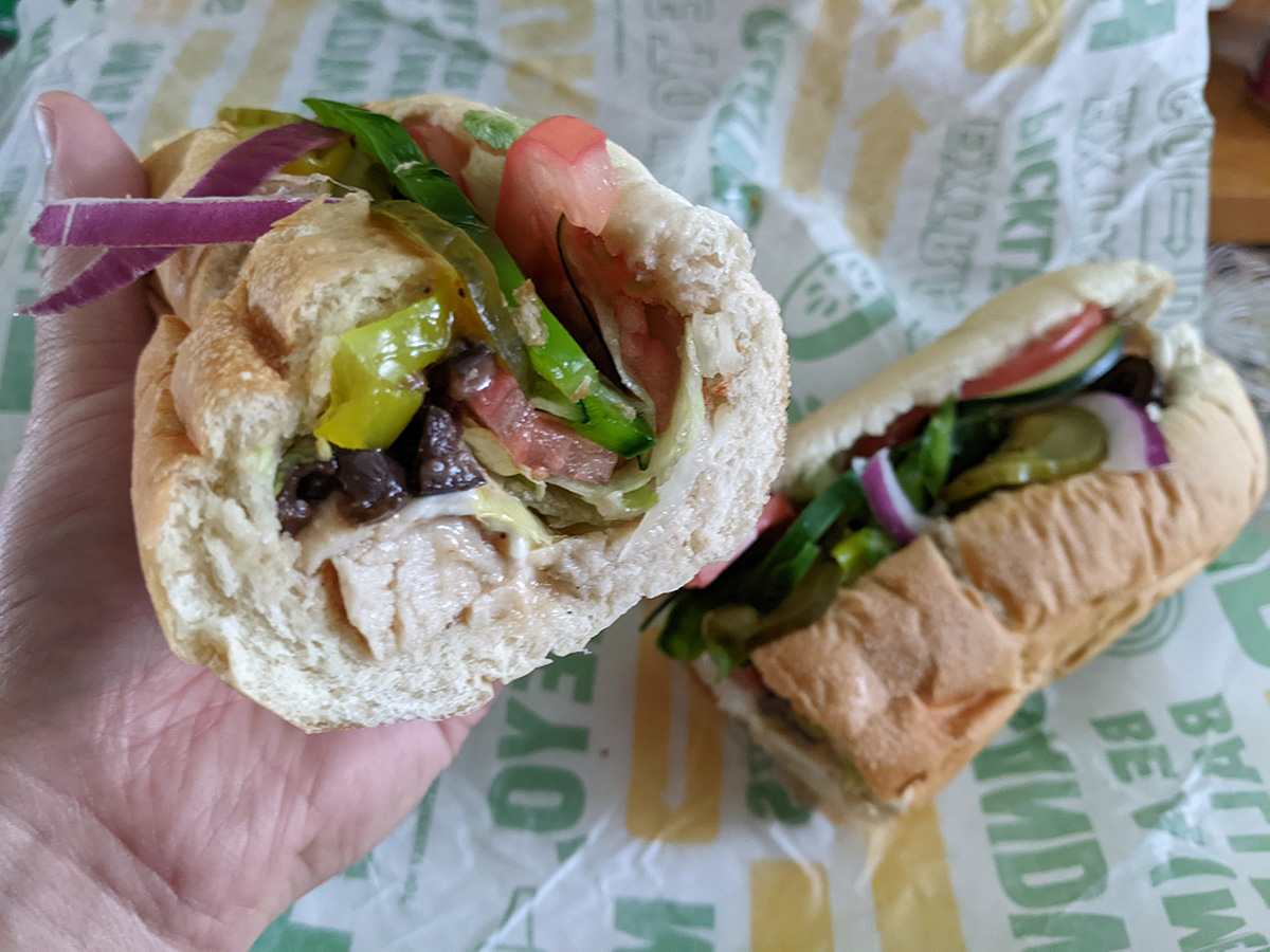 we left OSJL empty-handed, but we did go next door and get two subway subs. this store doesn't take coupons, so we paid the full price, which is about $10 for a foot-long sandwich. we got teriyaki onion chicken and their new teriyaki onion steak. the store's been there for a while, but the owners looked new, and they were a little slow with the order, like they were still figuring things out. i noticed on their back counter 3 different delivery apps running off of three different tablets: doordash, uber eats, and grubhub. the grubhub looked especially familiar since that's the same one we have.