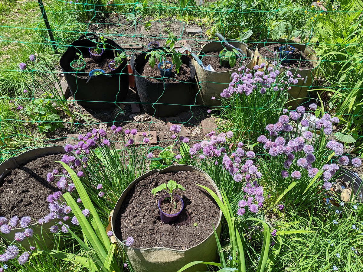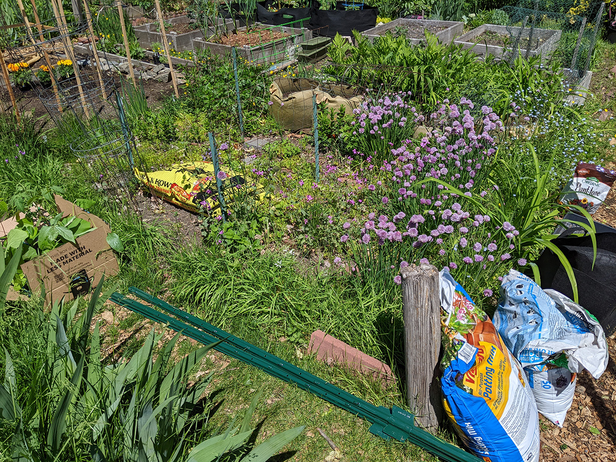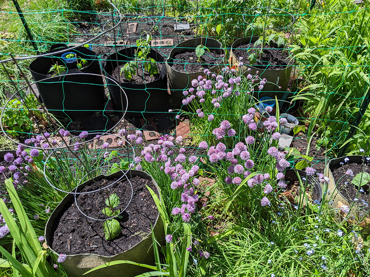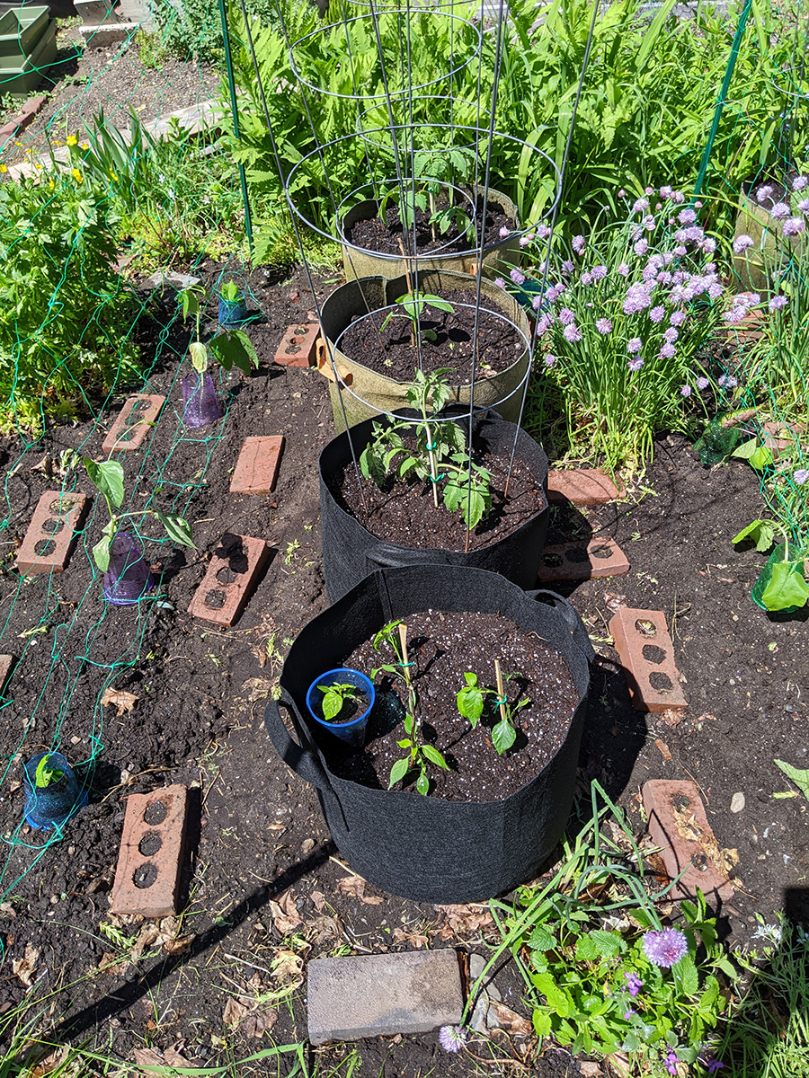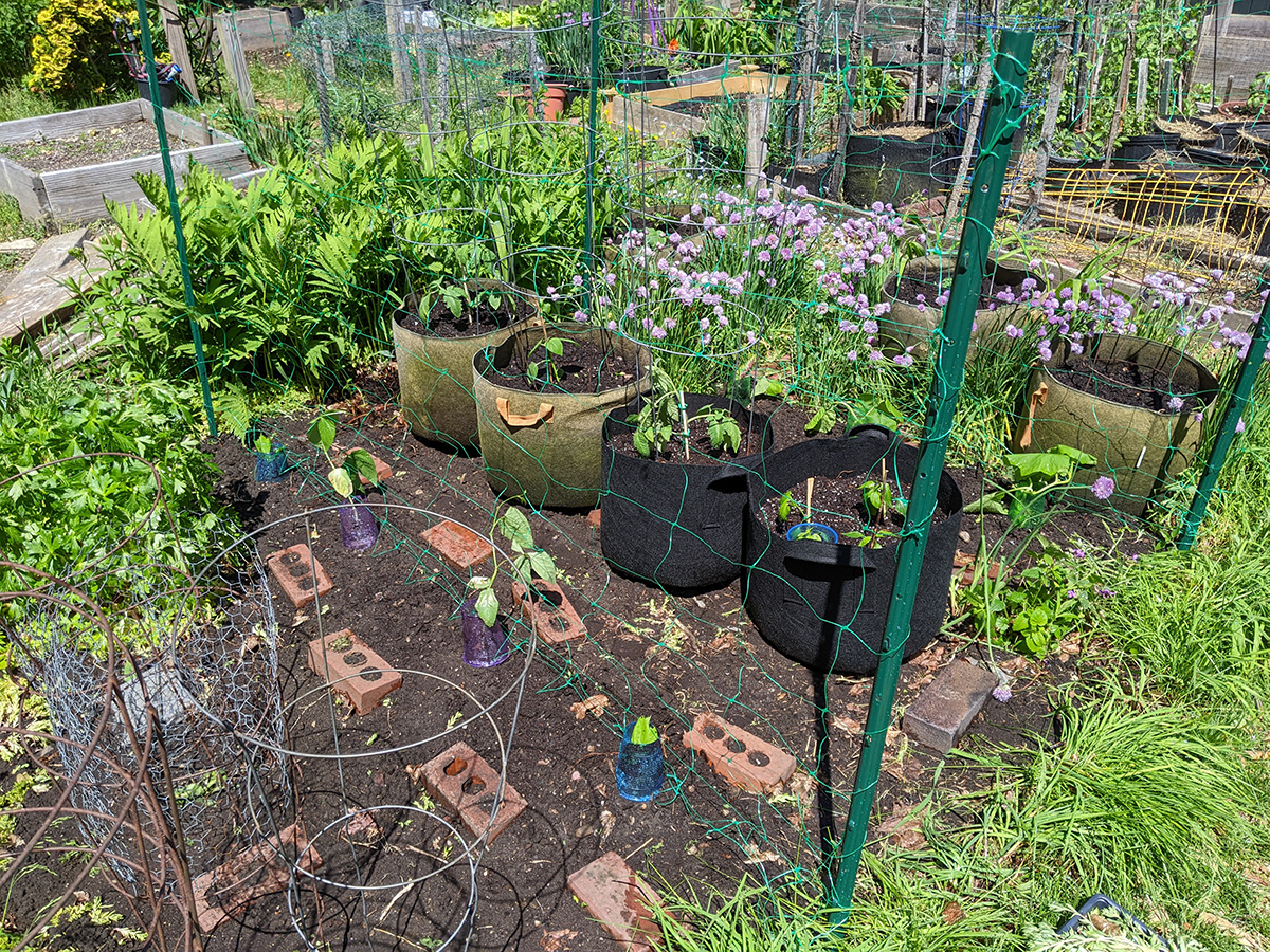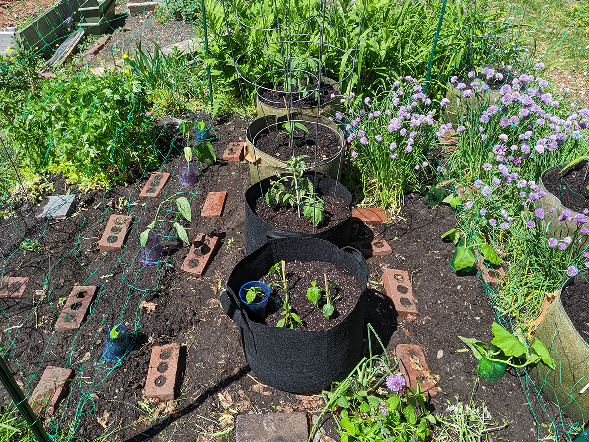 i got to the community garden by 11:20am. i spent the next 3 hours terraforming my plot. i tilled the soil and got rid of all the wild sedum, mint, grass, and some other random plants. i also pulled up the money plants, there flowers were mostly spent already, and if i wanted more there's plenty in my parents' backyard. i pulled up the old posts and wire trellis, and installed new 5ft tall u-posts. not only did i install my trellises vertically, but i also realigned my grow bags so they were vertical as well, allowing me to further extend the trellis by 1-1/2 ft. i hooked the plastic trellis netting onto the posts. it's supposed to be 5x60ft, but they were more like 7-8ft tall. they're not the best trellis material - especially after having used wire trellises - but they were sturdy enough and seem like they could last a few seasons, despite being delicate looking.