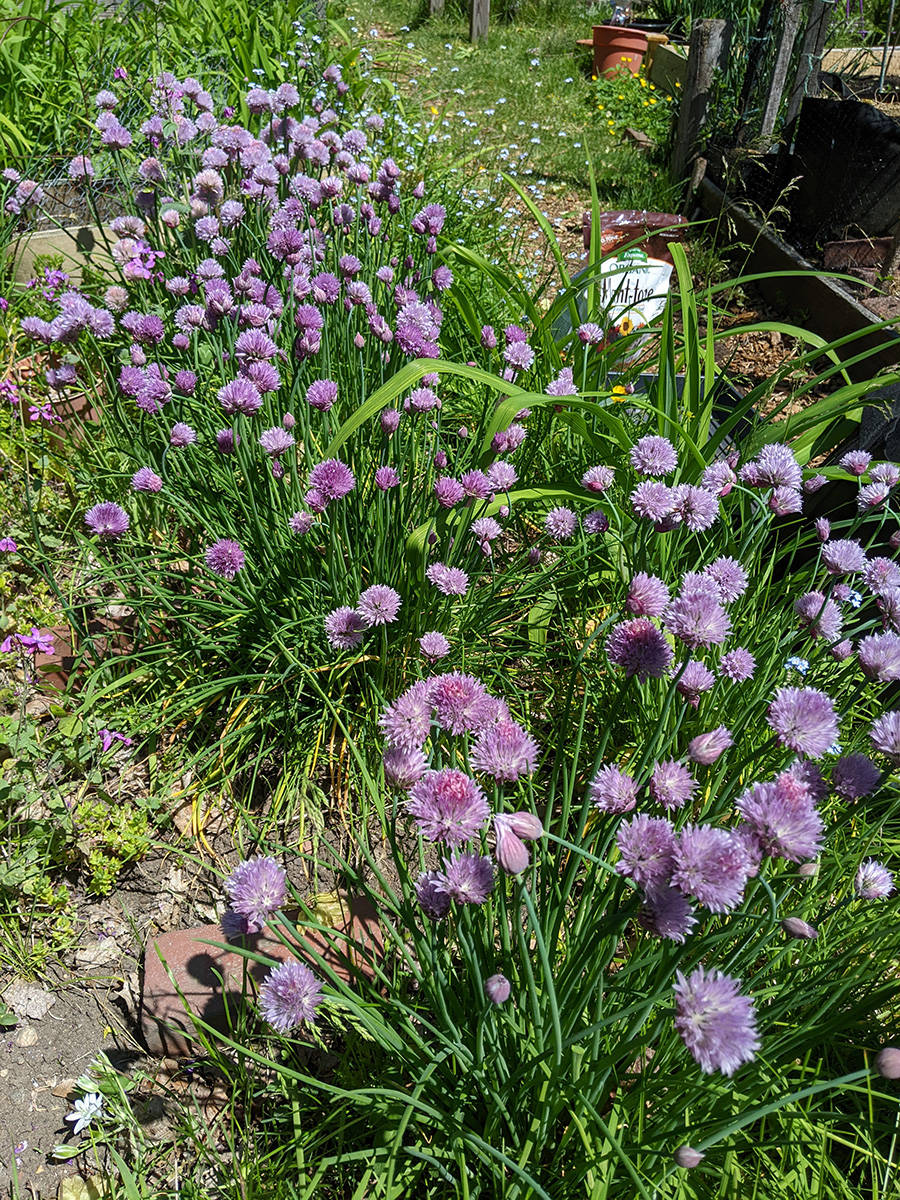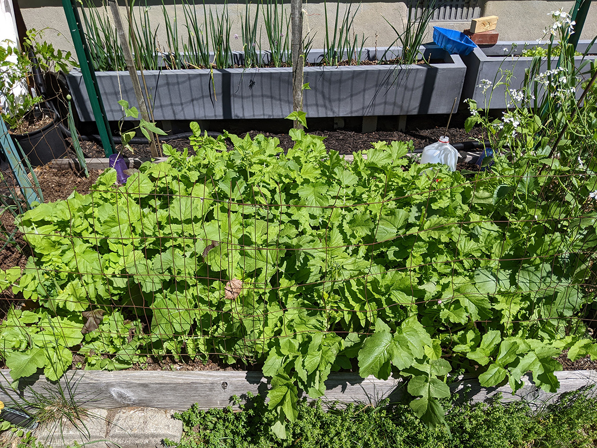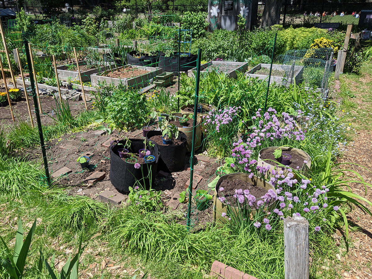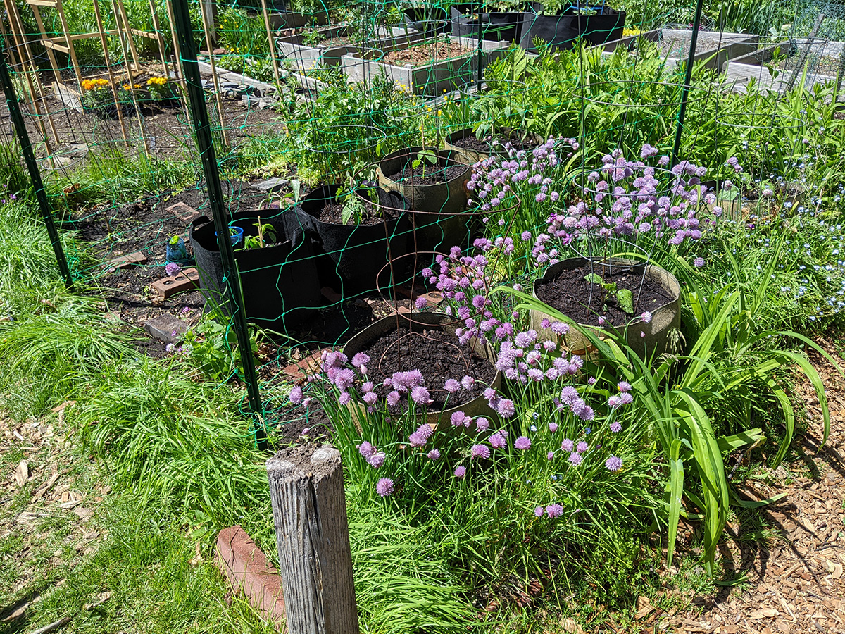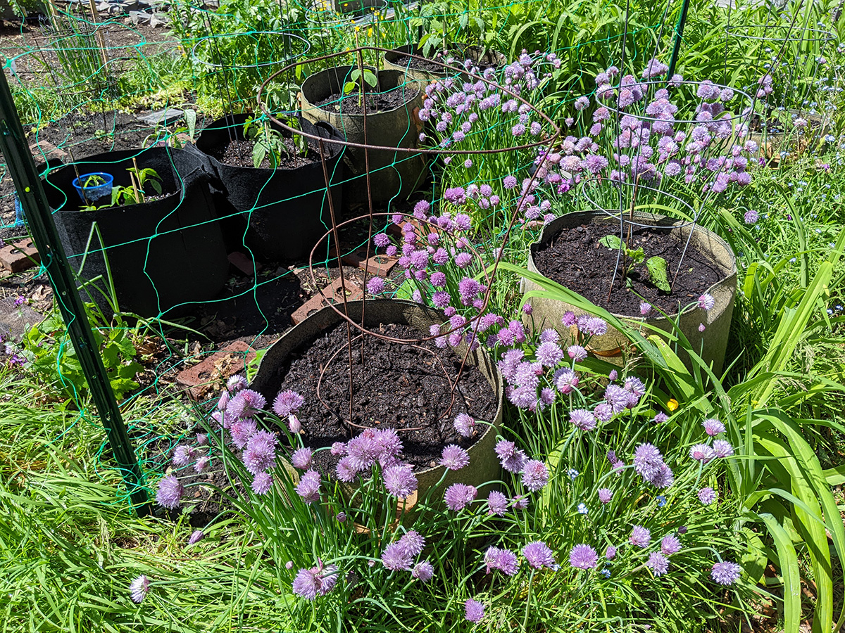 i got to the community garden by 11:20am. i spent the next 3 hours terraforming my plot. i tilled the soil and got rid of all the wild sedum, mint, grass, and some other random plants. i also pulled up the money plants, there flowers were mostly spent already, and if i wanted more there's plenty in my parents' backyard. i pulled up the old posts and wire trellis, and installed new 5ft tall u-posts. not only did i install my trellises vertically, but i also realigned my grow bags so they were vertical as well, allowing me to further extend the trellis by 1-1/2 ft. i hooked the plastic trellis netting onto the posts. it's supposed to be 5x60ft, but they were more like 7-8ft tall. they're not the best trellis material - especially after having used wire trellises - but they were sturdy enough and seem like they could last a few seasons, despite being delicate looking.