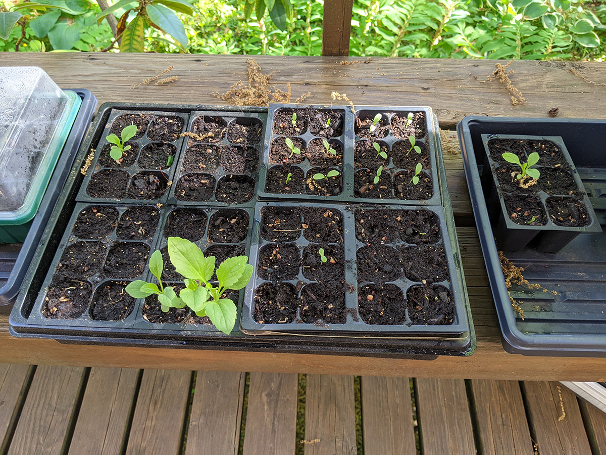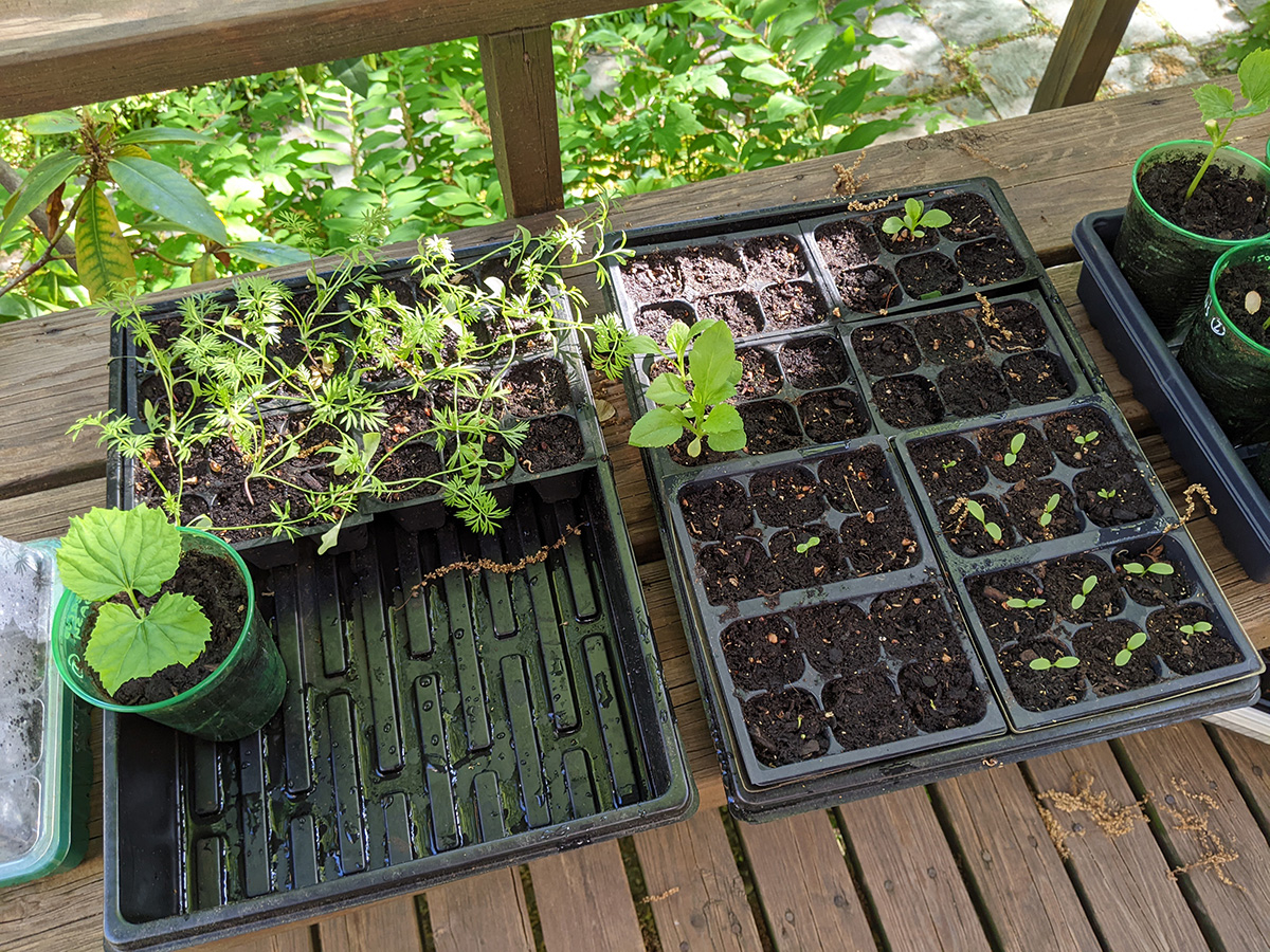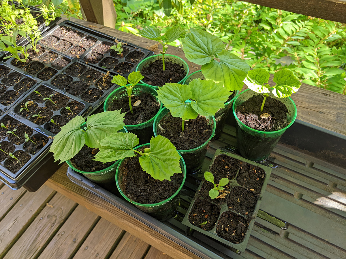 i added composted manure to the grow bags - 5 preexisting, 2 new - and filled the new grow bags with potting soil. i had just enough to fill them up. i relocated a stripe mallow and a foxglove to the eastern side of my plot, the side that gets the least amount of sun. finally i planted my seedlings, which were already starting to wilt from being out in the hot sun for so long. 2 tomatoes, 2 pingtung eggplants, 1 ground cherry, 2 hyacinth beans, 2 white bitter melons, 2 long beans, 2 buttercup squashes. i also planted 3 peppers into a single 10 gallon grow bag: 2 purple serrano and 1 thai hot. i didn't plant the habanero though, it'll either live in the ground or i find a pot for it. i also left a grow bag empty - future home for a cherry tomato (still germinating in my grow closet) - and enough empty space to add another bitter melon or two.