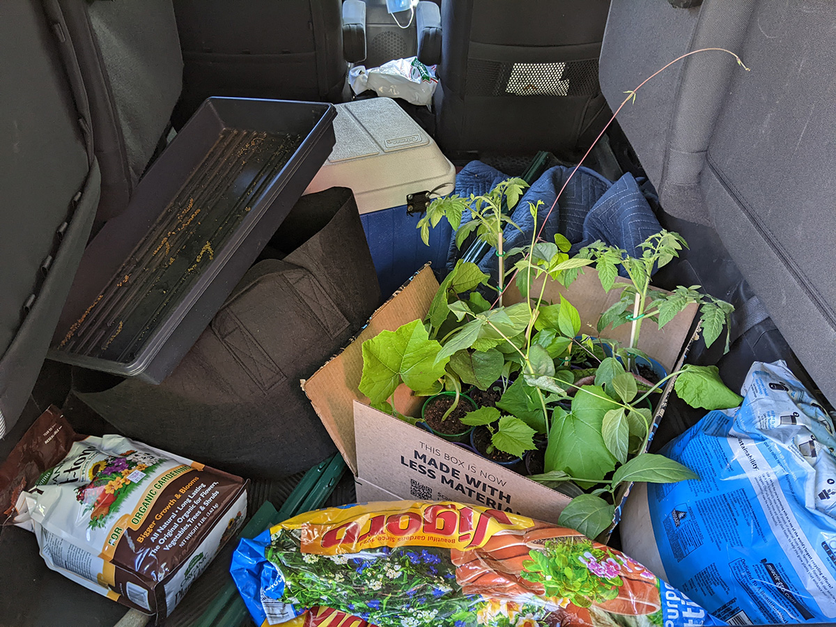 my mother asked me to help out at the cafe today but i already made plans to do a day of gardening. at 10am i biked down to my parents' place to pick up the car and grab some materials: 5ft u-posts, leftover bag of organic miracle-gro potting soil, mallet. i drove back to my place, where i loaded up my seedlings, grow bags, plastic trellis netting, parking permit, and new garden tool set (trowel and cultivator).