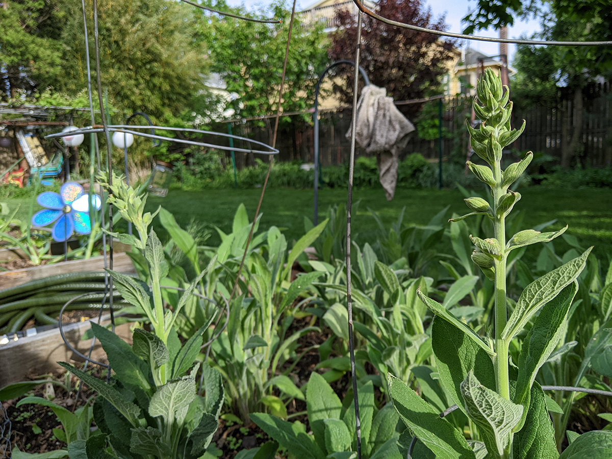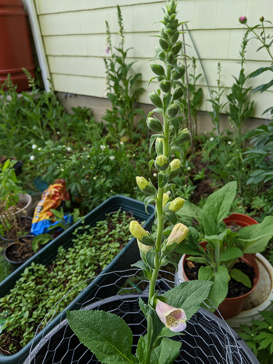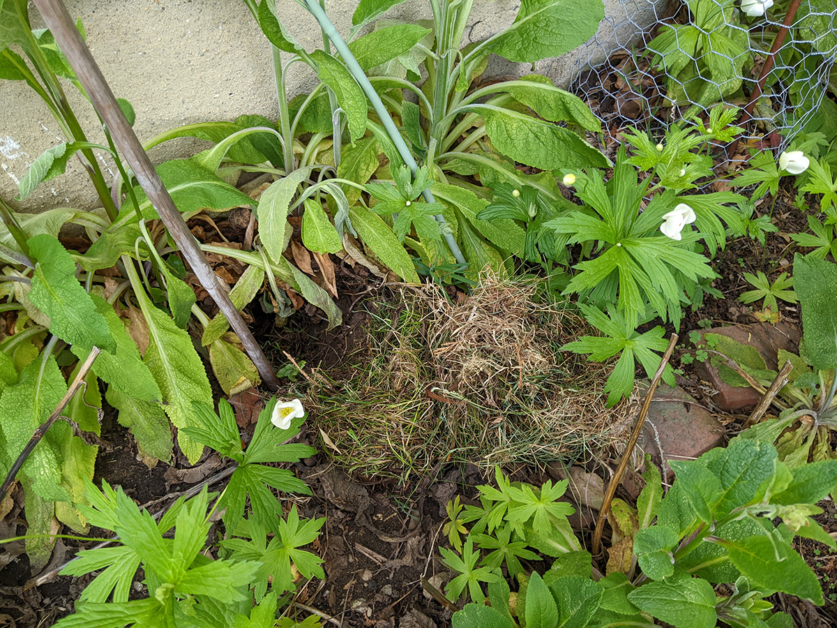 - speaking of rabbits, i found another rabbit nest in the backyard, behind the garage, underneath a foxglove plant. i dug it out to check nothing was inside then filled it up with soil. i can't tell if it's a new nest or an old one. i saw it when i was watering, noticed a clump of dead grass where there shouldn't have been any. it was filled with grass not fur, unlike the western perennial bed rabbit nest that actually had bunnies.