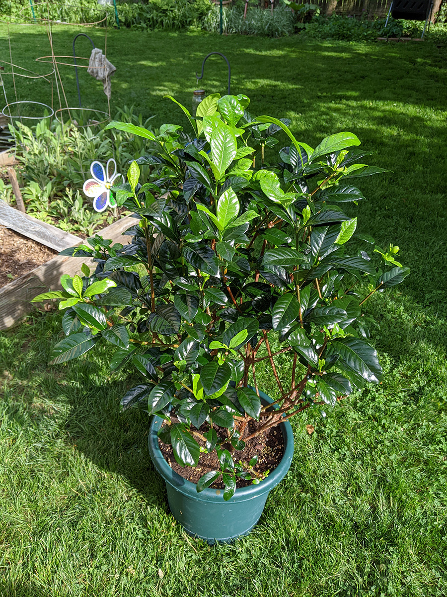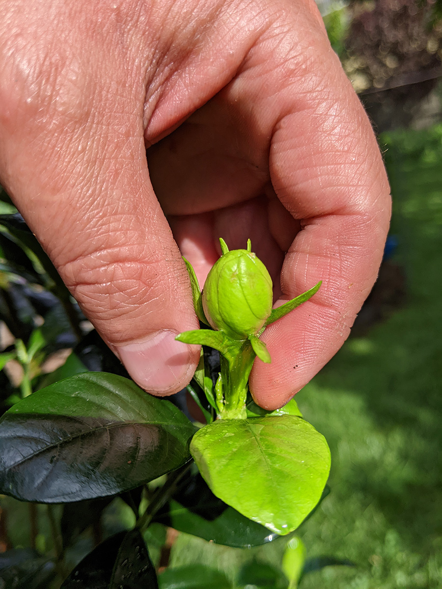 - i brought out the gardenia from the basement grow room and sprayed it with neem oil. there are just 2 flowerbuds. if we can get just one of them to bloom, it'll be a victory. the reason why we don't have more flowerbuds is my father cut off all the branches after watching a youtube video, not realizing that flowerbuds only grow on old branches. i also sprayed some of the jasmines, but for the most part, ever since i moved them outside, they've been pretty mealybug-free.