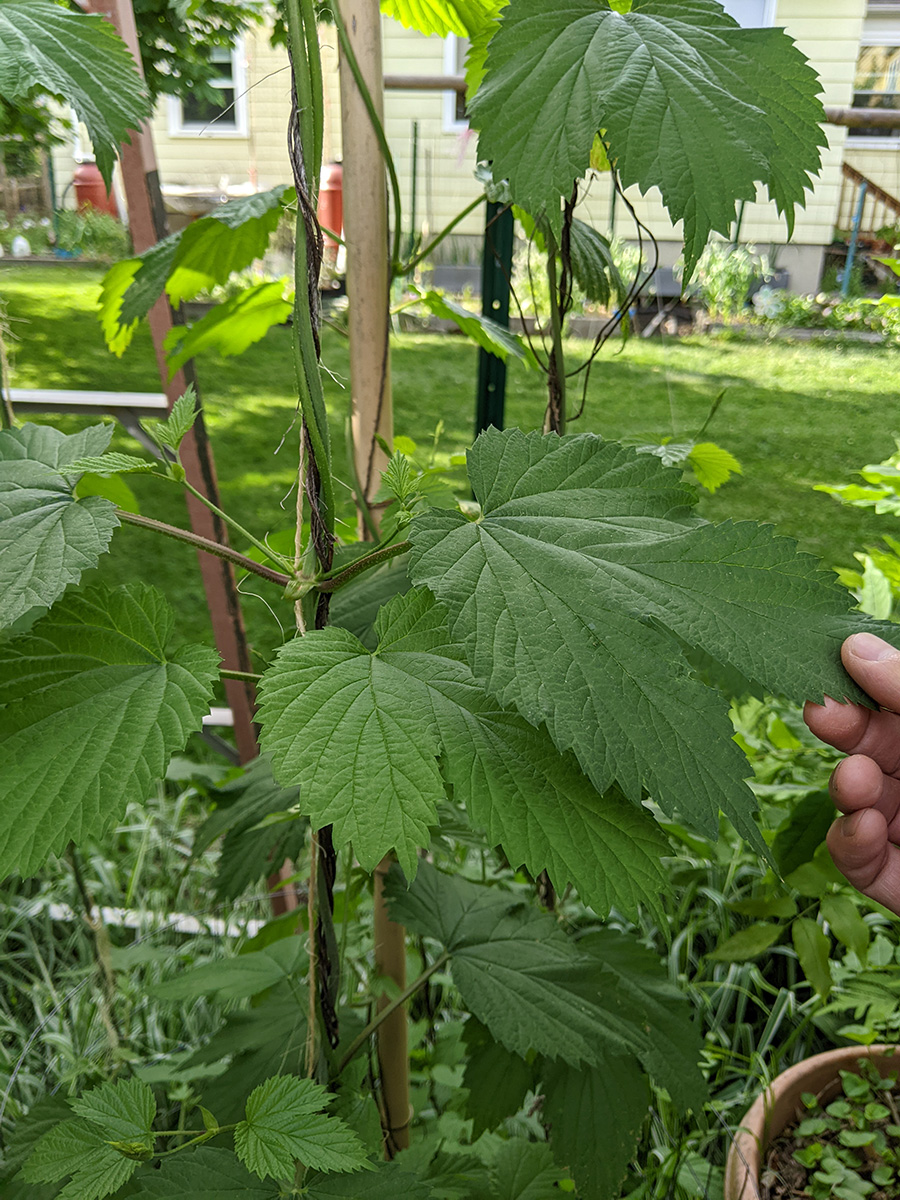 - i wrapped some newly-emerged hop bines onto the twines. new bines continue to emerge, i don't know if we should let them continue to grow or cut them so plant can focus all its energy on the existing bines.