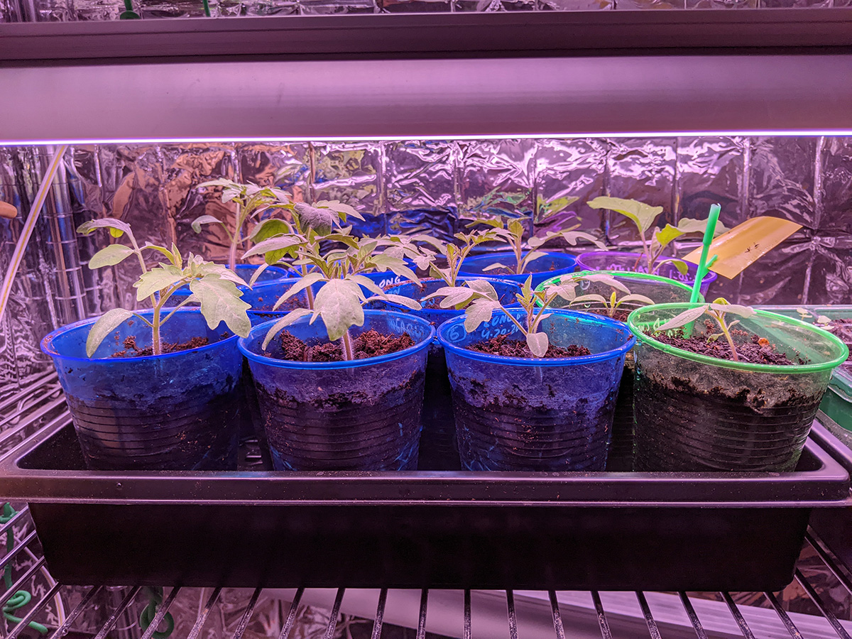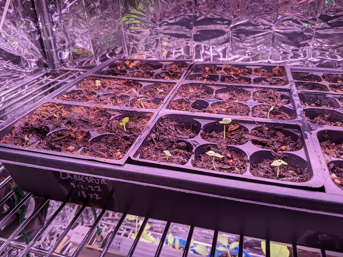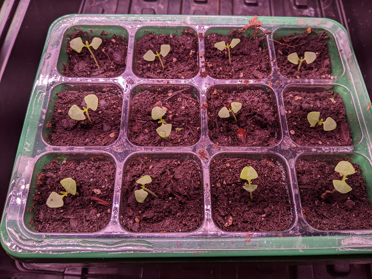 basil seeds have a high germination rate, despite being smaller than a grain of sand. all of my basil seeds sprouted, so much so that i had to thin some out this morning. i also made the round of watering all my remaining seedlings, both indoors and outdoors. i'll probably give my cherry tomatoes another week or so before starting to move them outside.
