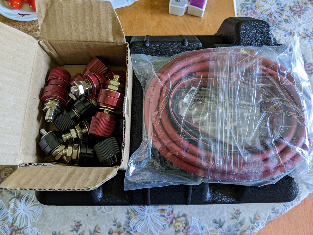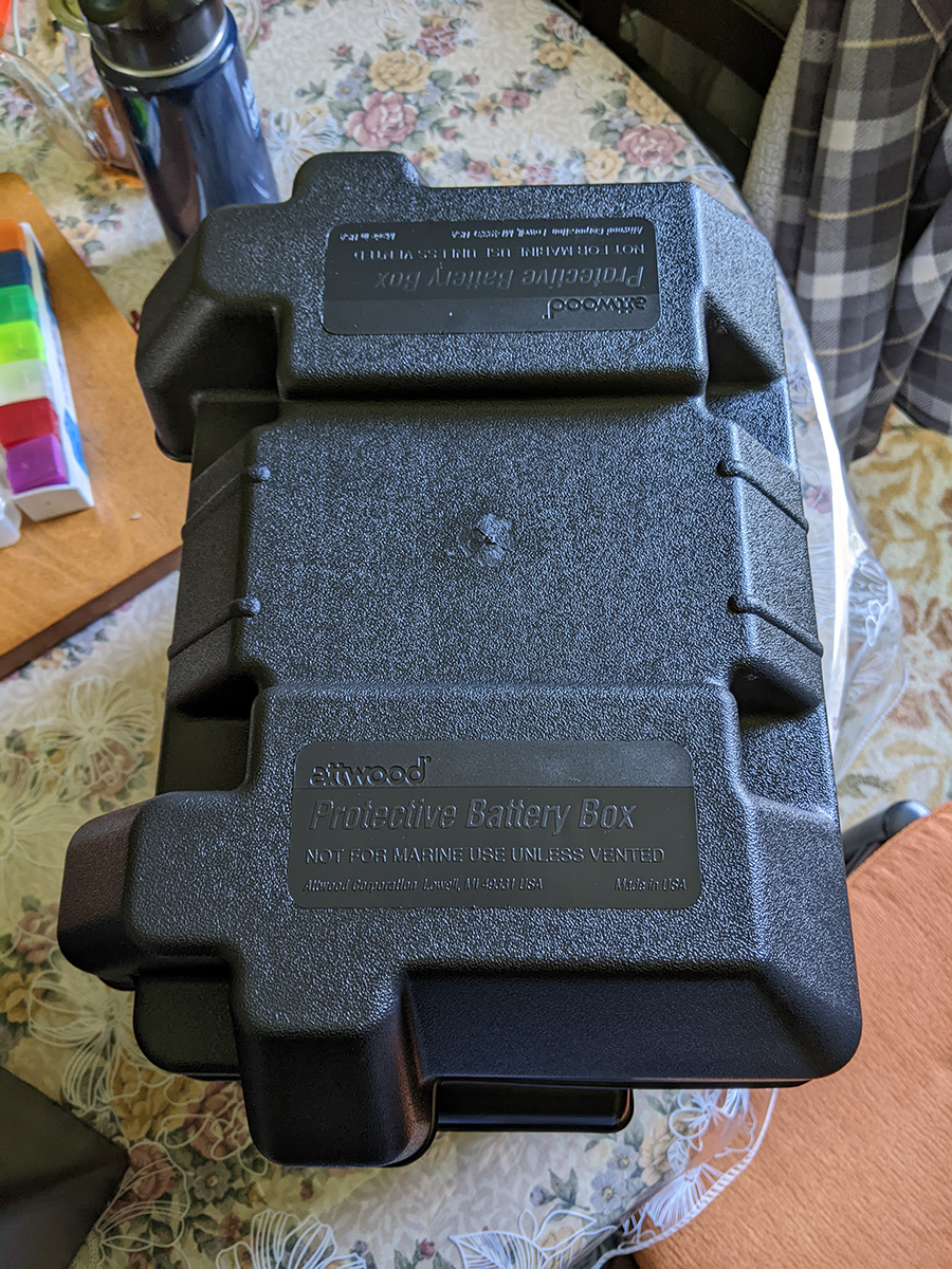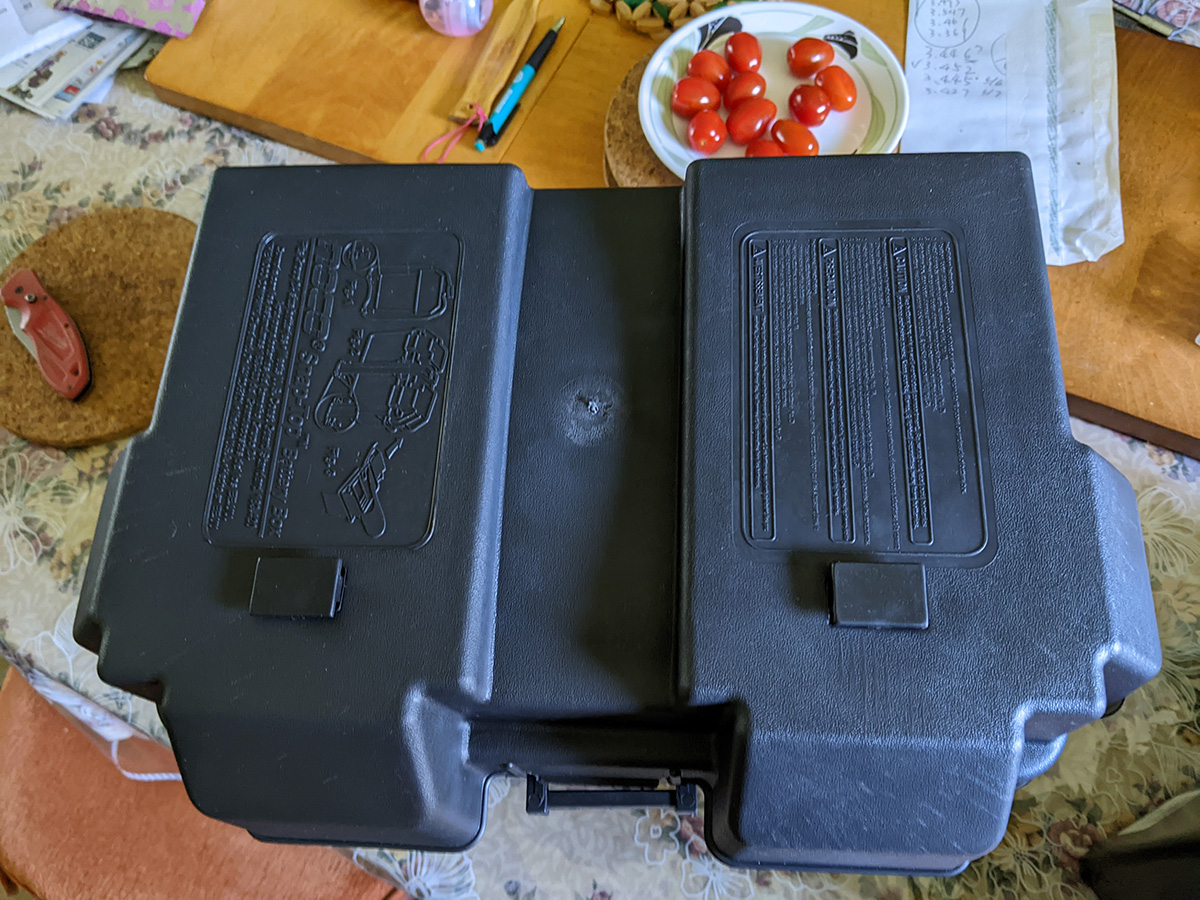 i went to my parents' place by 1:30pm. there were packages on the doorstep. one of the boxes was the 12-pack of heavy duty 2/3 size plastic growing trays ($28). i ordered them last thursday, they're only now arriving. i wasn't in any hurry, i got these for next season, in case i want to germinate some seeds at my parents' place. another box contained all the battery supplies we ordered a few days ago, including another plastic battery box, 6 gauge copper cables, and battery terminals. this particular box is better than the one we got earlier; i would've returned that one except my father already ripped off the sticker. anyway, this new box has a better design, including recessed areas on the lid for attaching battery terminals. i'm tempted to get another one of the same, since they don't cost too much ($10).