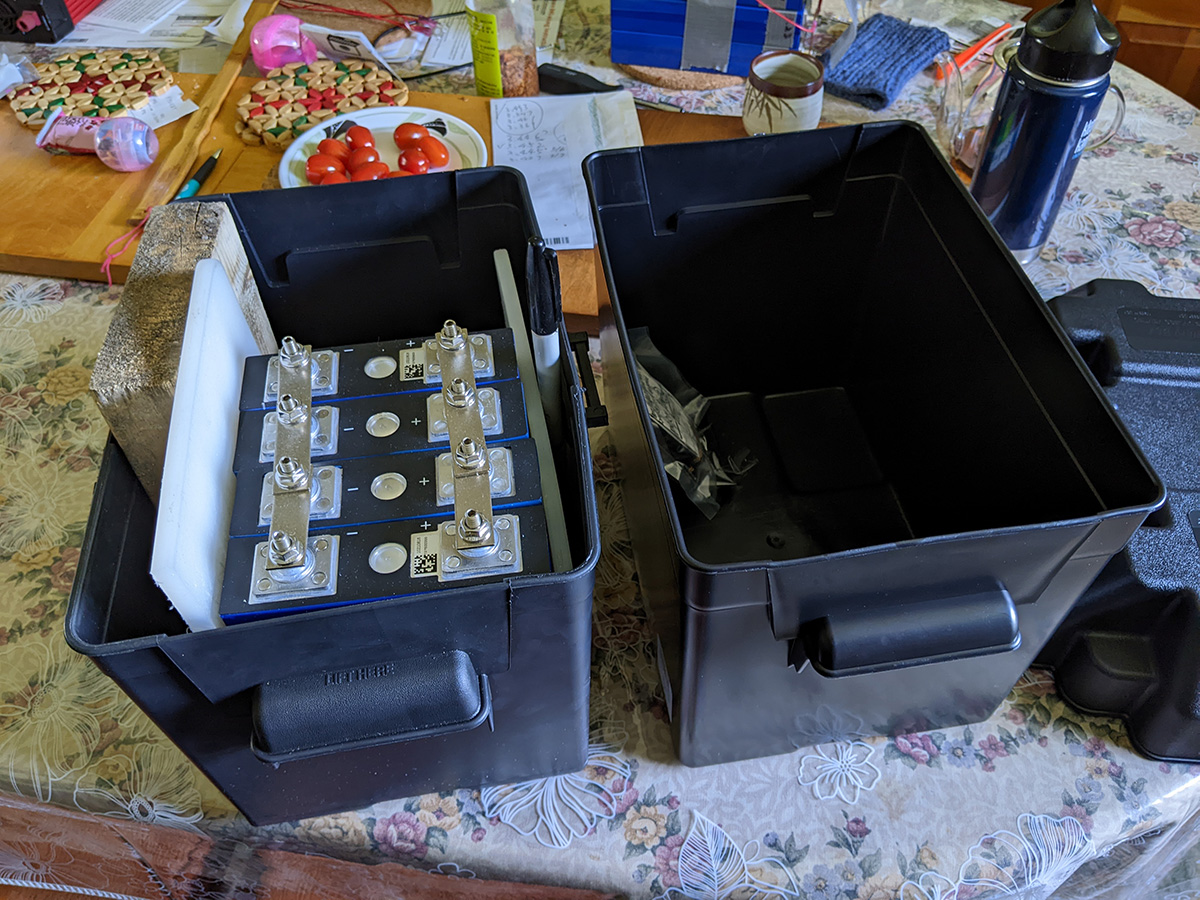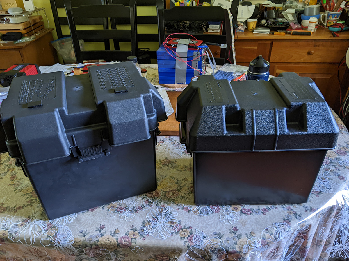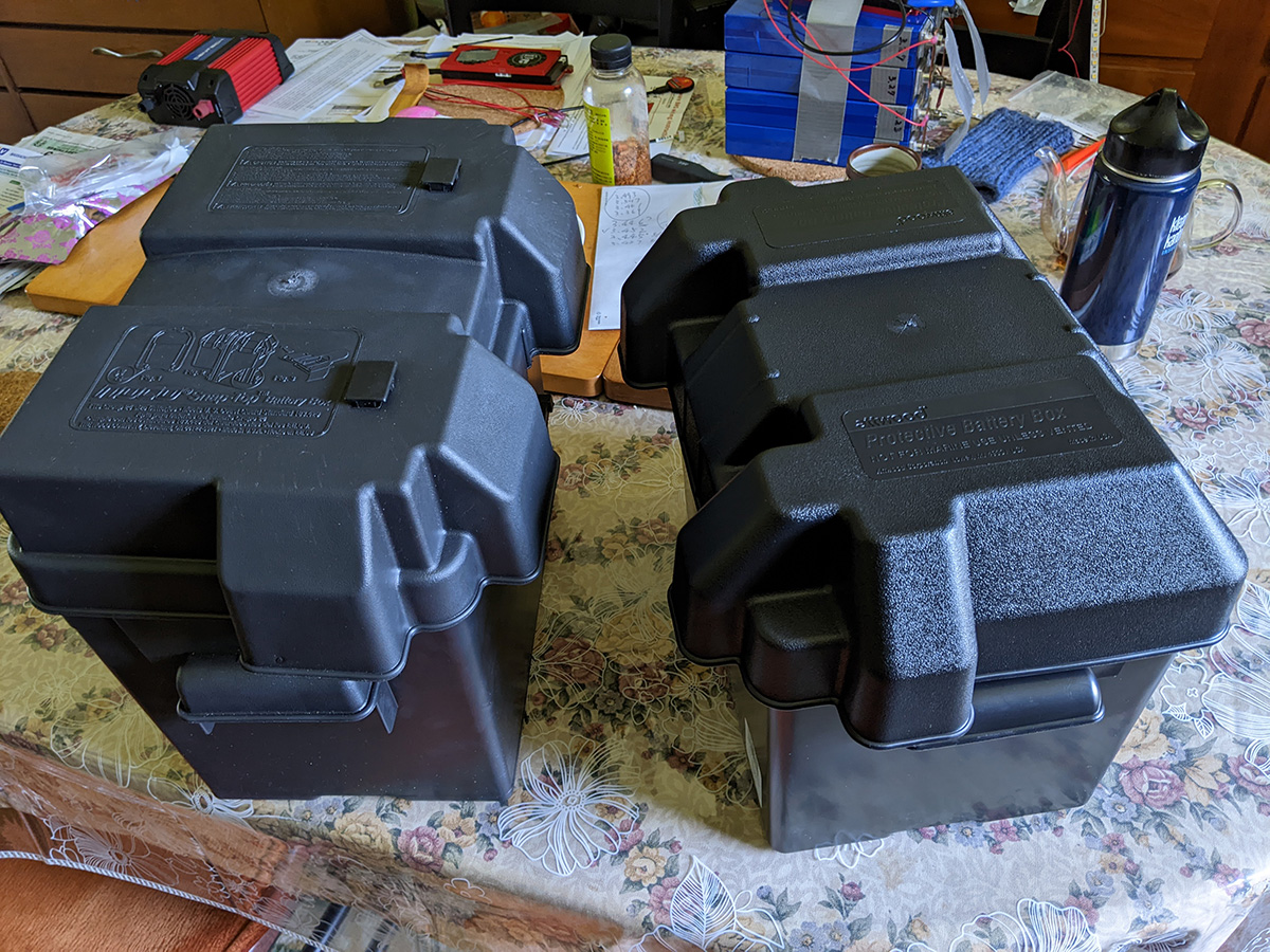 i went to my parents' place by 1:30pm. there were packages on the doorstep. one of the boxes was the 12-pack of heavy duty 2/3 size plastic growing trays ($28). i ordered them last thursday, they're only now arriving. i wasn't in any hurry, i got these for next season, in case i want to germinate some seeds at my parents' place. another box contained all the battery supplies we ordered a few days ago, including another plastic battery box, 6 gauge copper cables, and battery terminals. this particular box is better than the one we got earlier; i would've returned that one except my father already ripped off the sticker. anyway, this new box has a better design, including recessed areas on the lid for attaching battery terminals. i'm tempted to get another one of the same, since they don't cost too much ($10).