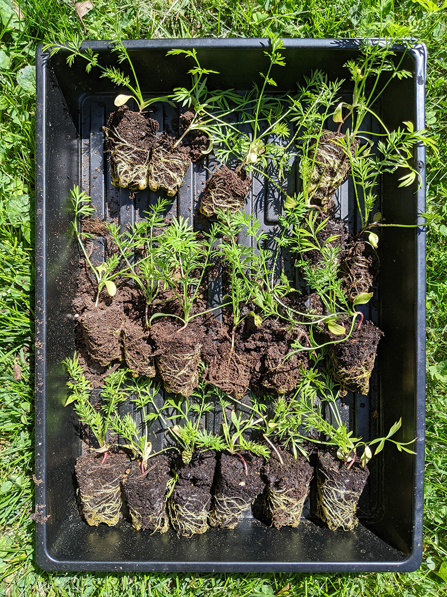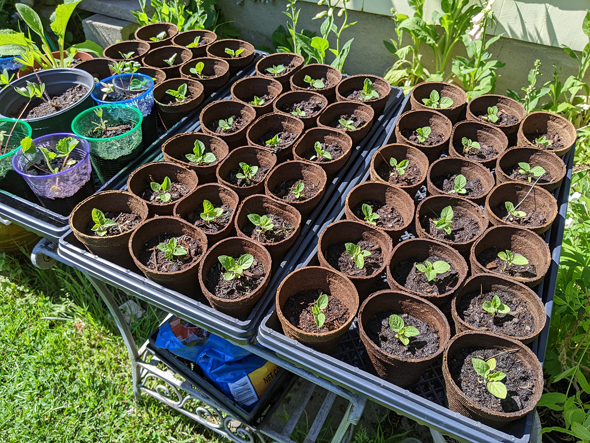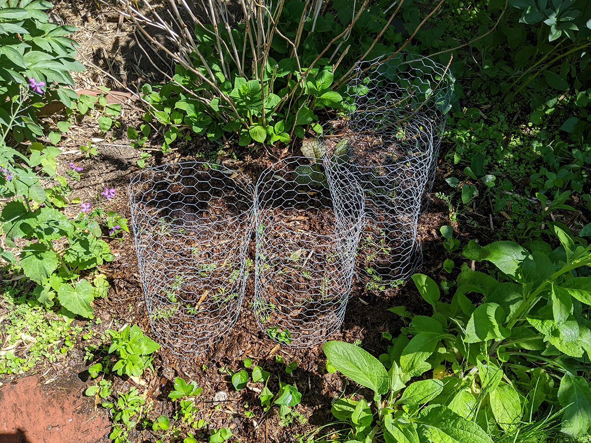 i wasn't in belmont to check out packages, but rather i was there to do some more garden work. i took out the orchids from the basement and watered them with some orchid fertilizer spiked water. i noticed there were some mealybug spots so i sprayed them with neem oil before rinsing everything off with the mist option on the spray head. i also took out the basement pileas and moved them into the sunroom; i'm looking to divide them as well this weekend. finally i planted all my nigella seedlings in the spot in front of the hydrangea. rabbits will definitely eating nigellas so i tried to protect them with some chicken wires.