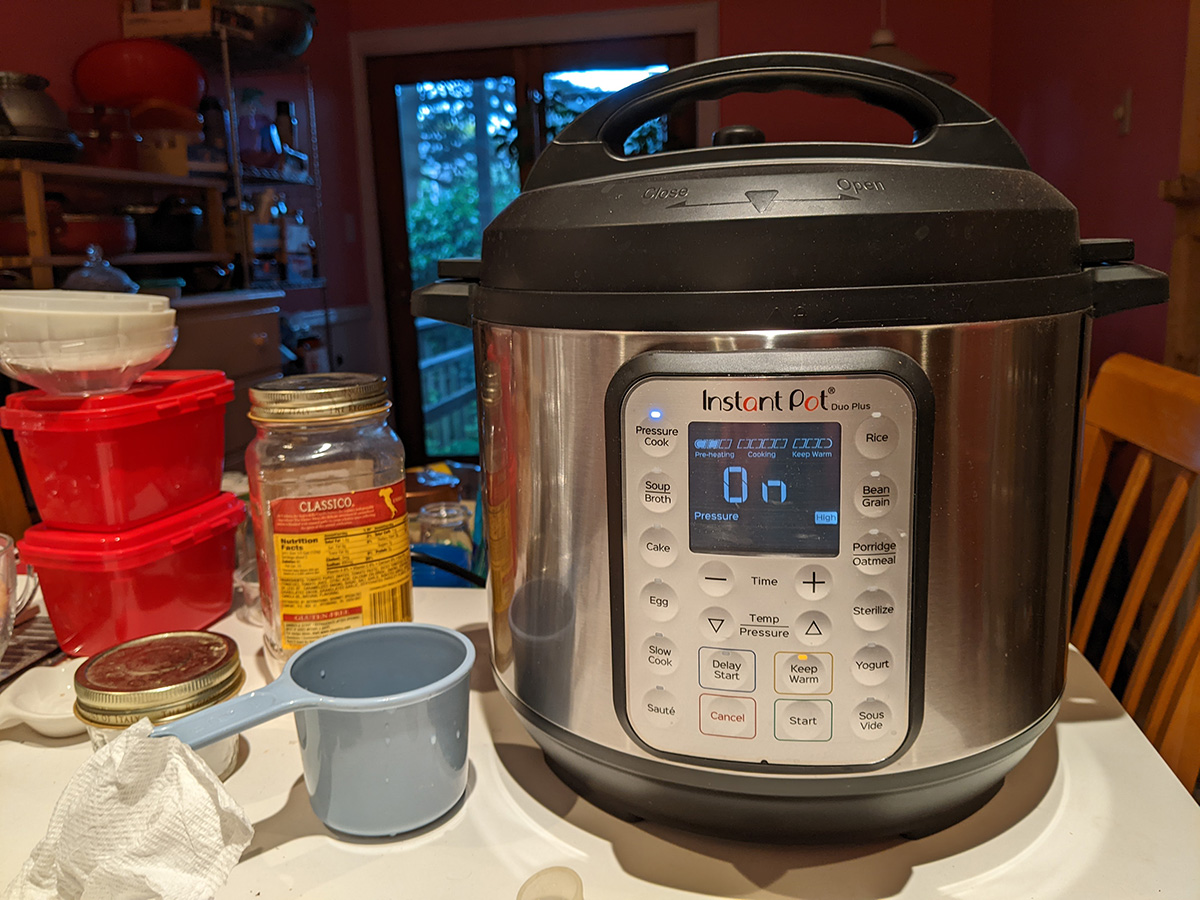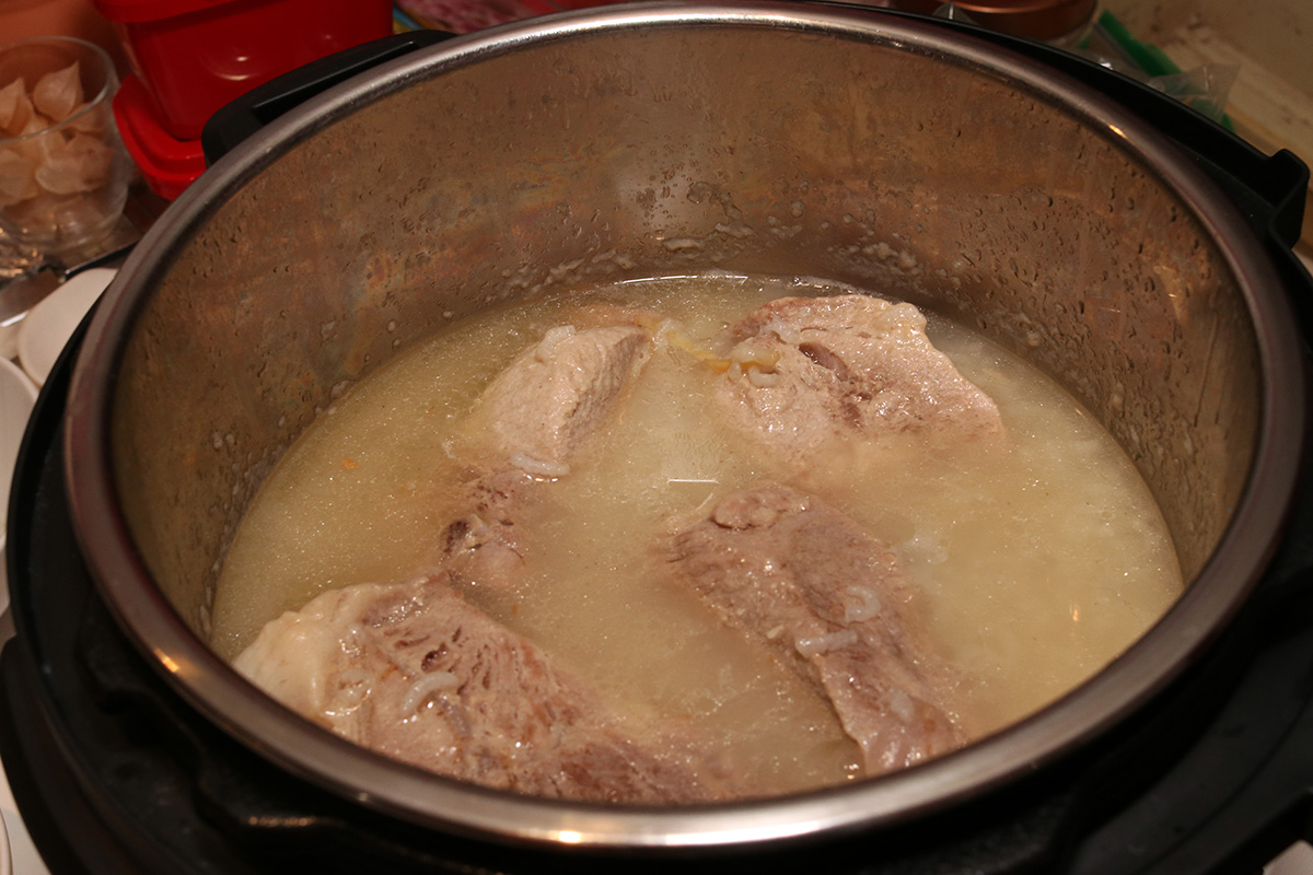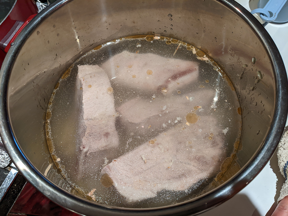 with the weather a little chilly, it was perfect for making my century egg pork bone congee. i started making dinner by 7pm. the bone-in spare ribs i had in my freezer had very little bones and was mostly meat with a good chunk of fat. in hindsight i should've trimmed off the fat first, because once it rendered in the instant pot, it left the congee with an oily mouth-feel. the end result was still delicious though, and such an easy recipe to make, it's basically the only thing i make with my new instant pot.