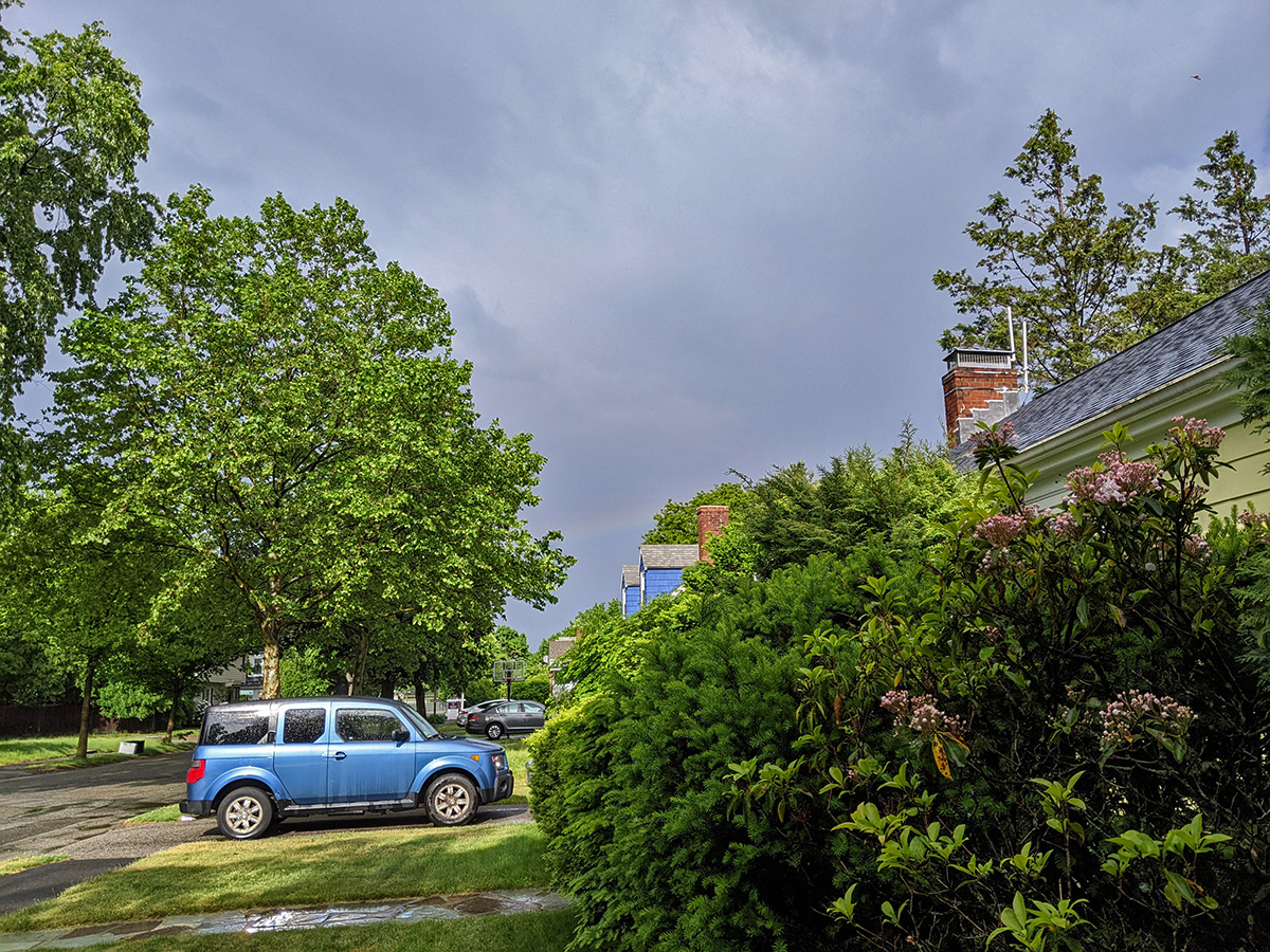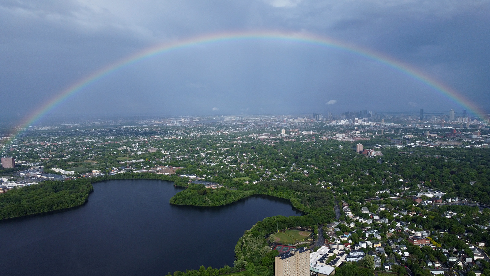 once the sun came out around 5pm, i ran to the back and front of the house to look for rainbows. i'm getting pretty good at recognizing optimum rainbow conditions and when i spotted it on the eastern horizon, i quickly grabbed my drone and went into the backyard to launch and to see if i can get a better view of the rainbow. sure enough, it spanned from alewife all the way into boston. i even saw traces of the double rainbow. the storm clouds were just moving away, and there some remnants just low enough that they actually passed through my drone.