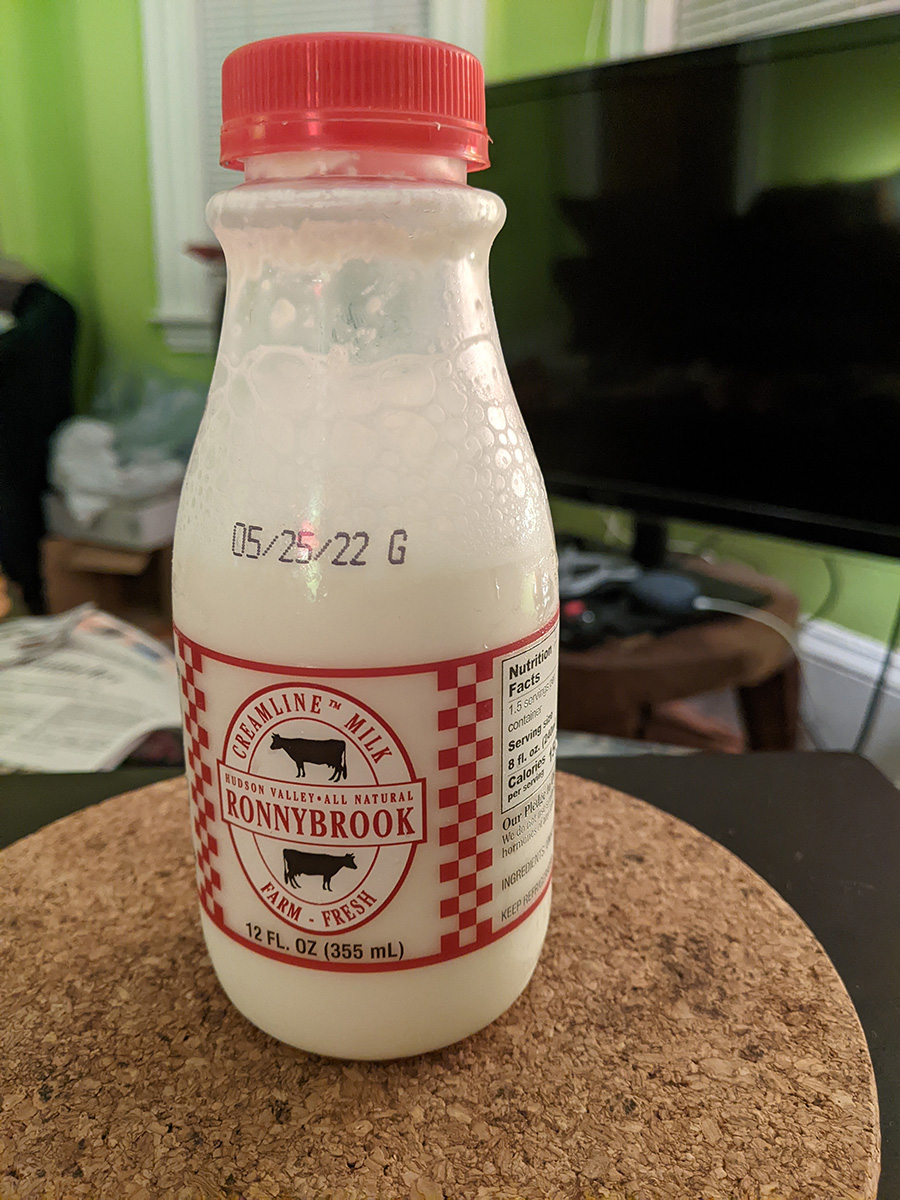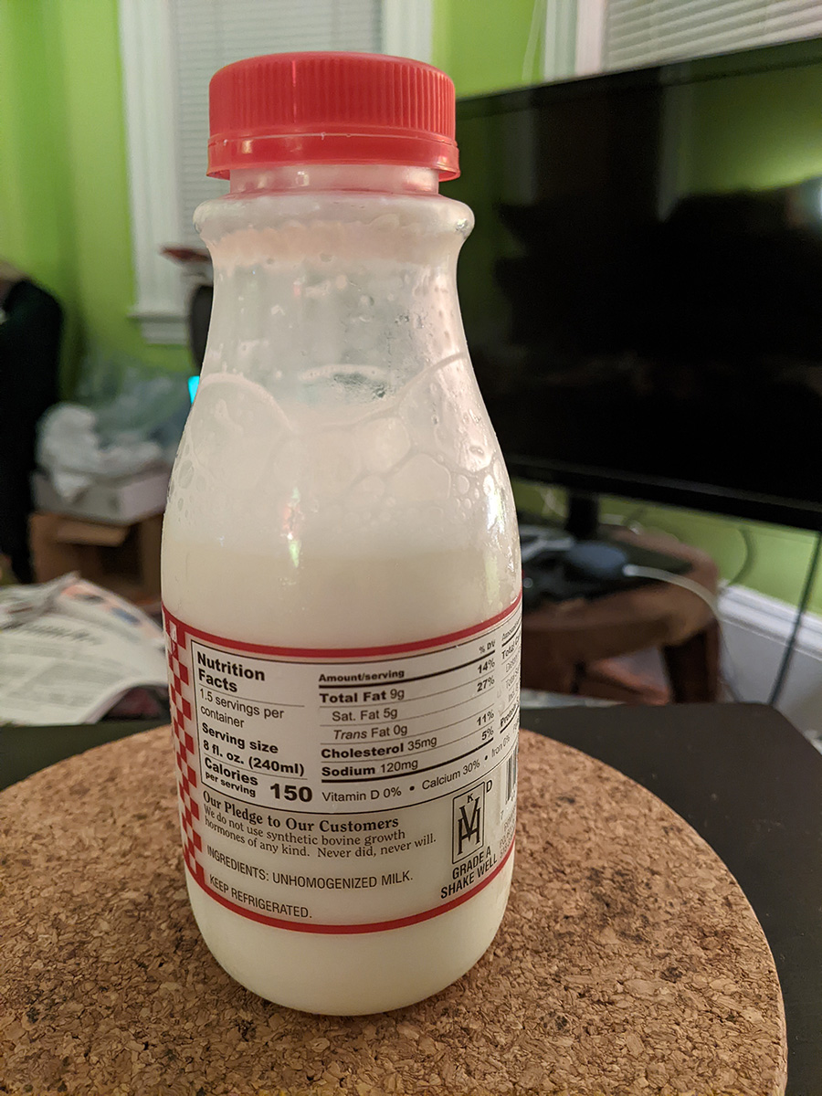 i bought two bottles of unhomogenized milk ($1) at haymarket yesterday. they'd expired 2 days ago, but seemed fresh enough that i wanted to try it out. i did notice yesterday that there were some solids in the milk, which didn't seem normal.