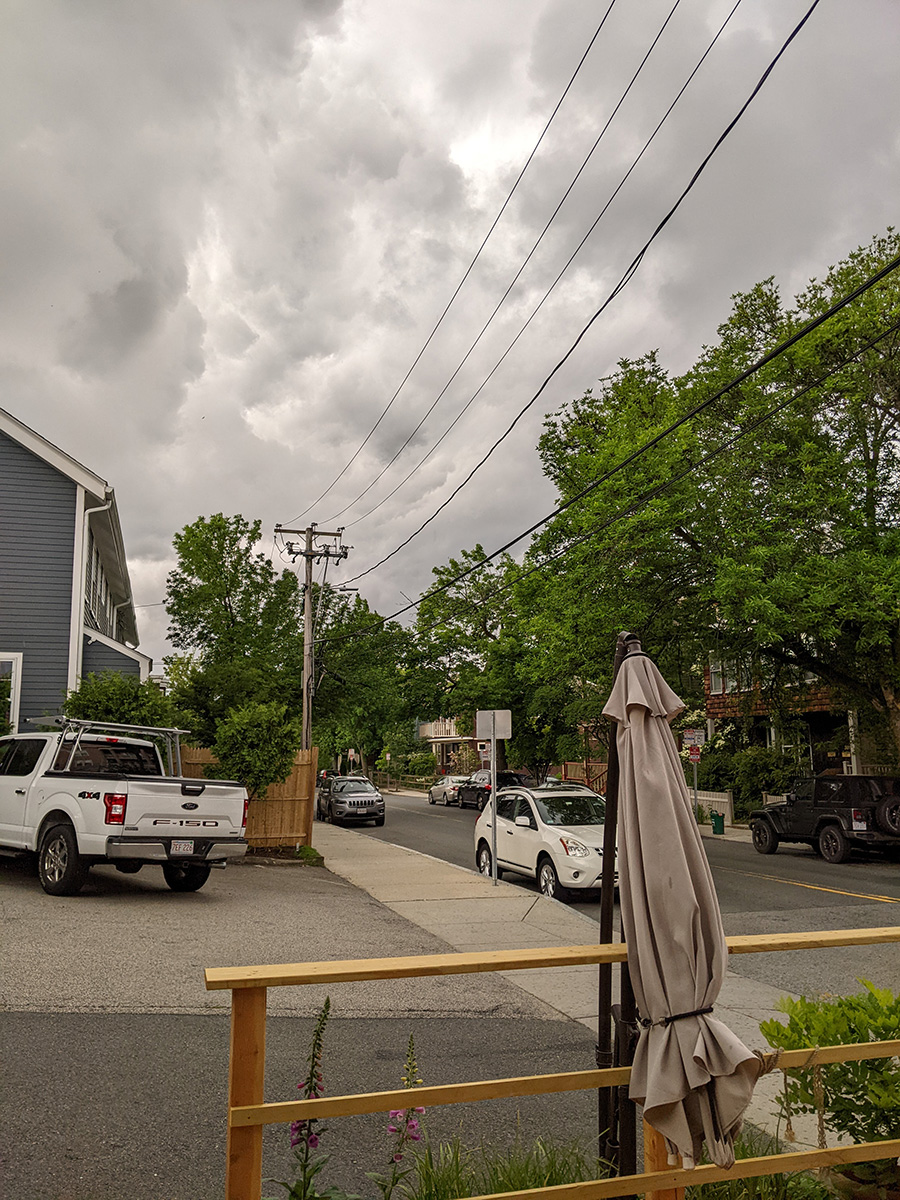 my father returned around 3pm. that was also the time when the sky started looking particularly threatening and a check of the doppler radar showed imminent thunderstorms approaching. my aunt decided to get home before the rain began, but my father ended up giving her a ride while we brought in all the chairs and tables from the outdoor deck. 3pm was also our last customer of the day - a man who made an order but then waited in his car and asked us to deliver it to him (he had a little boy in the car). after that we didn't have another customer until we closed at 4pm.
