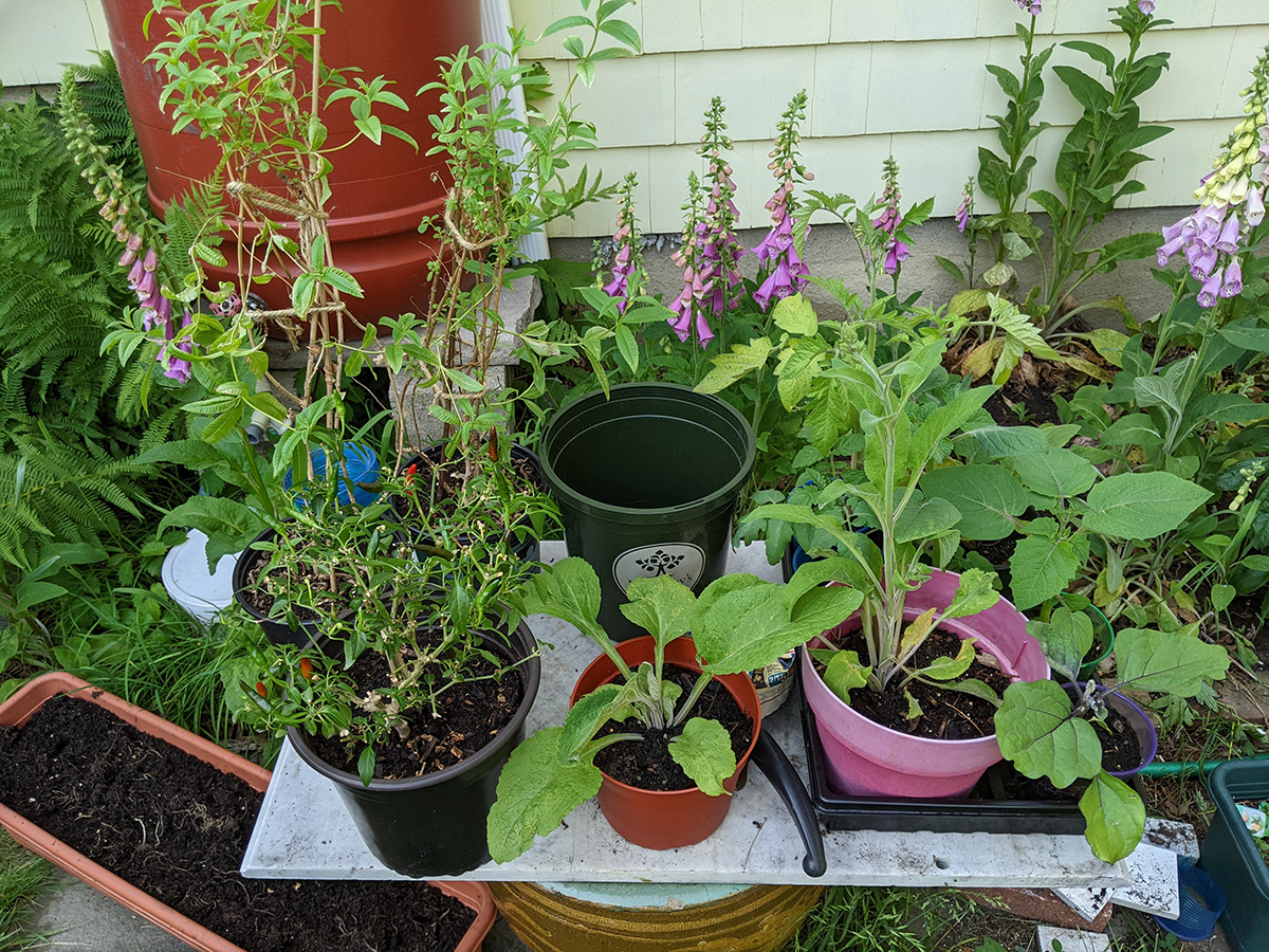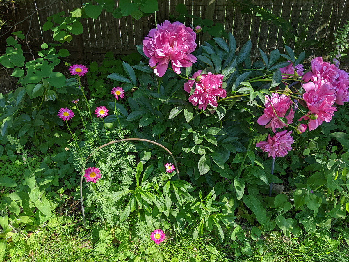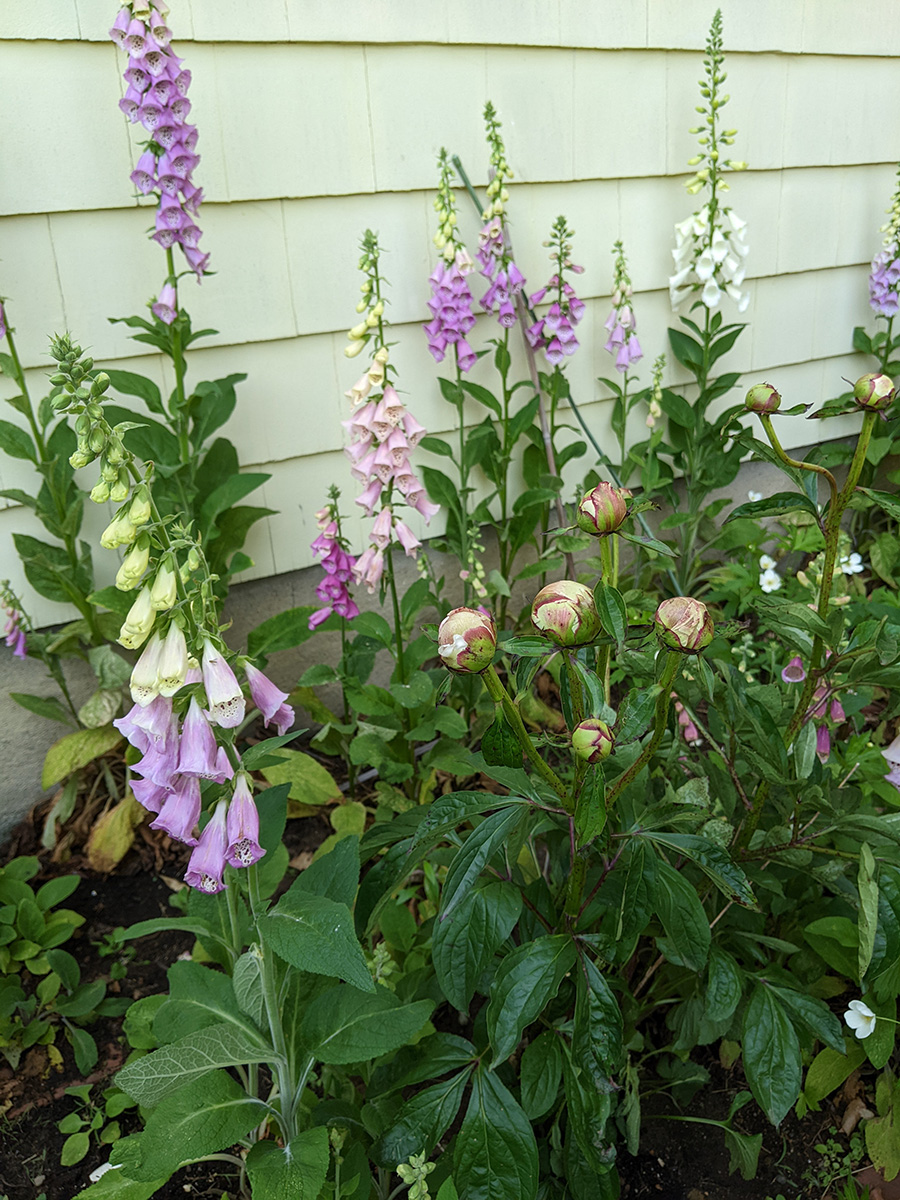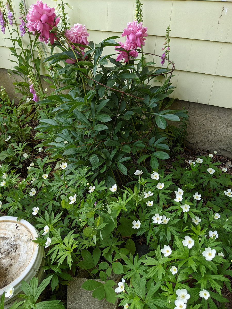 we continued with our yard work. we planted the white peony my aunt and uncle delivered on friday afternoon. we decided to put it in a spot behind the garage. i thought i'd have to relocate a lot of perennials when i dug the hole, but it only affected a single small foxglove plant. i wanted to put down some chicken manure but my father said it might be too much for the peony, so instead i put a layer of compost first, before sprinkling some osmocote slow-release fertilizer pellets. i then held the peony in place while my father shoveled dirt and i filled in the hole. there are severl large peony flower buds, i won't know if they'll bloom or abort. in the container that came with the peony was a eyeless peony root. i ended up planting it near the grapevines, don't know if it'll survive.