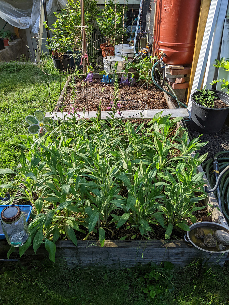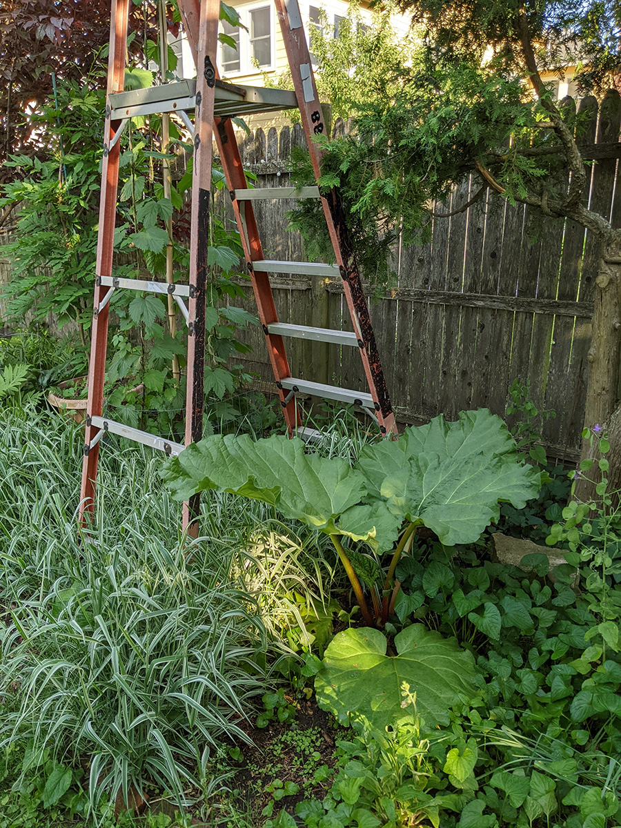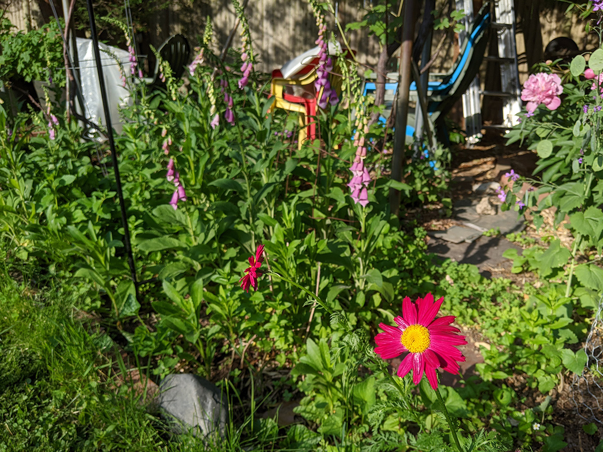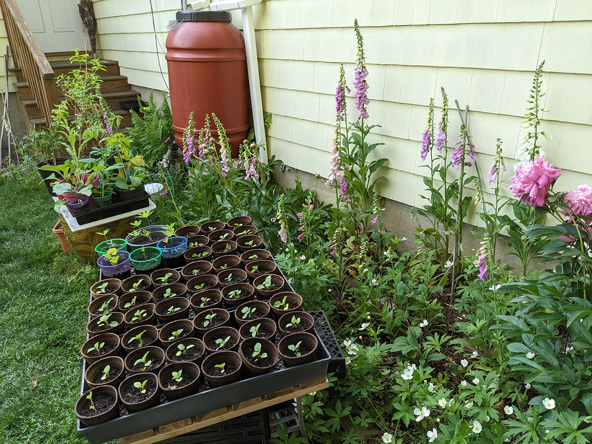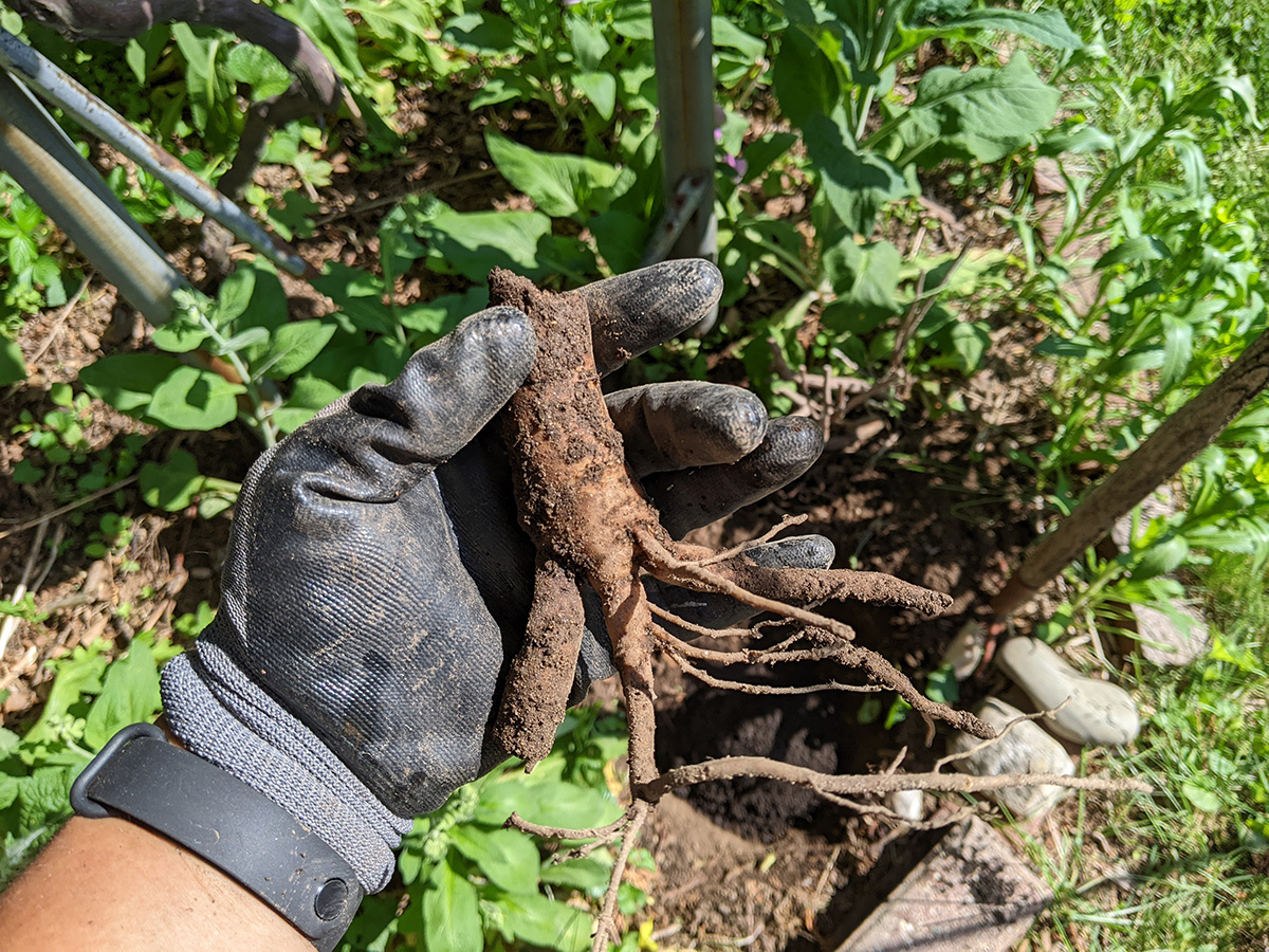 we continued with our yard work. we planted the white peony my aunt and uncle delivered on friday afternoon. we decided to put it in a spot behind the garage. i thought i'd have to relocate a lot of perennials when i dug the hole, but it only affected a single small foxglove plant. i wanted to put down some chicken manure but my father said it might be too much for the peony, so instead i put a layer of compost first, before sprinkling some osmocote slow-release fertilizer pellets. i then held the peony in place while my father shoveled dirt and i filled in the hole. there are severl large peony flower buds, i won't know if they'll bloom or abort. in the container that came with the peony was a eyeless peony root. i ended up planting it near the grapevines, don't know if it'll survive.