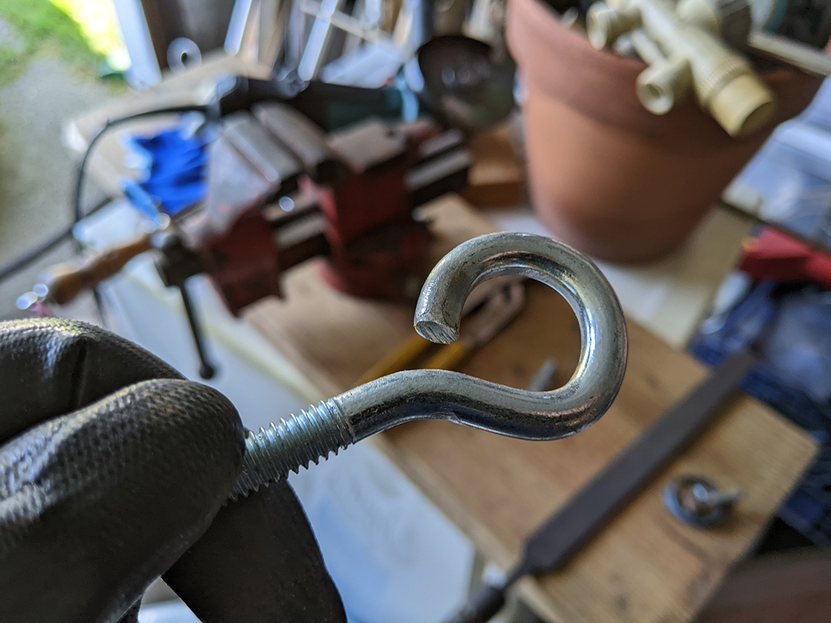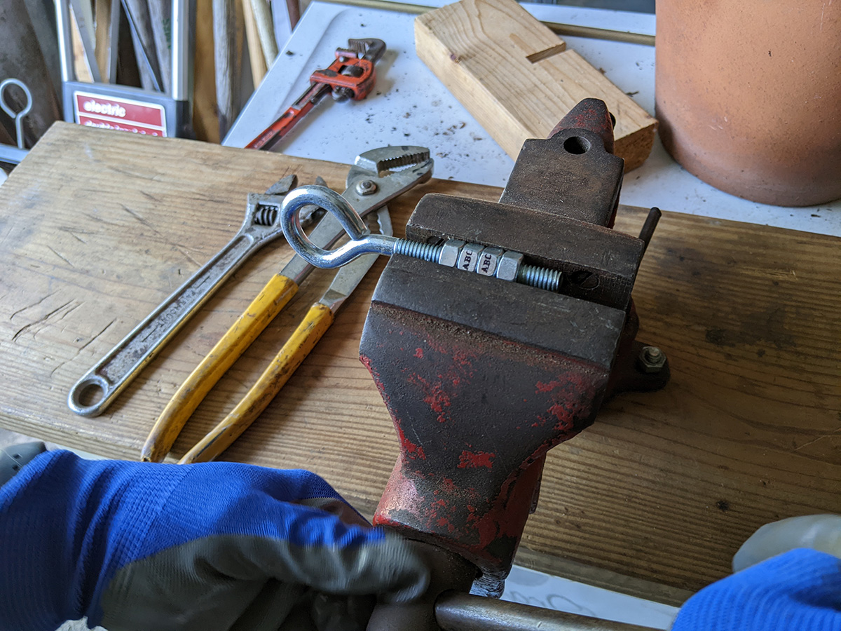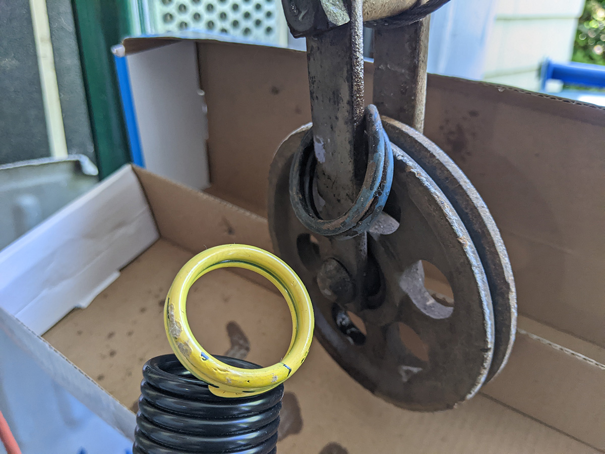 we got back to the house by 3pm. clamped in a vise, my father tried to pry open the "eye" of the eye hook but it wouldn't budge. he ended up using the angle grinder to trim off about less than half a centimeter from hook. it was quite the production, with sparks flying everywhere, and my father even managed to burn himself when he touched the hook afterwards, which was scorching hot. we installed the hook onto the metal brace of the garage door then attached the spare garage door spring along with the pulley. another problem we encountered was the old metal braid wouldn't come off. the part that attached to the bottom of the garage door was crimped to a special metal bracket that seemed to be nailed to the door. so we decided to reuse the wire. with me on a step ladder pulling the spring and my father balancing on an empty barrel, we managed to clip the wire into the S-hook. we tested the door, it worked great, though if we need to replace the spring again in the future, we should get the blue-variety (140 lbs. rating), not the yellow-variety (130 lbs. rating) we have now.