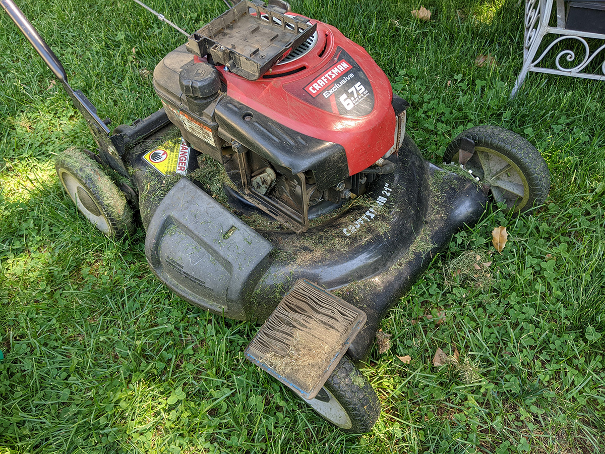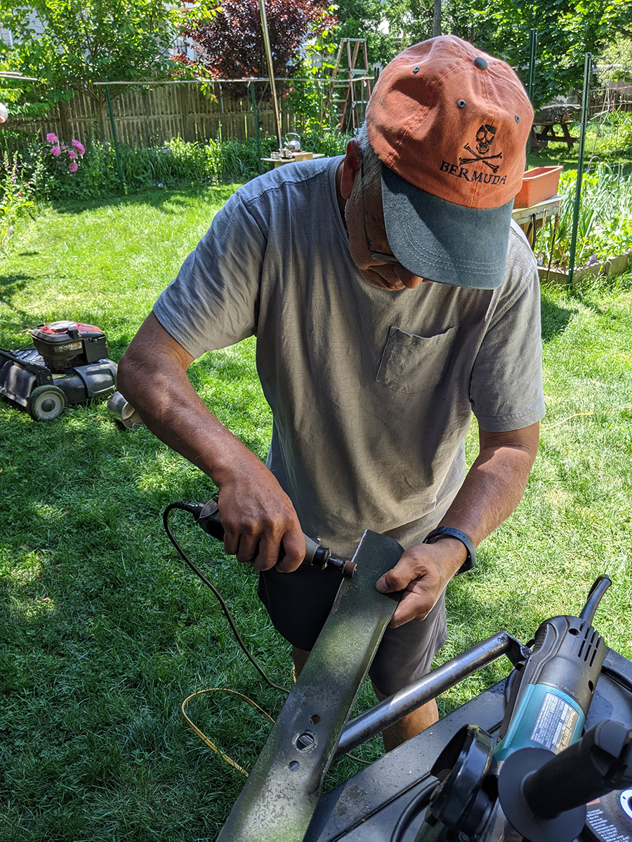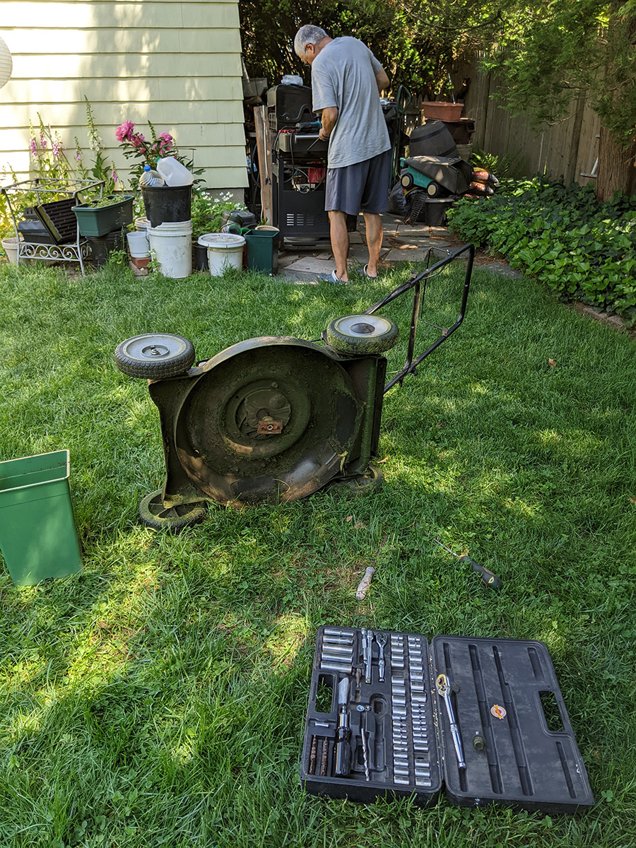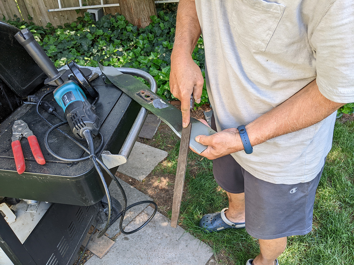 my father then did some mowing until the gasoline ran out, so we could tip the mower on its side and remove the blade for sharpening. the blade was replaced fairly recently (2018), but i don't think we've ever sharpened it before. he had an angle grinder but that seemed too aggressive, so he was trying to sharpen the blade with a file instead. we made some headway before my mother called us in for lunch.