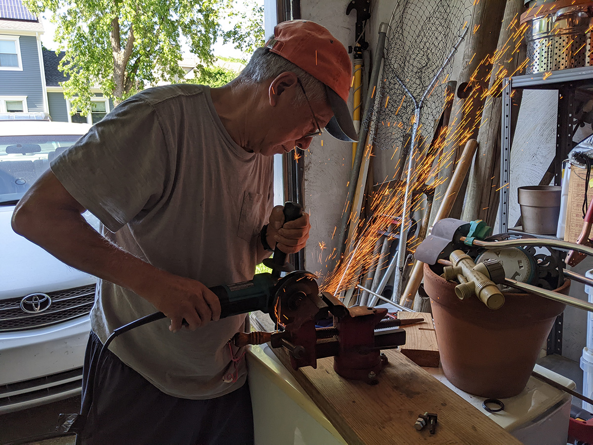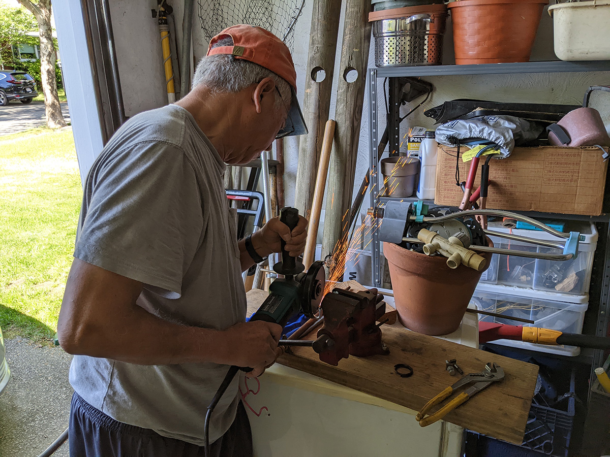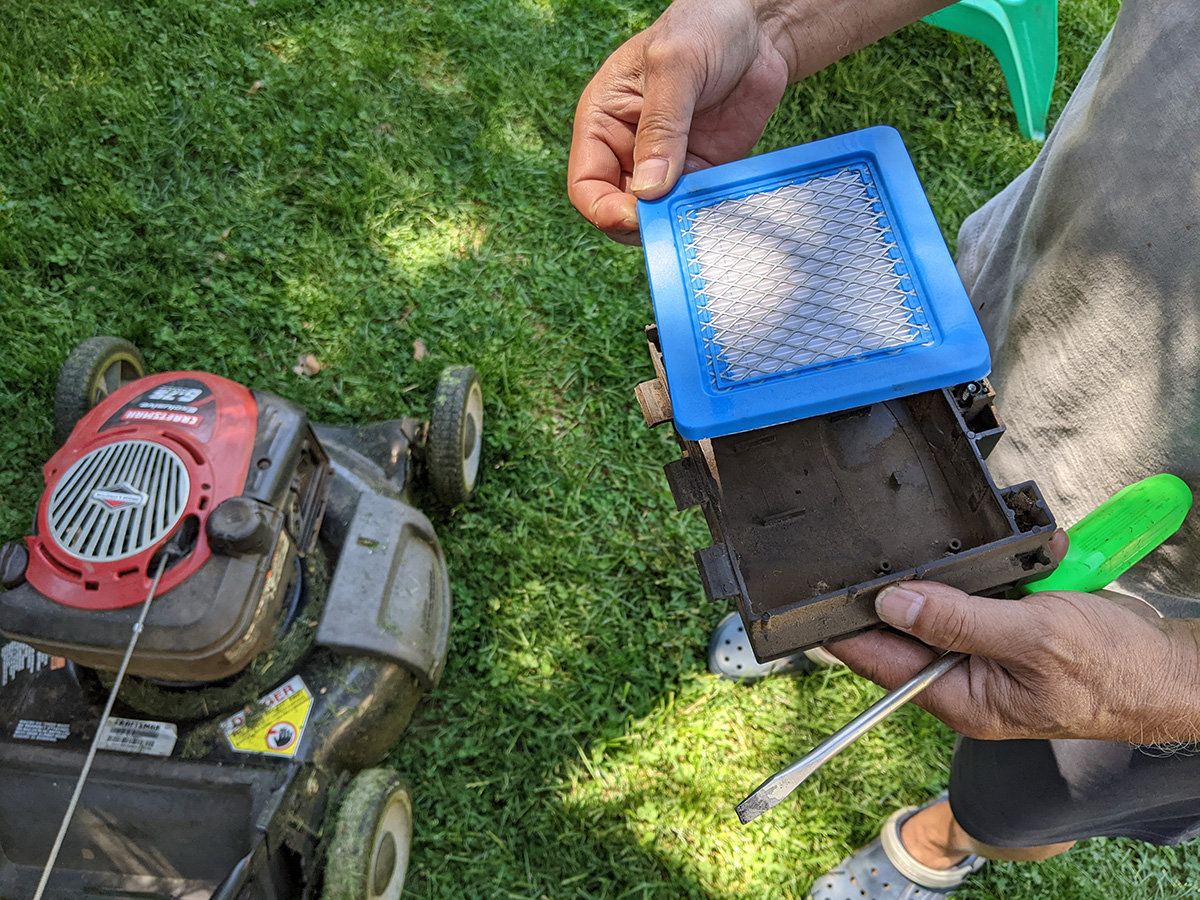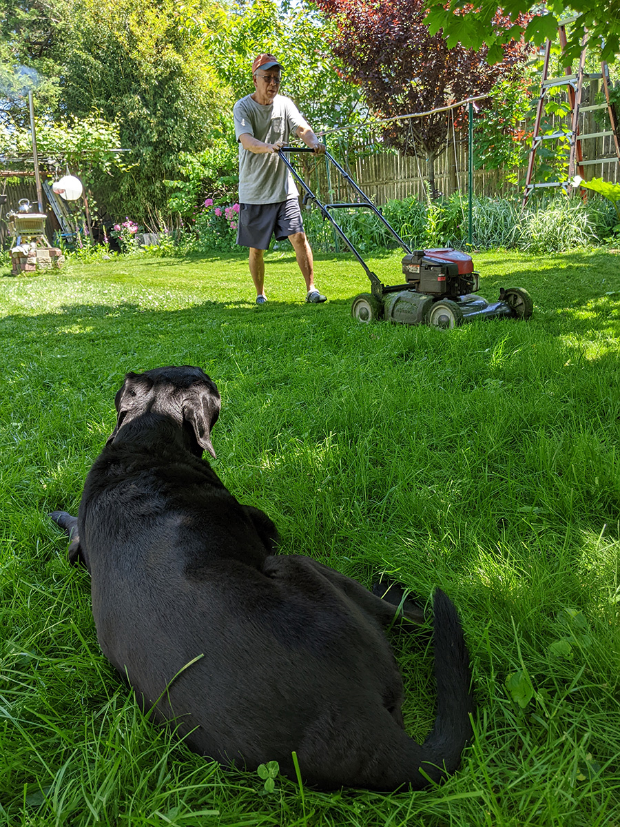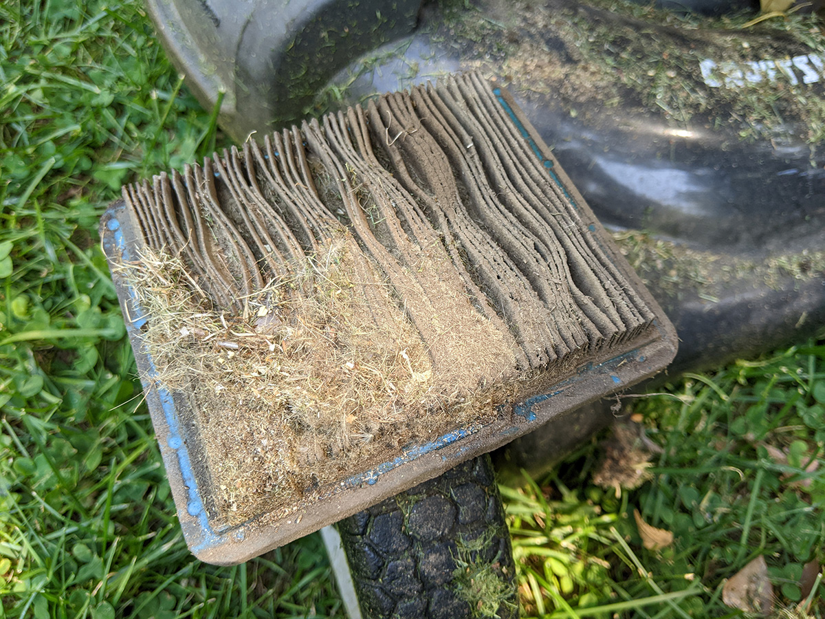 my father then did some mowing until the gasoline ran out, so we could tip the mower on its side and remove the blade for sharpening. the blade was replaced fairly recently (2018), but i don't think we've ever sharpened it before. he had an angle grinder but that seemed too aggressive, so he was trying to sharpen the blade with a file instead. we made some headway before my mother called us in for lunch.