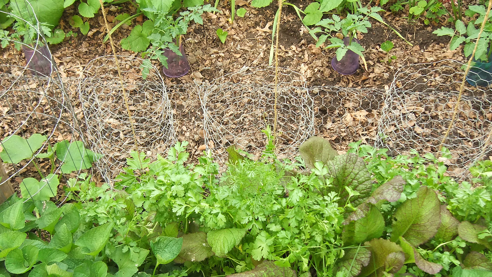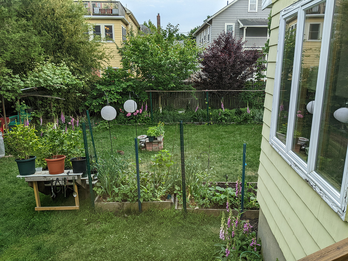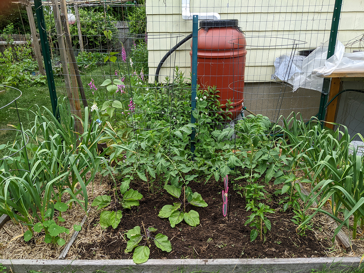 after dinner we were back outside for one last check of the yard. i noticed that despite our caging efforts, long bean seedlings continue to disappear from the southern bed. i still have no idea what's eating them. i now think maybe some kind of bugs. i'll have to come back tomorrow and check again, and if seedlings continue to disappear, i'll have to use milk jugs again to protect the remaining few plants.