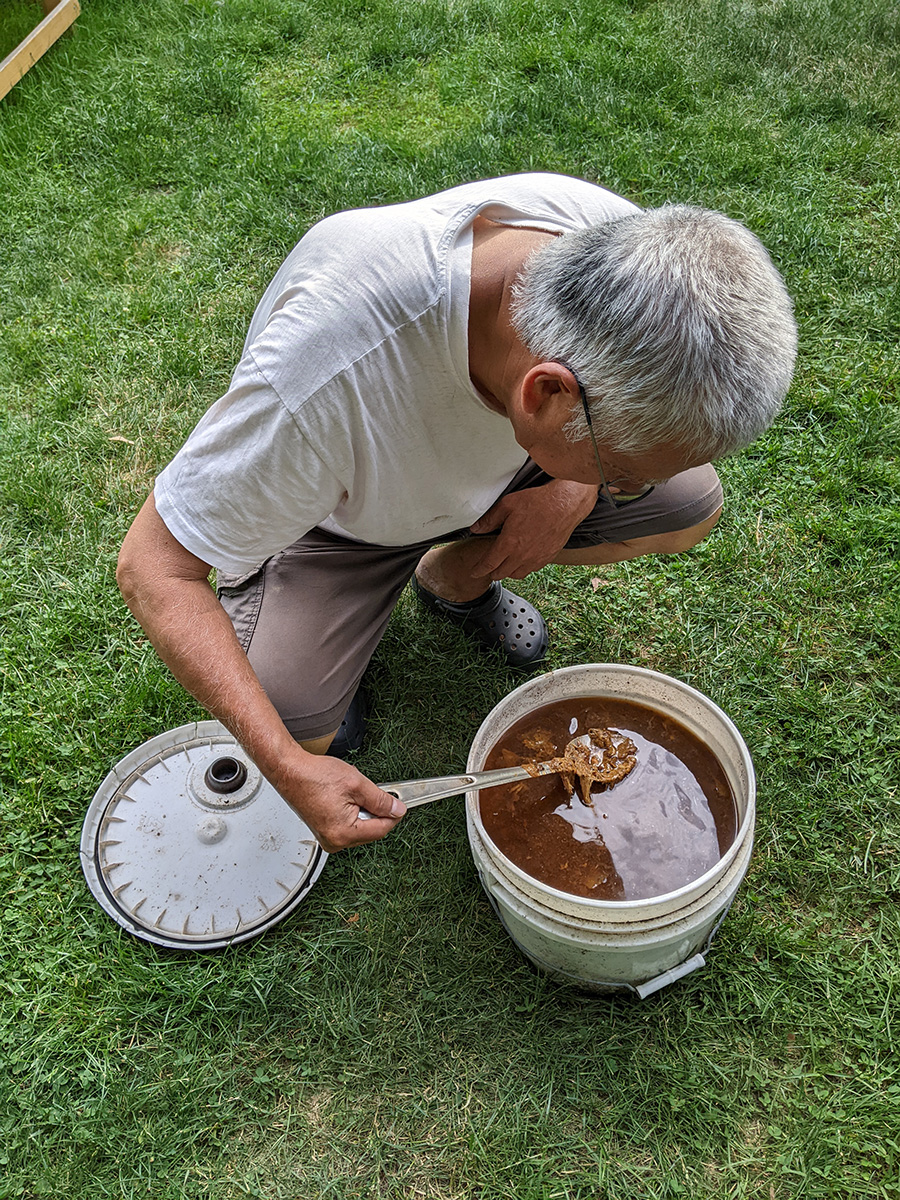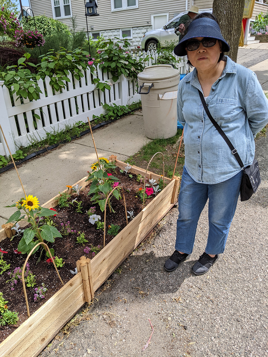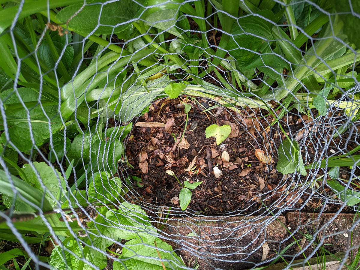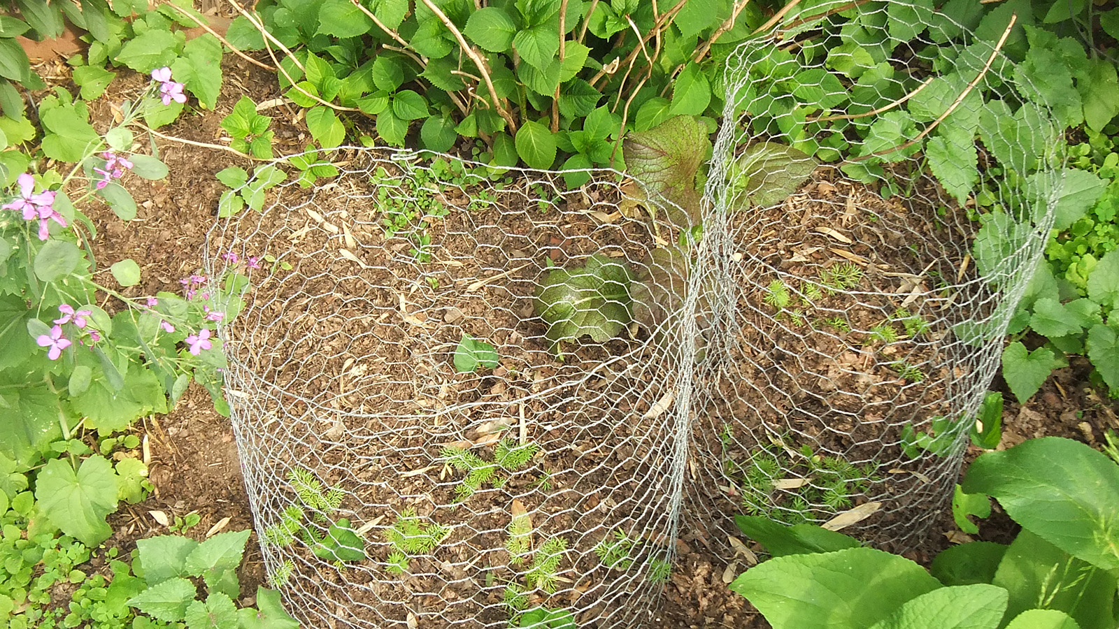 after dinner we were back outside for one last check of the yard. i noticed that despite our caging efforts, long bean seedlings continue to disappear from the southern bed. i still have no idea what's eating them. i now think maybe some kind of bugs. i'll have to come back tomorrow and check again, and if seedlings continue to disappear, i'll have to use milk jugs again to protect the remaining few plants.