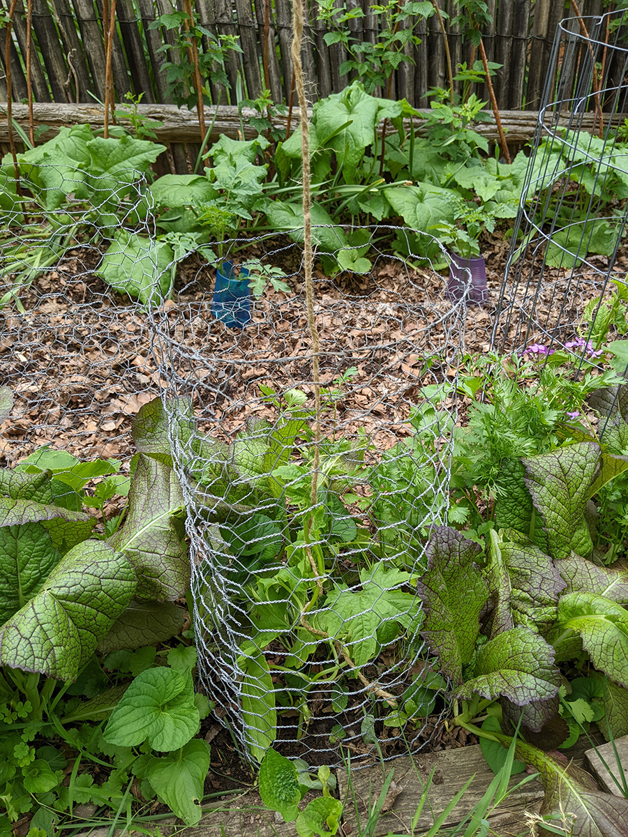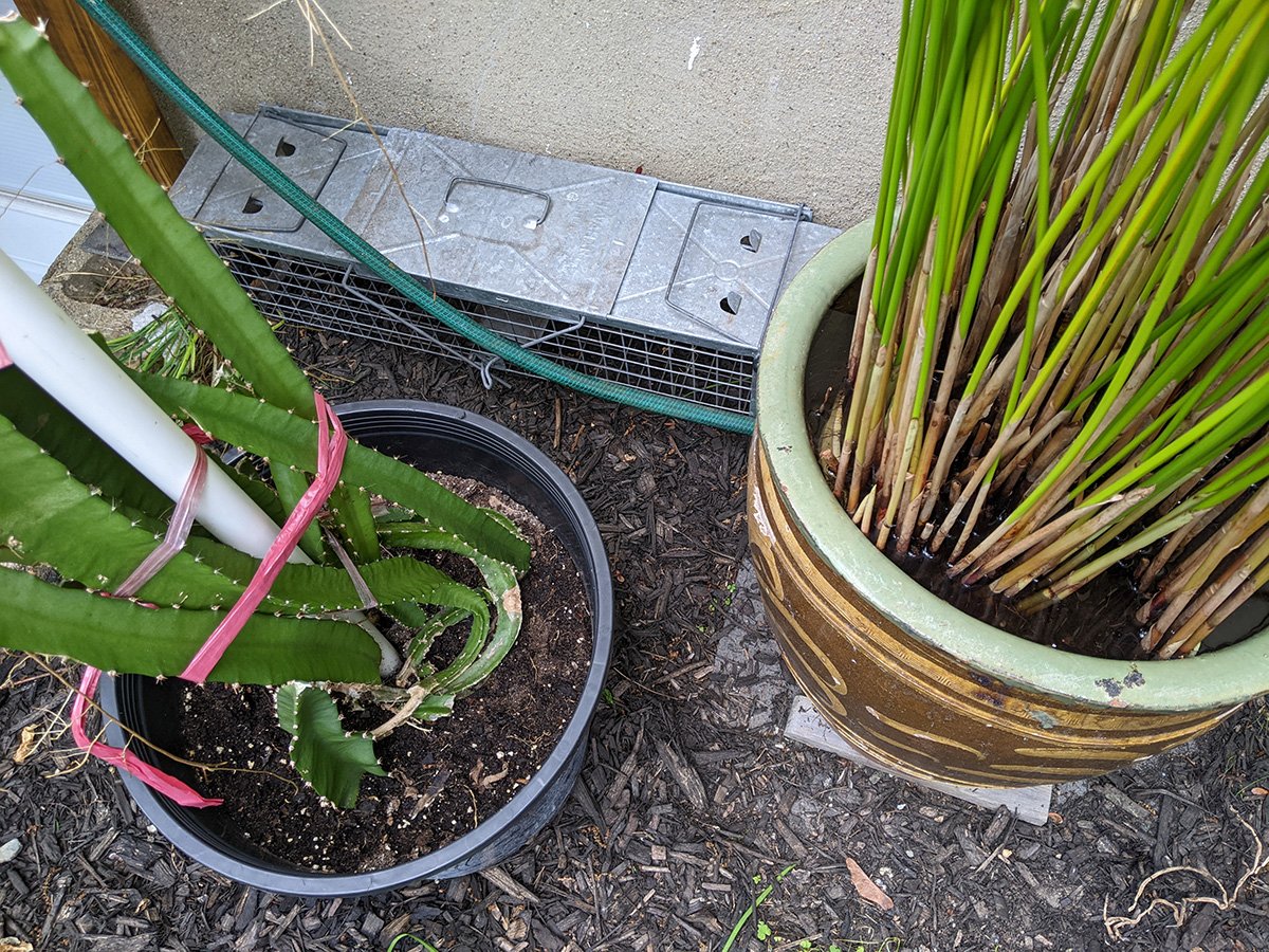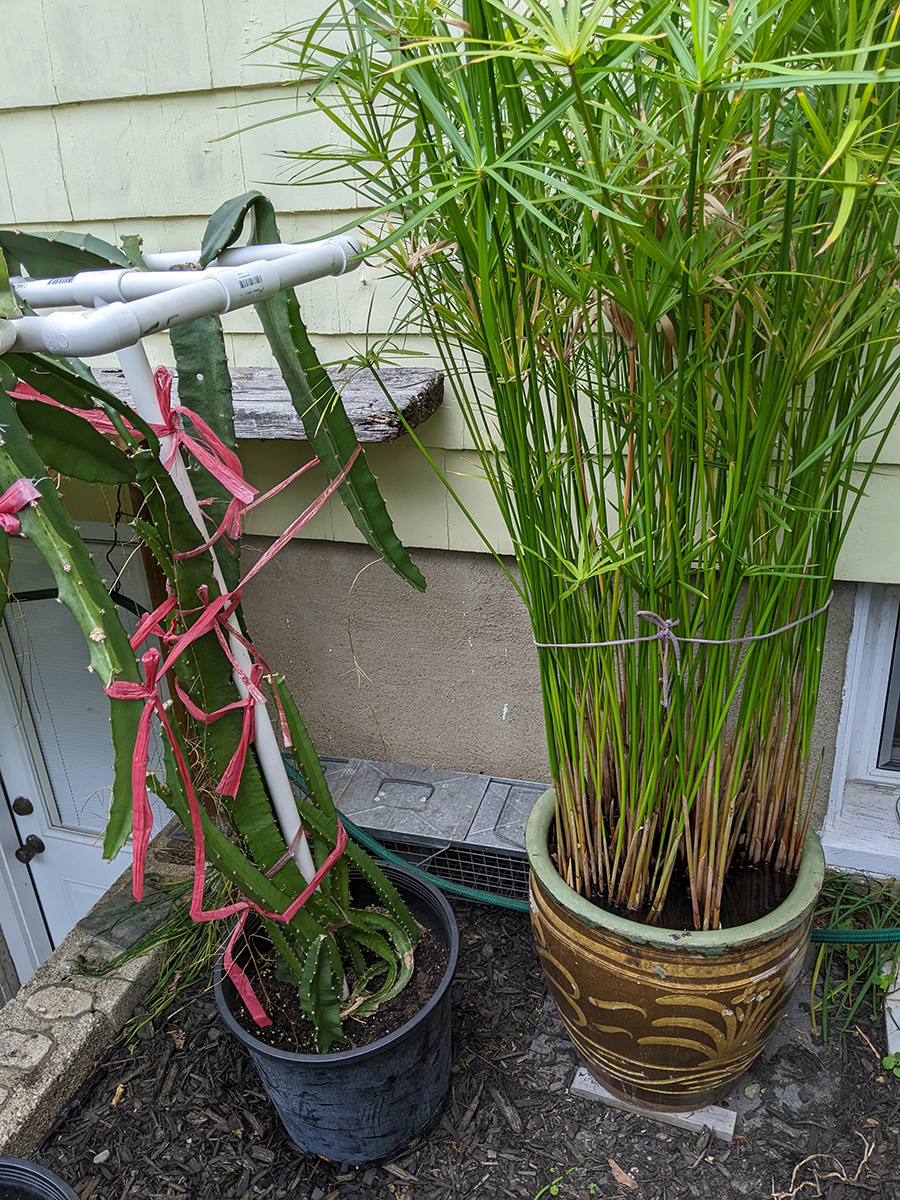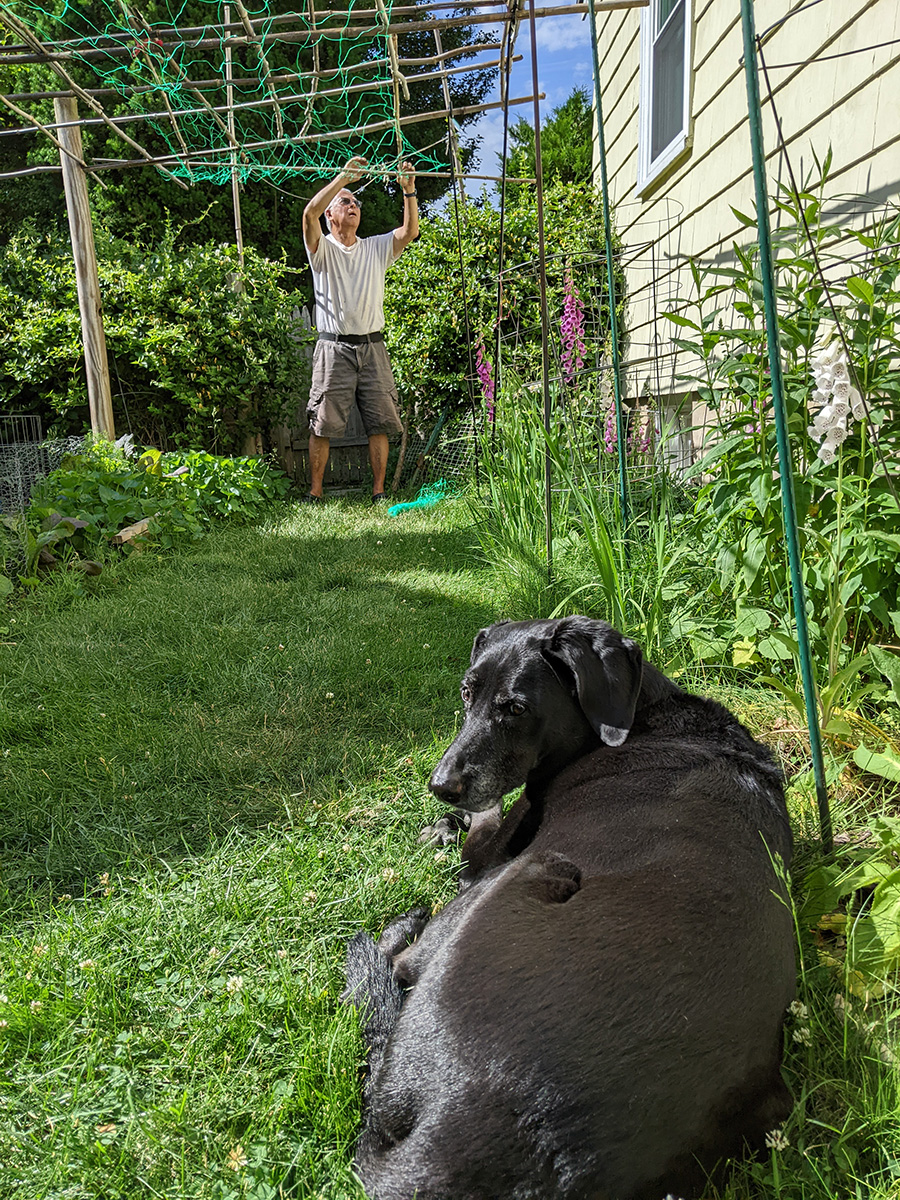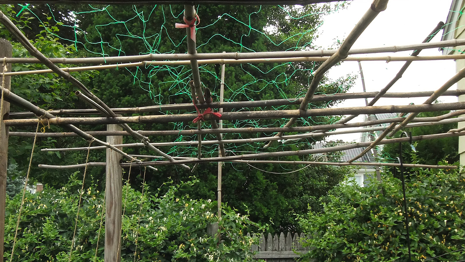 my father also set up the trellis on the western side of the house, putting a layer of my cheap plastic green netting for additional support, and also running twine to the climbing bitter melons and squashes. we even saw 2 new emerging squash seedlings, hopefully chipmunks don't dig them up like they did in RB2. speaking of which, i put out the live animal trap near the faucet, hoping to catch a chipmunk and then release it elsewhere. however, i didn't put any bait, i'll have to add something tomorrow.