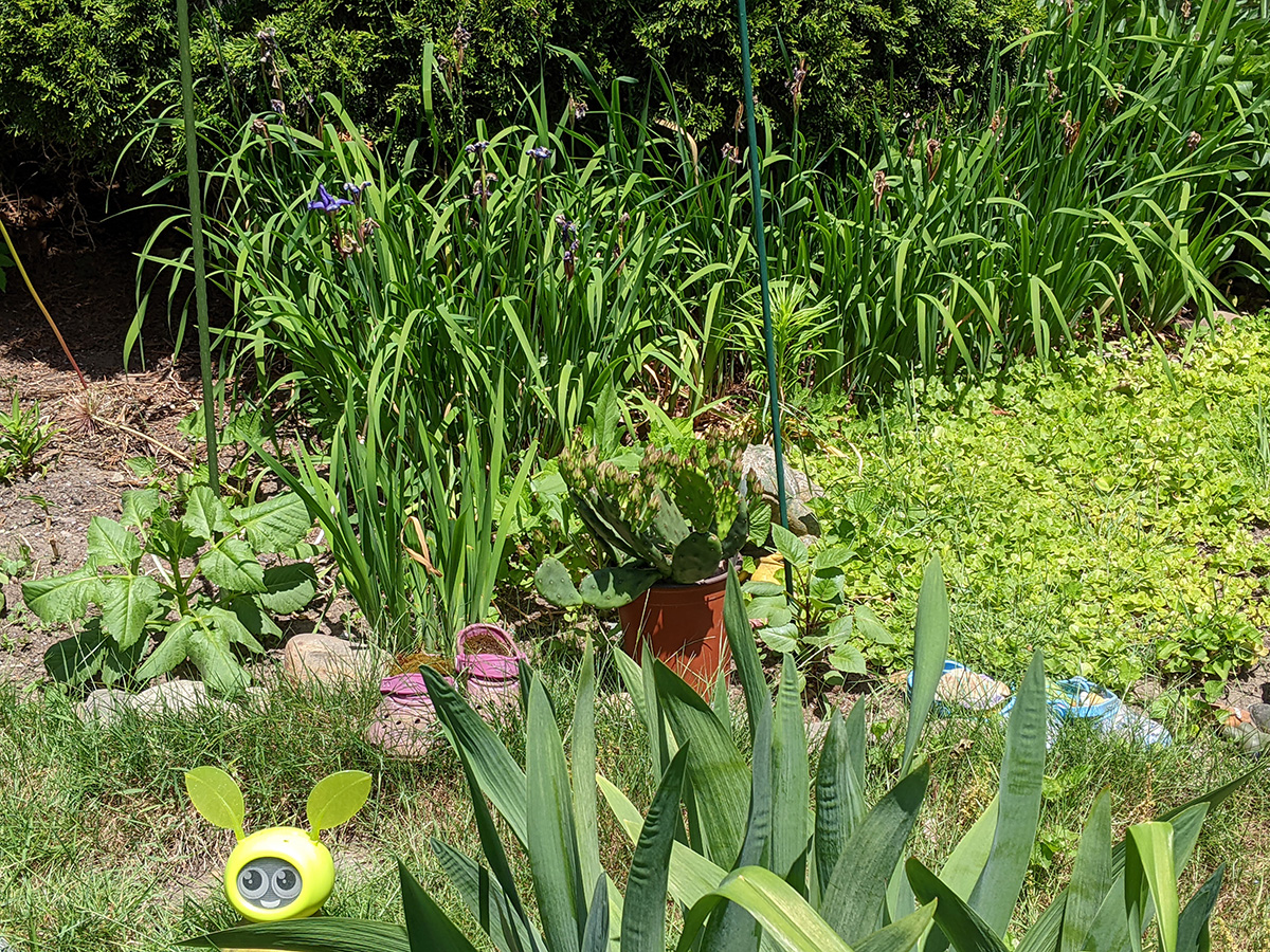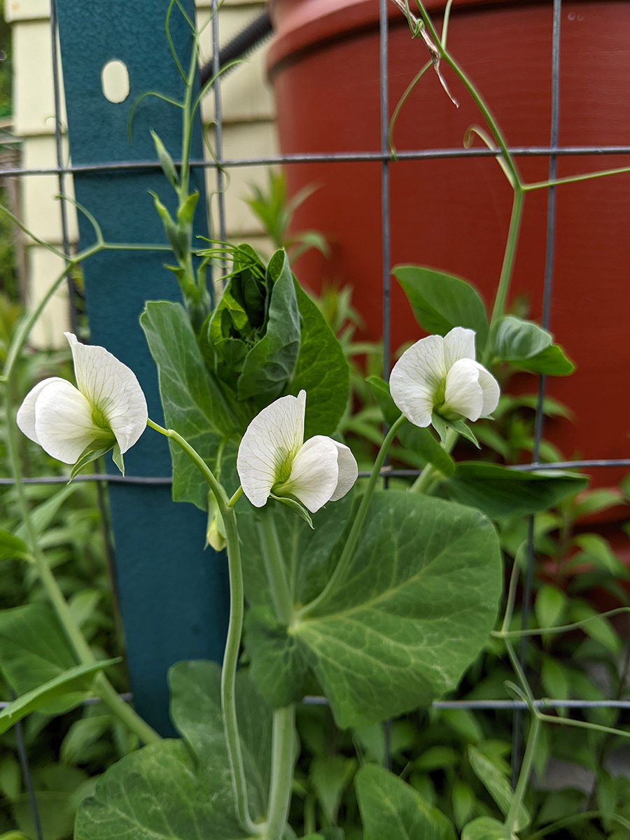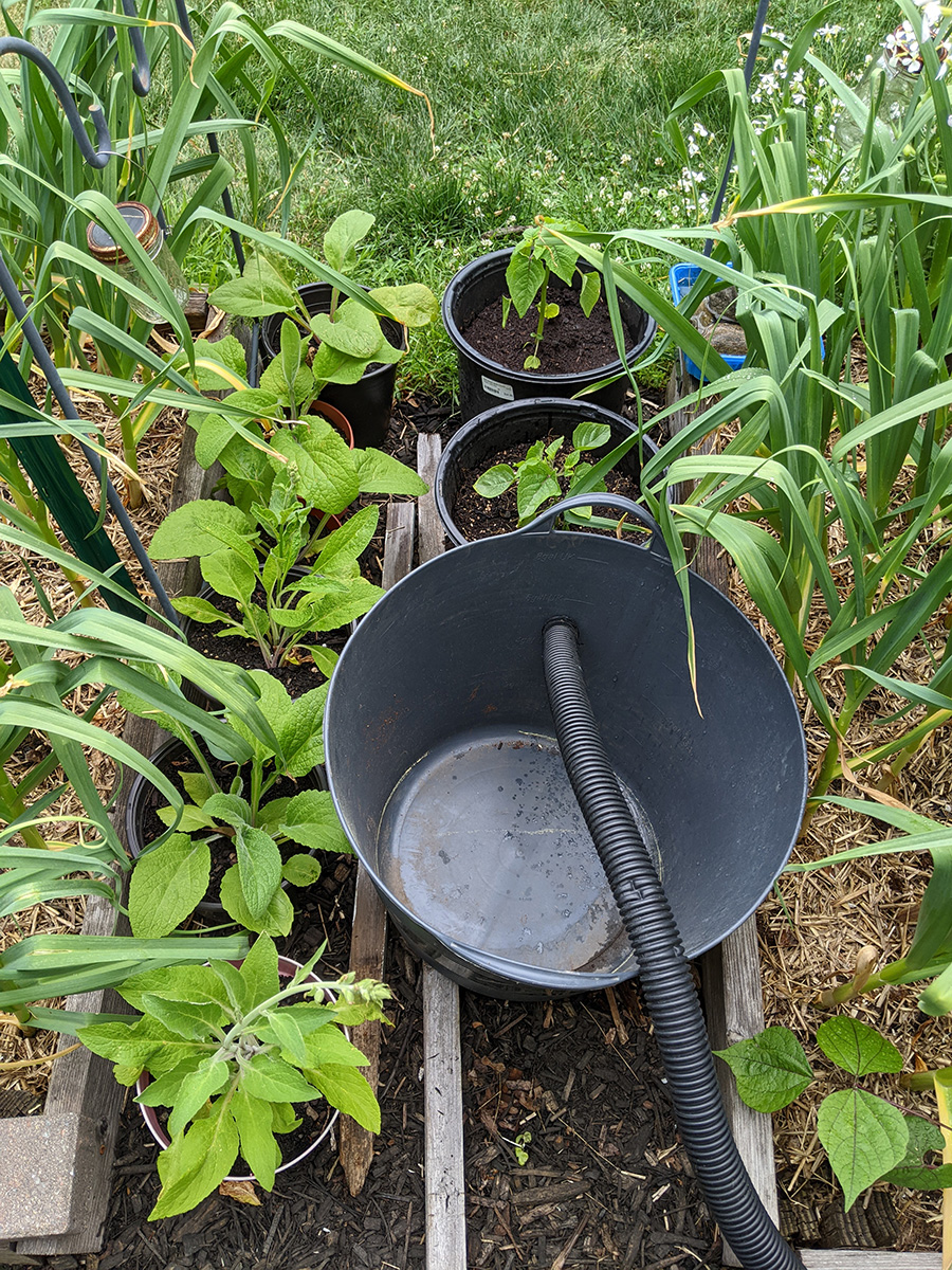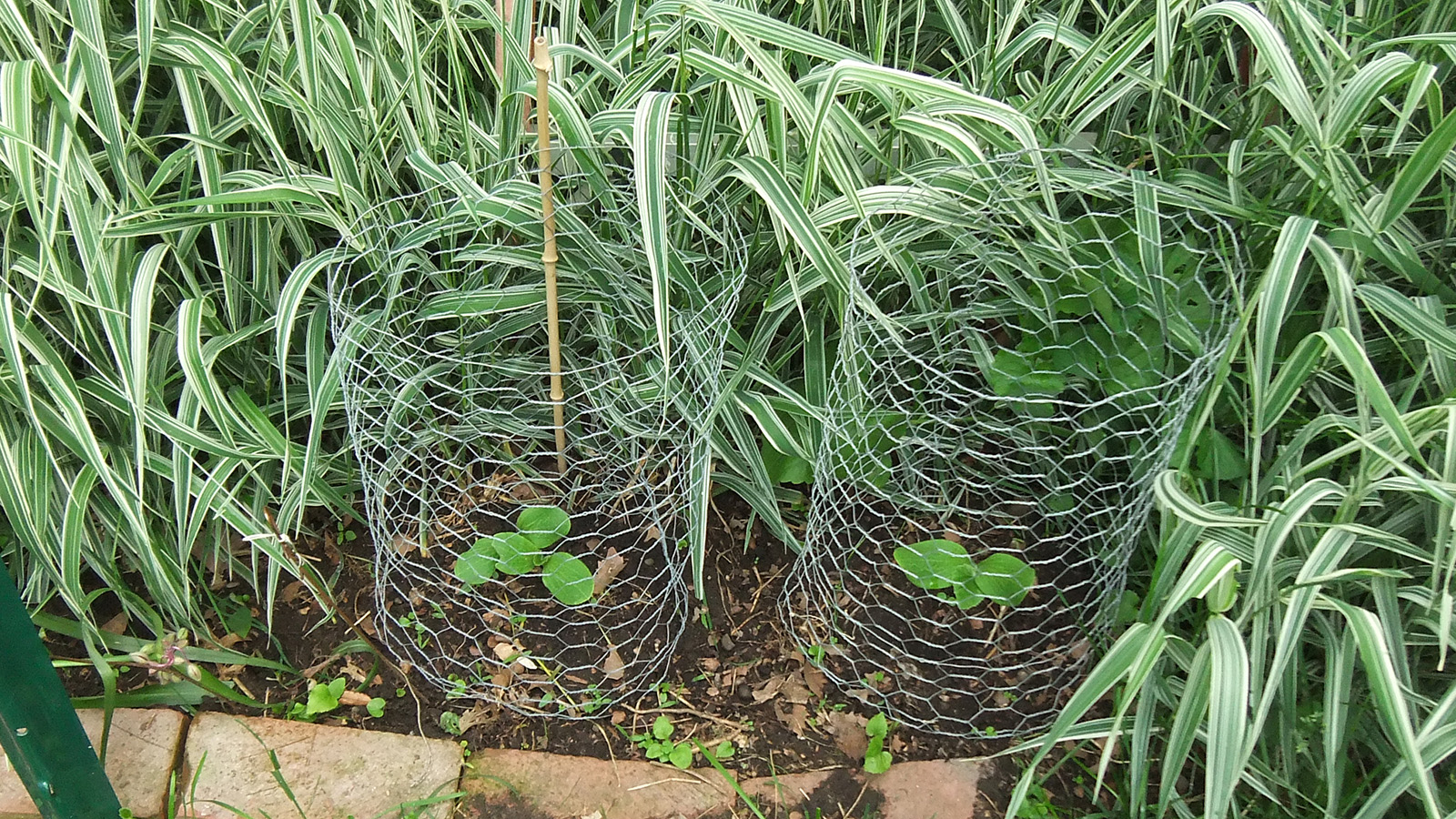 my father also set up the trellis on the western side of the house, putting a layer of my cheap plastic green netting for additional support, and also running twine to the climbing bitter melons and squashes. we even saw 2 new emerging squash seedlings, hopefully chipmunks don't dig them up like they did in RB2. speaking of which, i put out the live animal trap near the faucet, hoping to catch a chipmunk and then release it elsewhere. however, i didn't put any bait, i'll have to add something tomorrow.