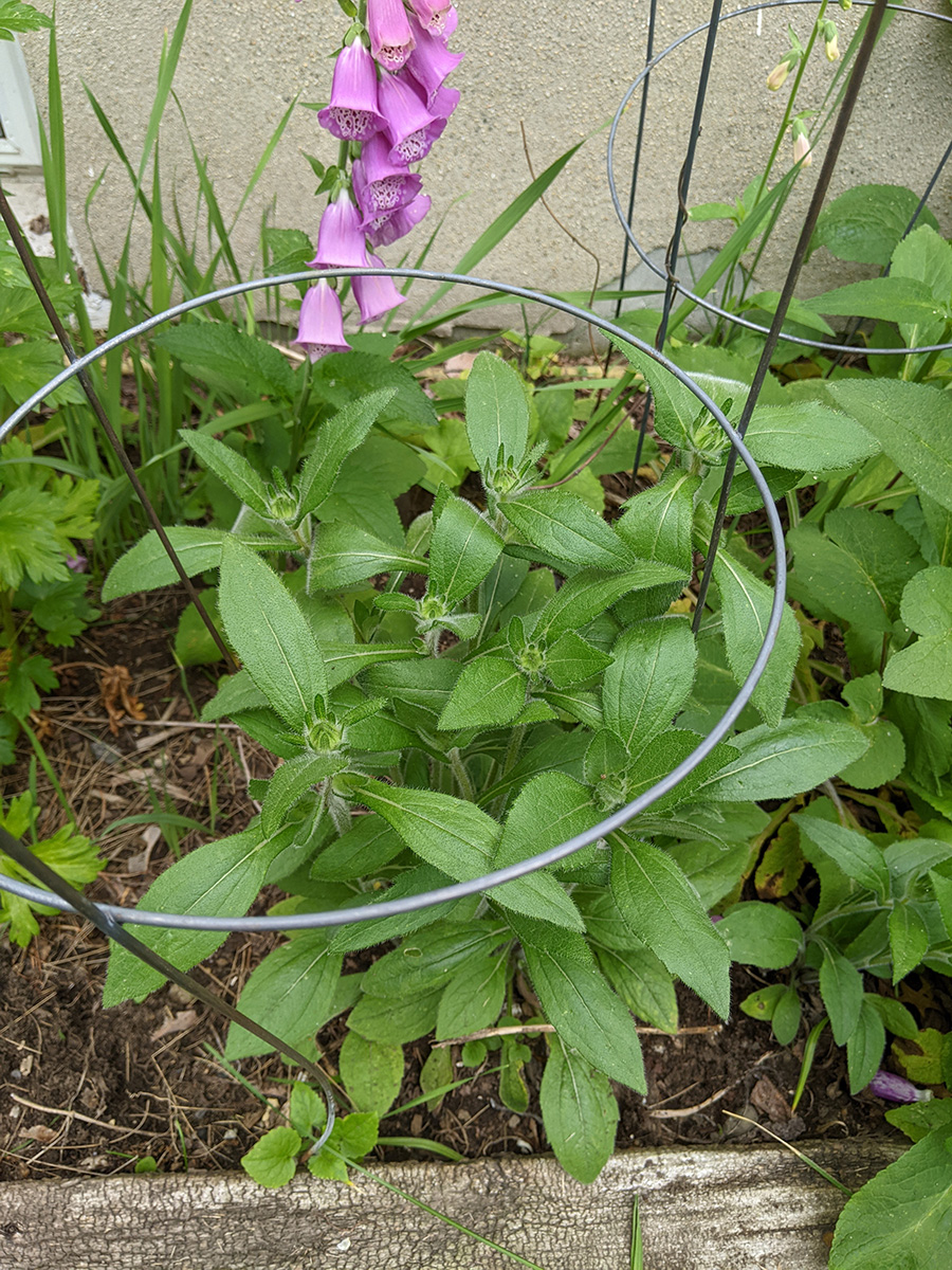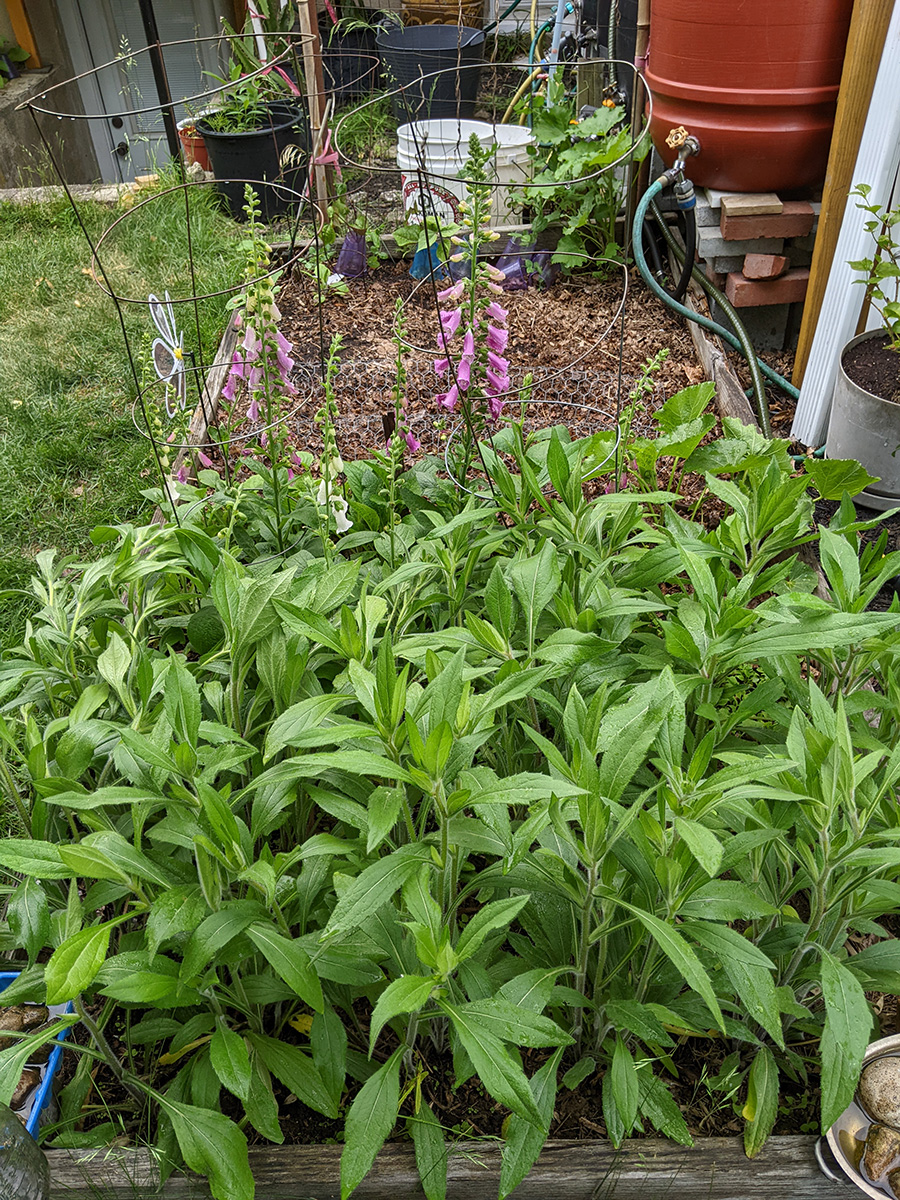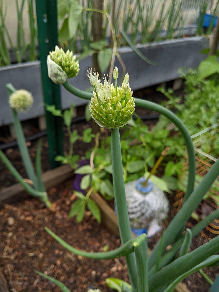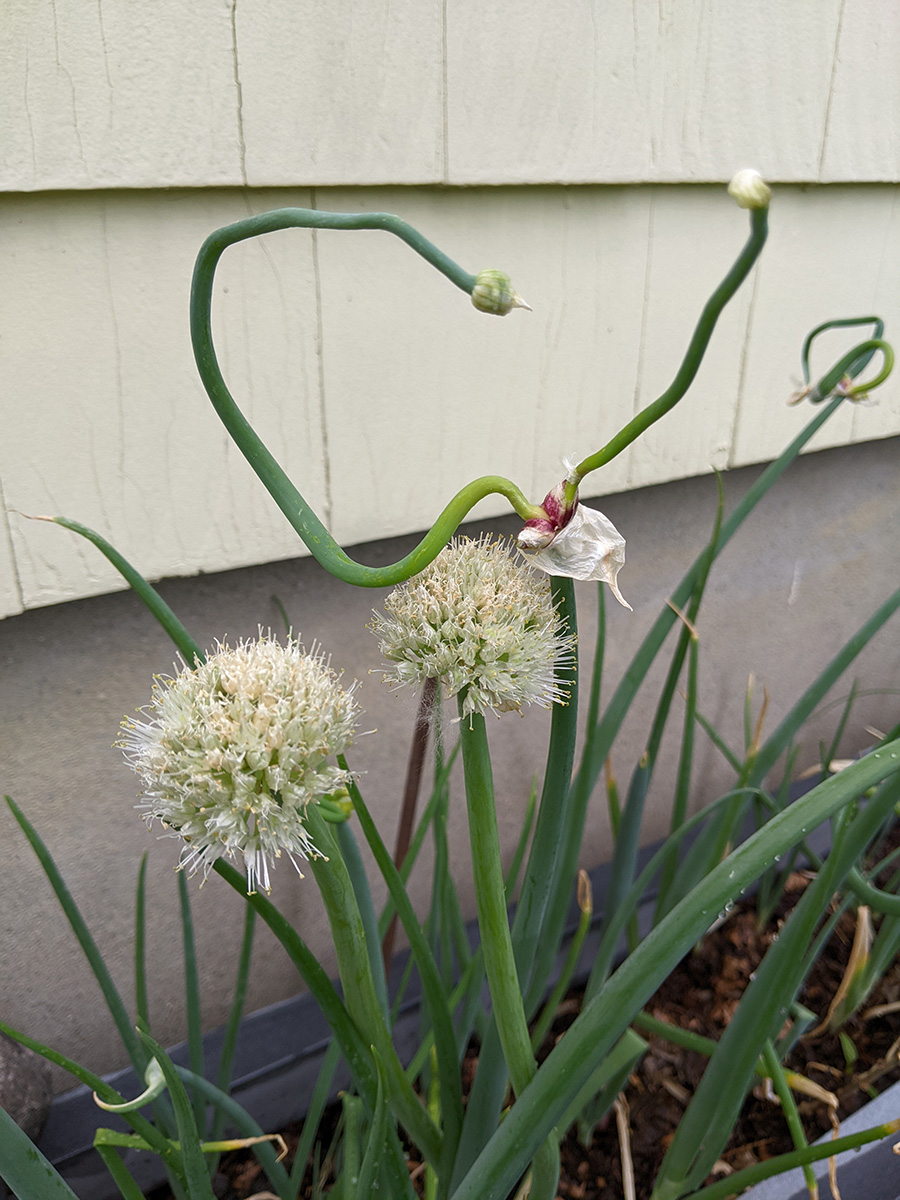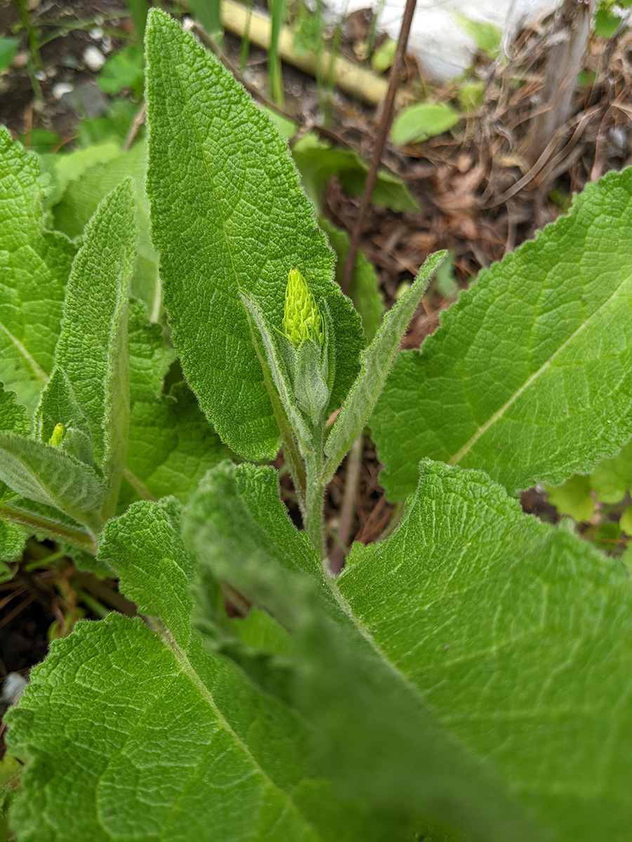 we now have two different types of scallions growing in the backyard: the one that forms a ball of tiny flowers, and the one that forms wandering scallion bulbets. i also noticed that the only surving verbascum plant i grew from seed last year and transplanted into the western perennial bed has managed to stay alive. it looks remarkably like foxgloves, so maybe that's why i missed it, but the emerging flowers look like a tiny green ear of corn, instead of the taller flower stalks of foxgloves.