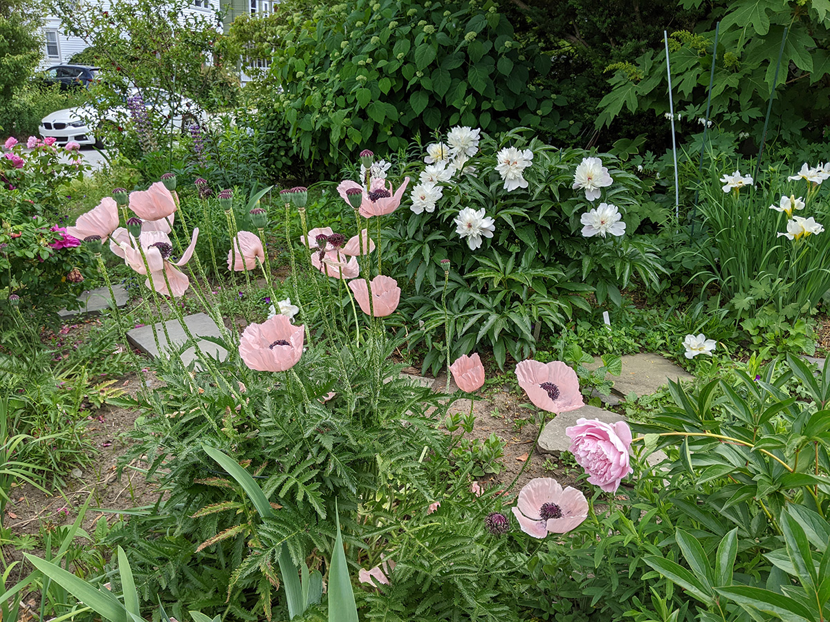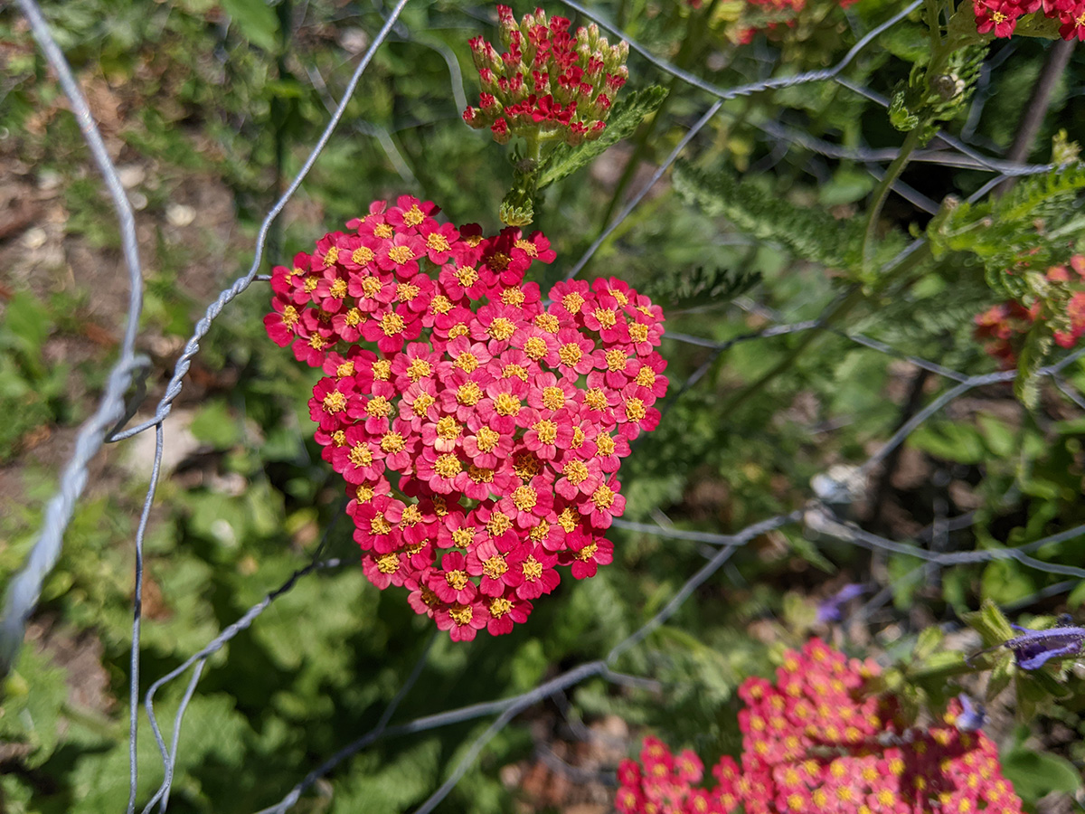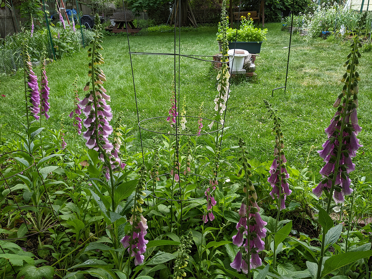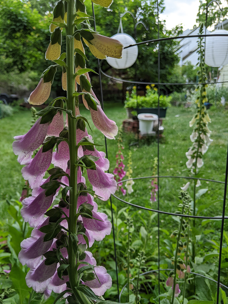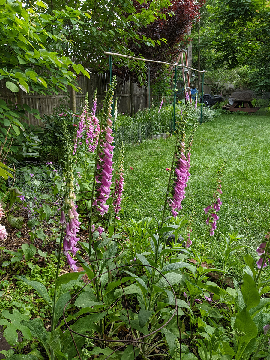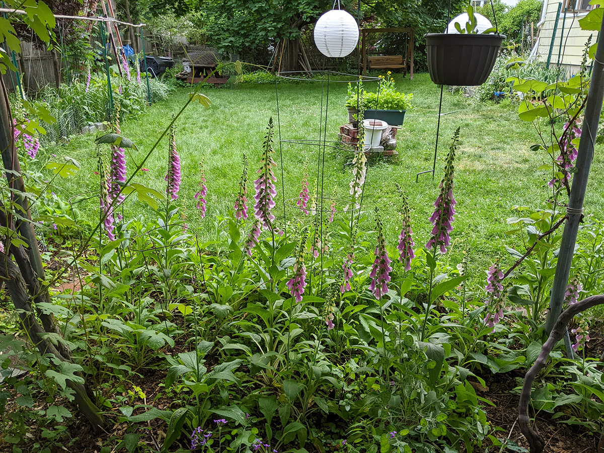 we now have two different types of scallions growing in the backyard: the one that forms a ball of tiny flowers, and the one that forms wandering scallion bulbets. i also noticed that the only surving verbascum plant i grew from seed last year and transplanted into the western perennial bed has managed to stay alive. it looks remarkably like foxgloves, so maybe that's why i missed it, but the emerging flowers look like a tiny green ear of corn, instead of the taller flower stalks of foxgloves.