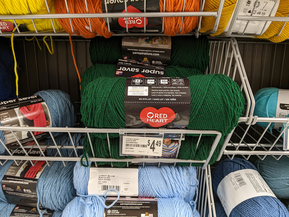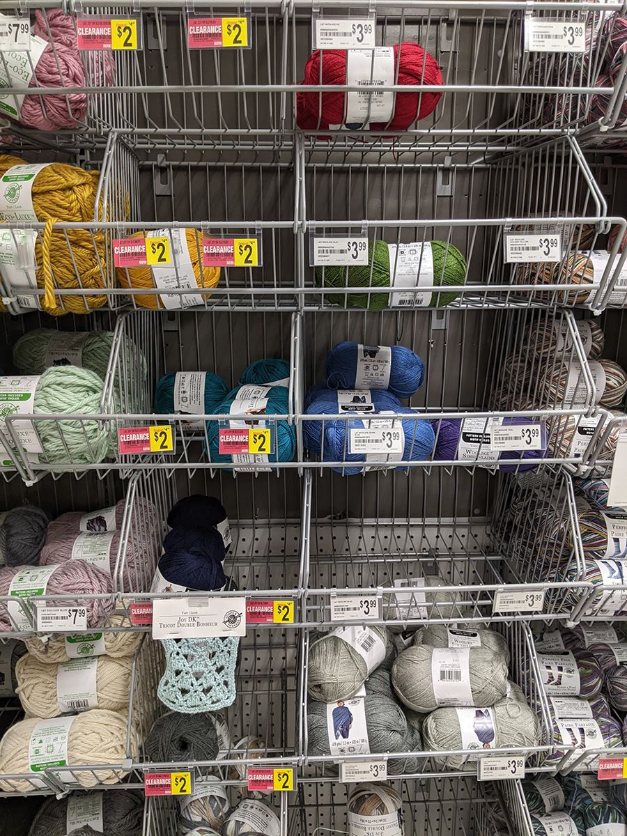 i left the garden and biked to the porter square michael's, to look for thin green yarn for my mother's crochet flower projects. she has some green yarn but they're all unnatural greens, none of them look the green of leaves. for some reason there was a lack of green colored yarn at the store (my personal theory is celtics related); the only one that i found that came close to a leafy green was far too thick. i sent my mother some photos and i ended up getting some fine yarn of different colors, and some other yarns on sale. i had a 20% off everything full price coupon.
