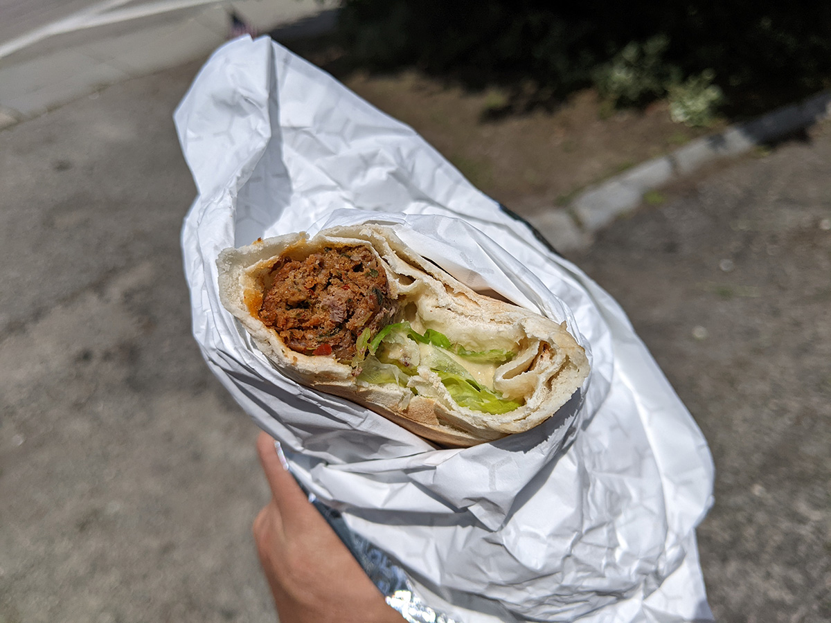 our final stop was massis bakery, another place my mother hadn't been to (because they're closed on sundays). this place features a deli that sells fresh american pastries, bread, and sandwiches. the pita bread here was even cheaper than at arax market. my mother bought some pitted olives and ordered the beef kabob sandwich. we waited as they made our food, admiring the wall photos of the owners throughout the years, from when they first started the store back in 1977. my mother didn't wait to get home to eat the kabob, feasting on it right away, still hot in the aluminum foil. it tasted like a falafel wrap, with distinctive middle-eastern flavors. we saved the rest for my father for when we got back home.