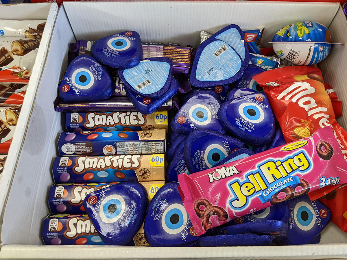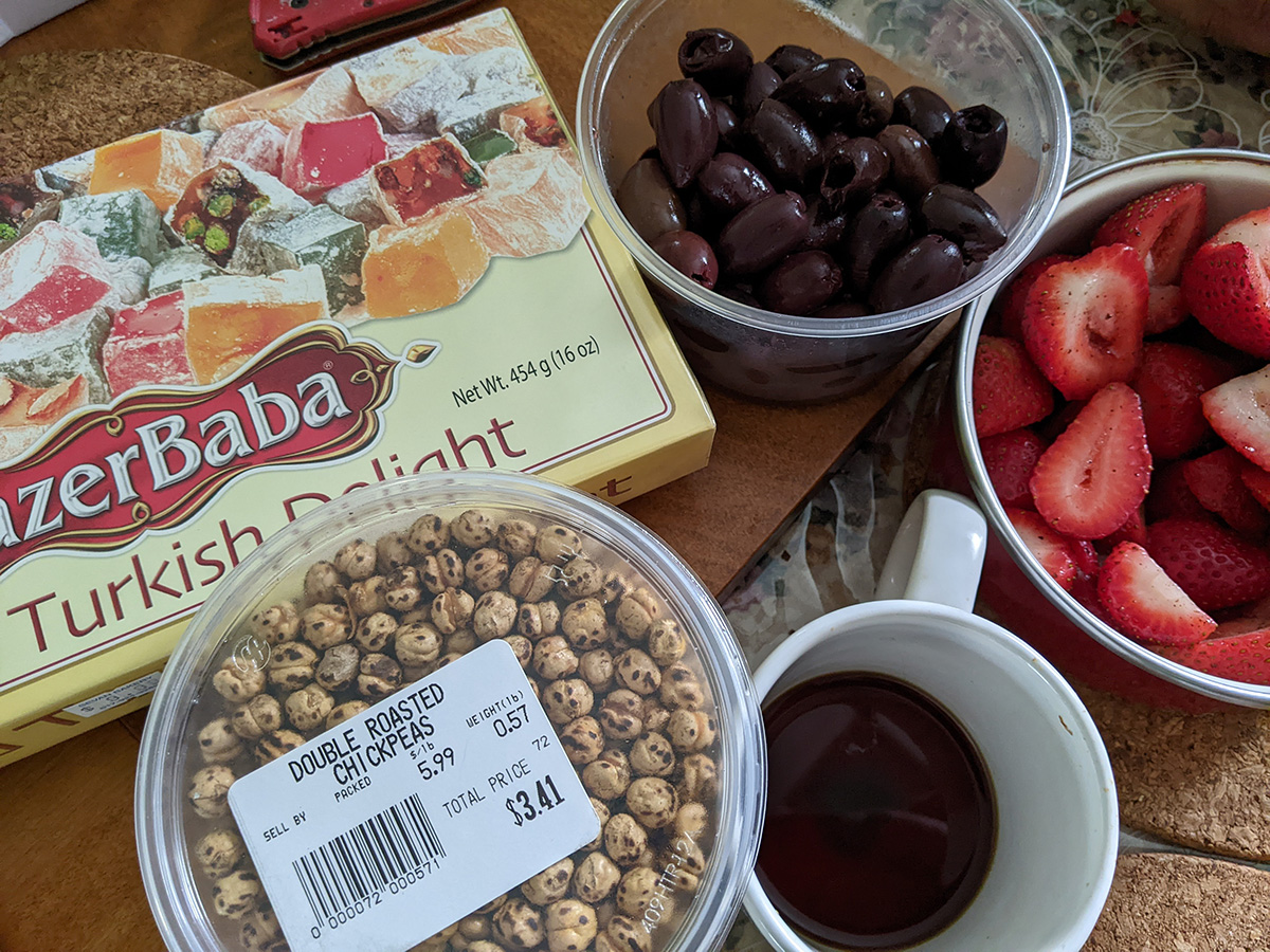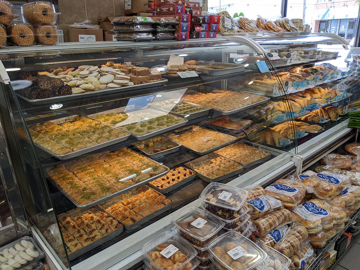 the first grocery store we visited was sevan bakery. this was one my father and i had been to but that time my mother and i came was on a sunday and they were closed. this place leans more towards greek-turkish, with a very clean and air-conditioned store with fresh cheese and pastries and desserts, as was a salad bar featuring a dizzying array of olive selection. i got a box of turkish delight, my mother some double roasted chick peas.