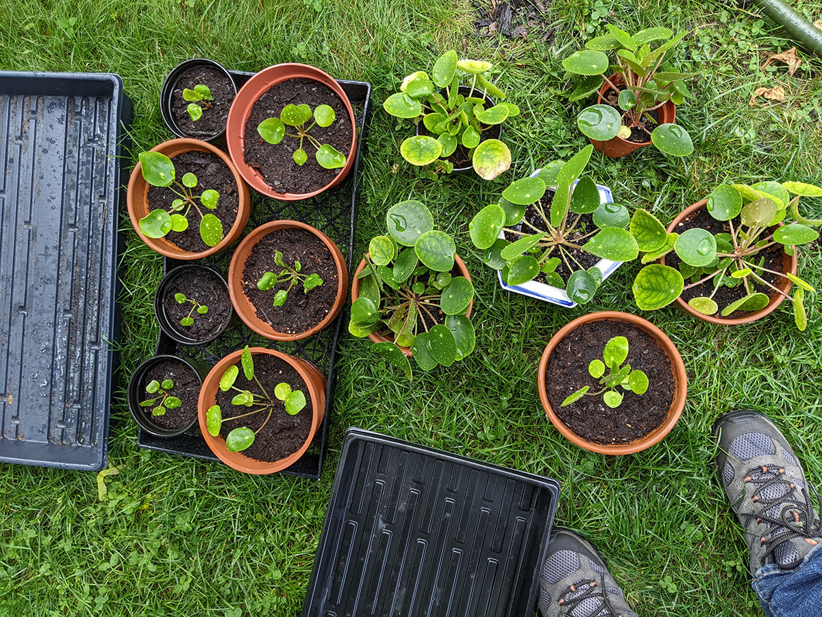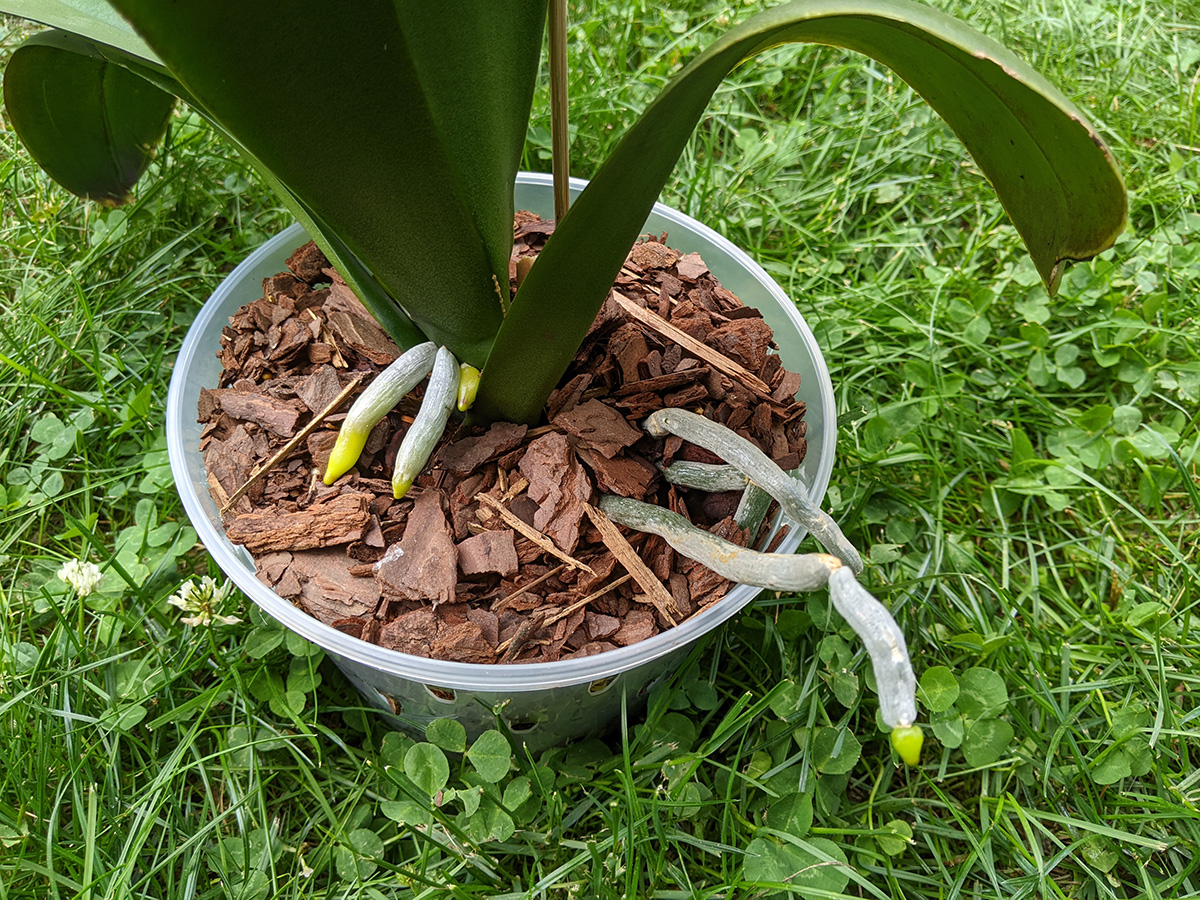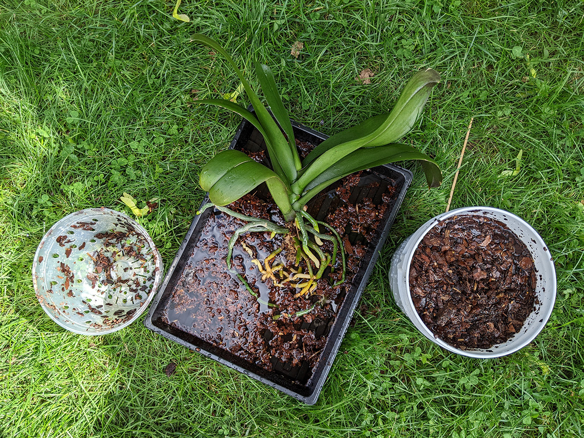 as for me, i brought out all the pileas and watered them. i also repacked all the orchids because i made a mistake yesterday of filling the new pots with fresh orchid grow medium but i didn't soak them beforehand, just watered them afterwards, which meant all the wood chips were dried today. i dumped out the wood chips, soaked them in orchid-fertilizer-infused water, before adding them back to the orchid pots. i also tried to bury as many roots as possible instead of leaving them outside, which is what i did yesterday. i discovered one of the hyacinth plants had a black aphid infestation and i blasted it with neem oil spray.