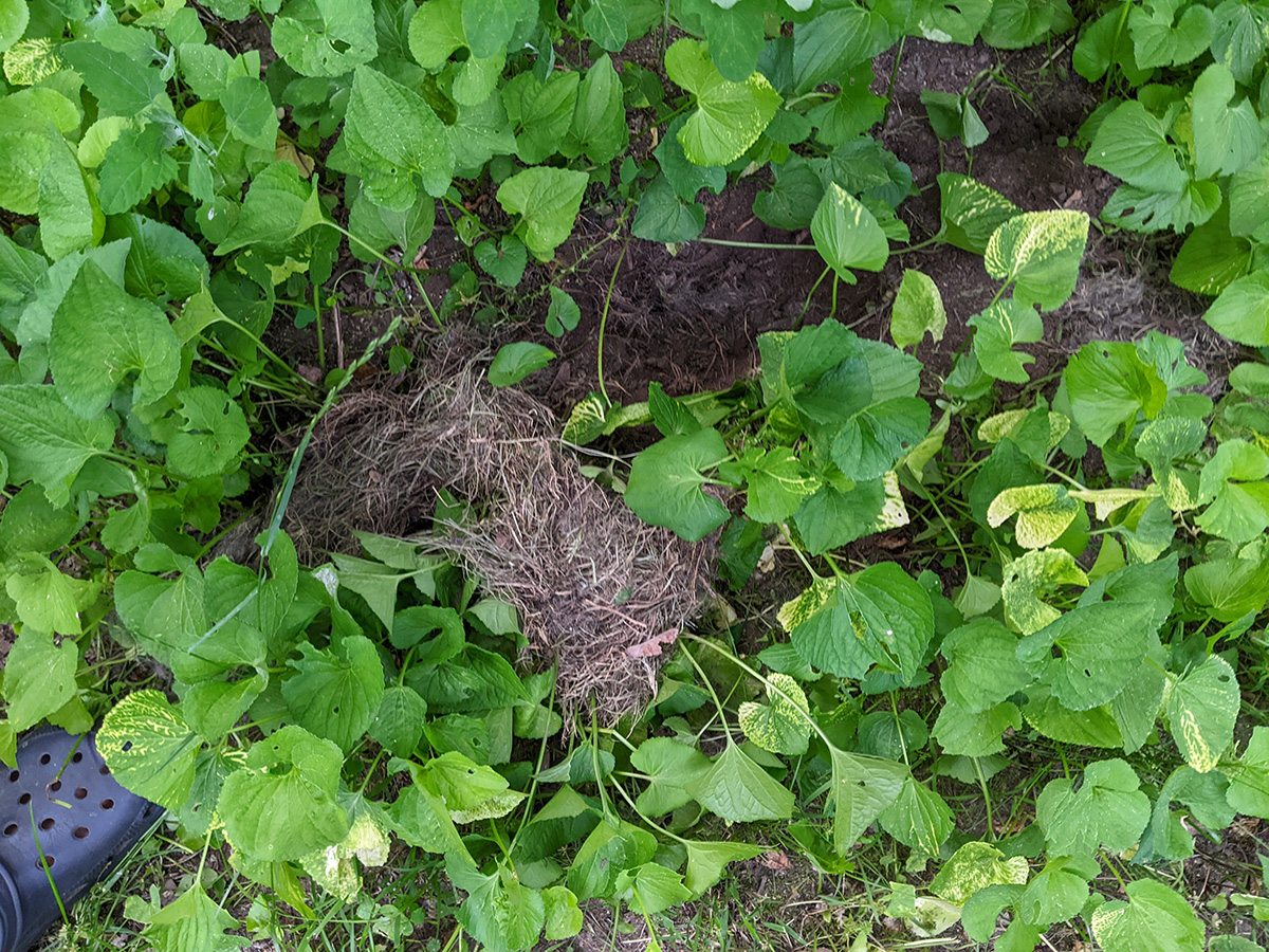earlier i saw a large adult rabbit and a bunny nearby eating the grass. i don't mind when they do that, but i still went outside and chase them away, just to let them know they can't have a free run of the backyard. hailey was excitedly sniffing around the bottom of the maple tree. i figured maybe she caught the scent of a squirrel, or possibly a rabbit. when we looked around, that's when we saw the rabbit nest, behind the tree in a hole in the ground covered with grass and fur. the nest seemed to have been abandoned because my father said over the weekend he saw 3 very tiny bunnies running around the yard. hailey continued to sniff around the tree, and that's when we noticed something hopping out from the violets growing underneath the tree. at first we couldn't see what it was because it was so camouflaged, before we realized it was a bunny. a very small bunny, about the size of a toad (egg-size). it didn't seem to know what kind of danger it was in, and i managed to cup it with my hands on the ground, before it hopped away and disappeared into the understory of some daylily plants.
