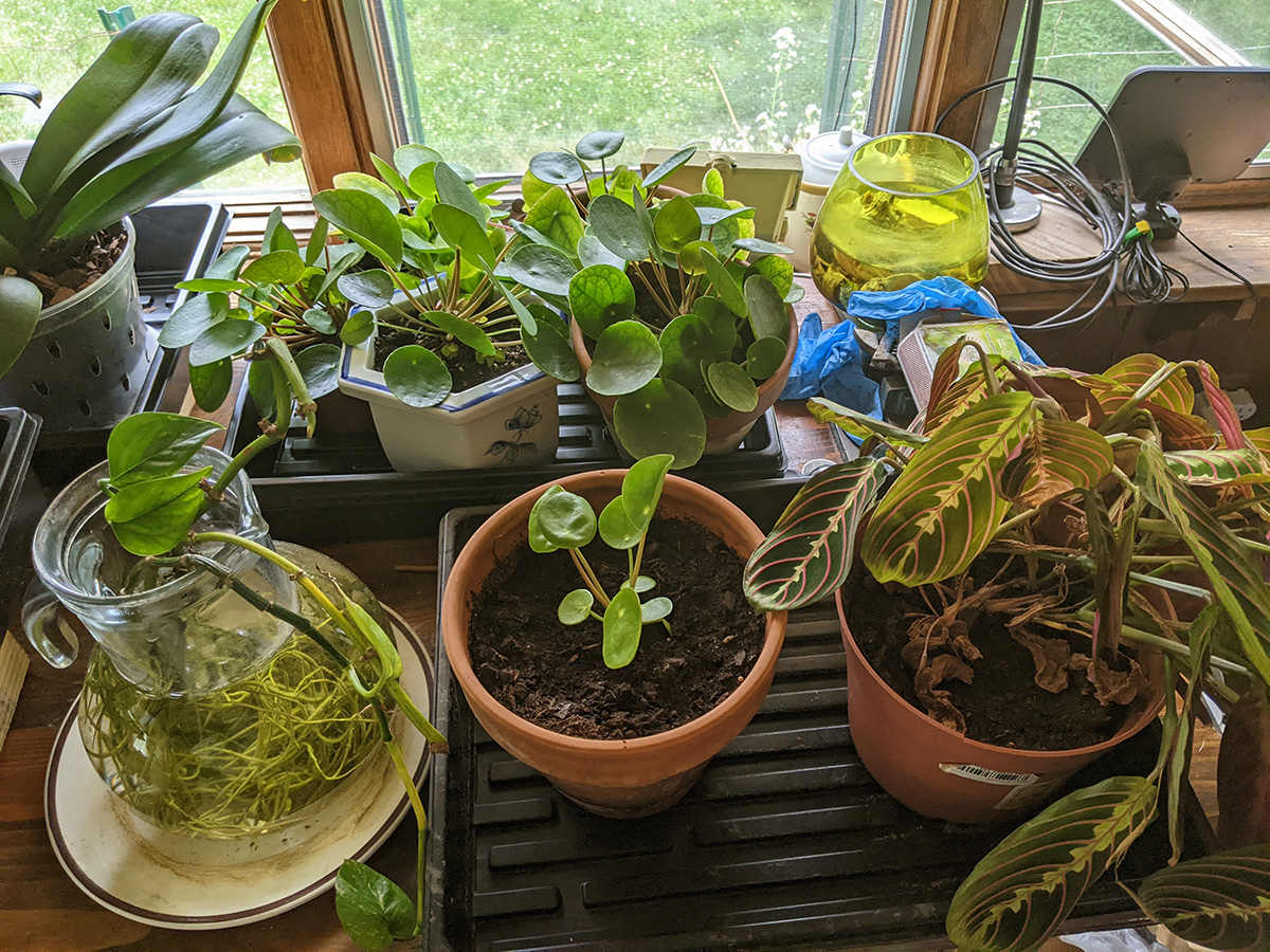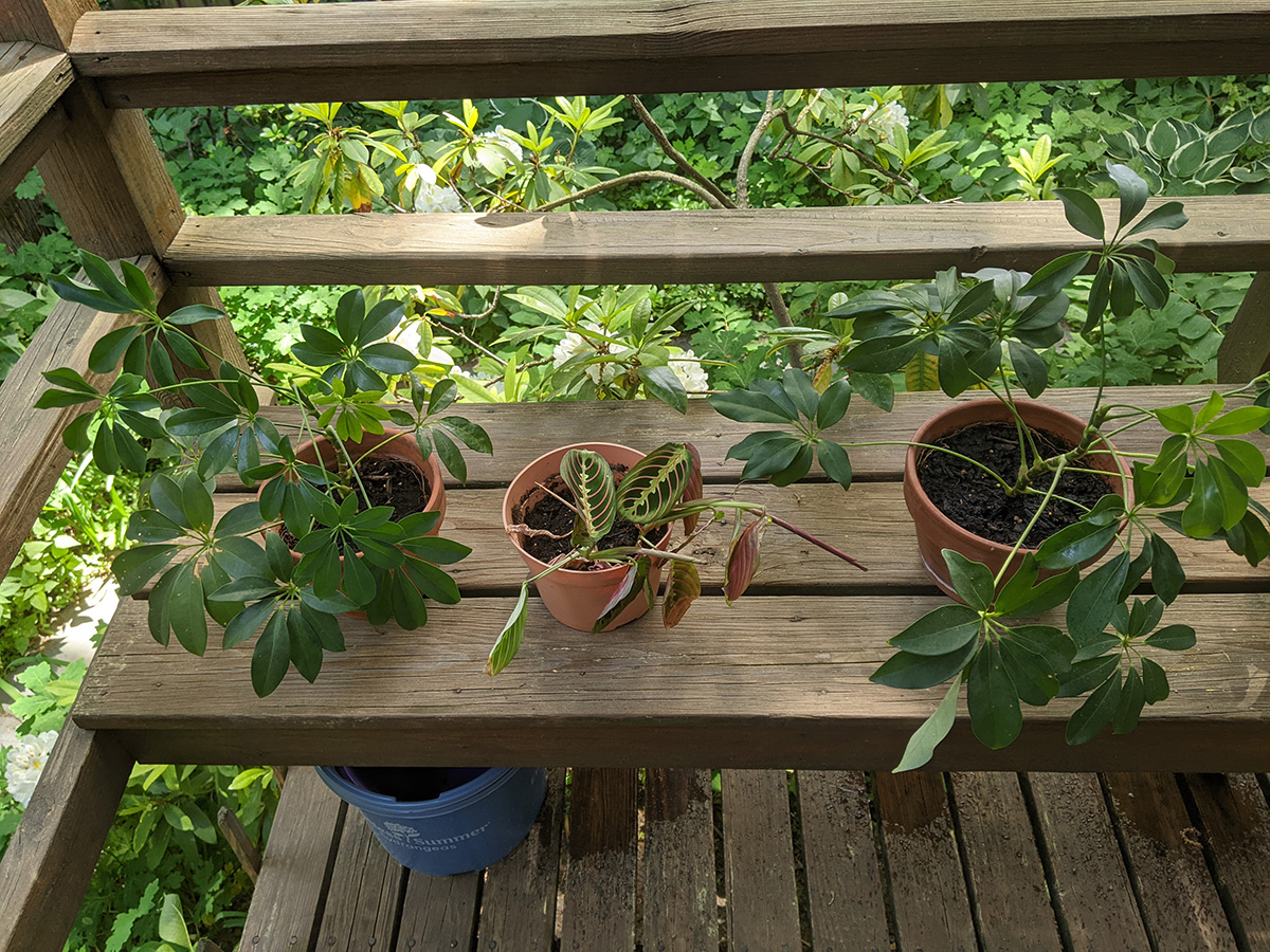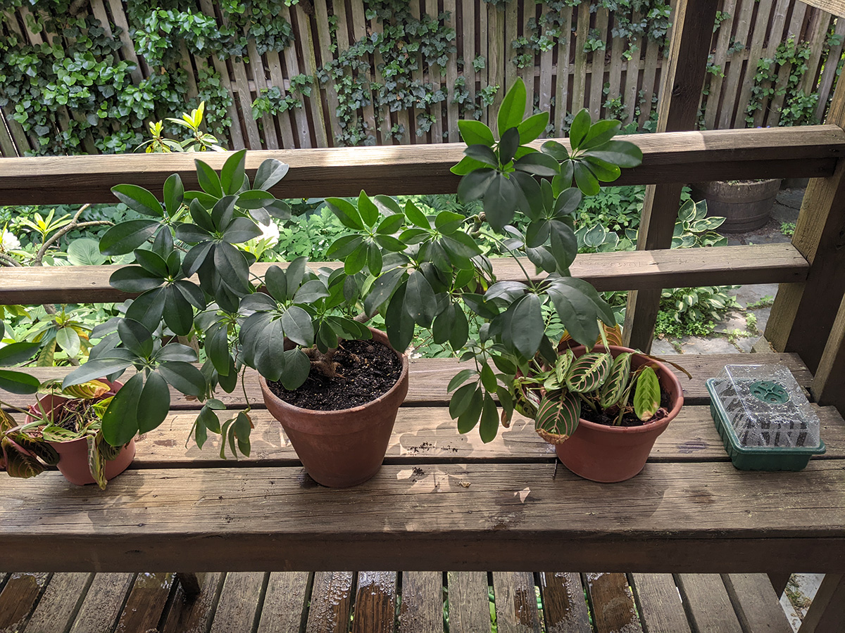 i took the thai basil and nigella seedlings and put them in my saddlebag. i also moved out most of my houseplants except the pileas and the thanksgiving cactus. now that it's warm enough for the umbrella plants and prayer plants to be outside, and they do much better exposed to the elements than they do living indoors anyway. i'll need to do some repotting at some point them, the soil is all dried up and caked in fungus and mold. but that's a project for another day.