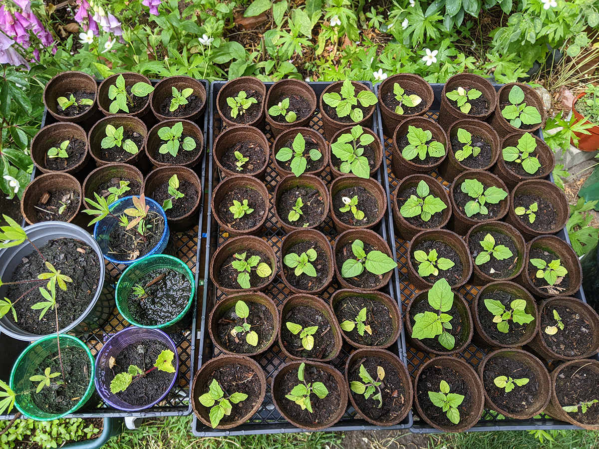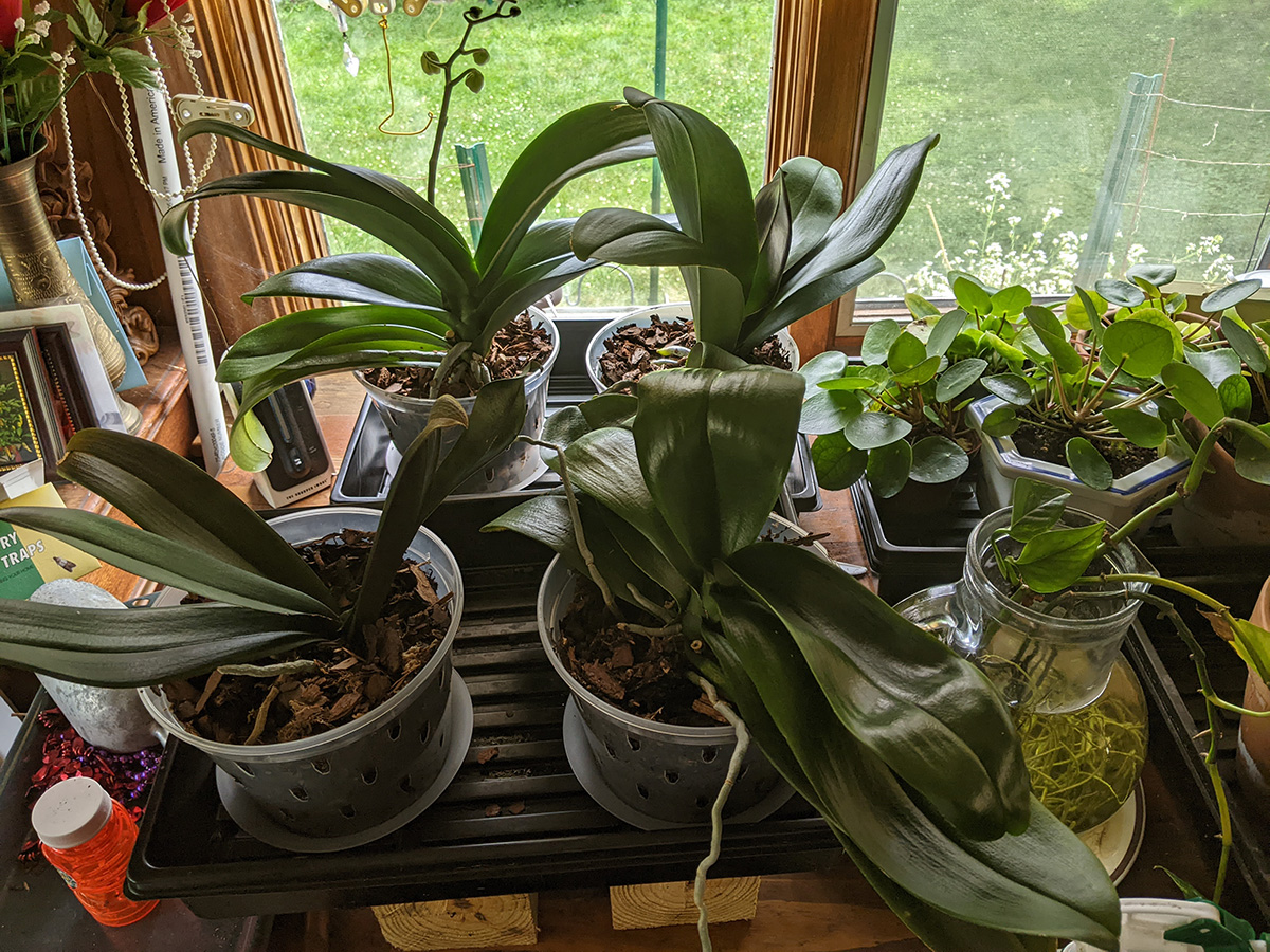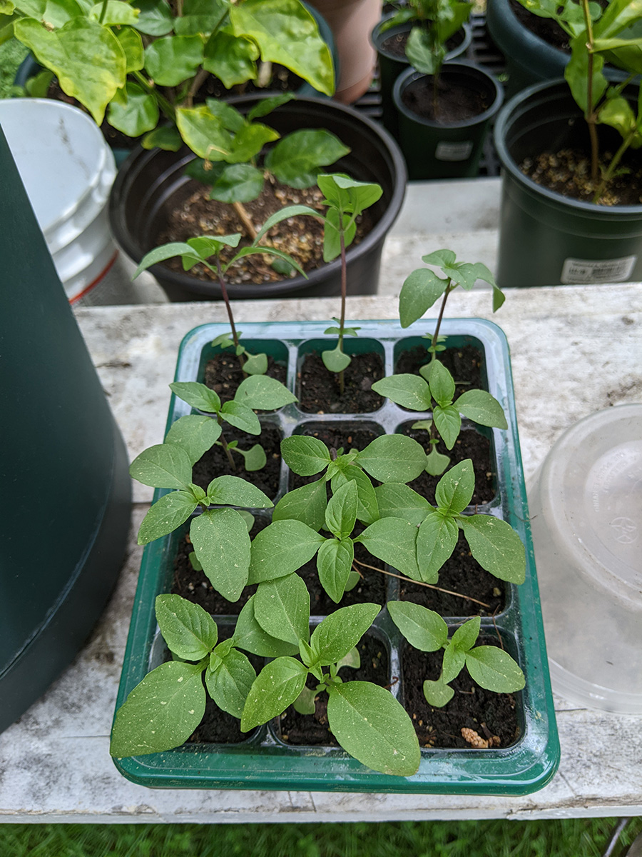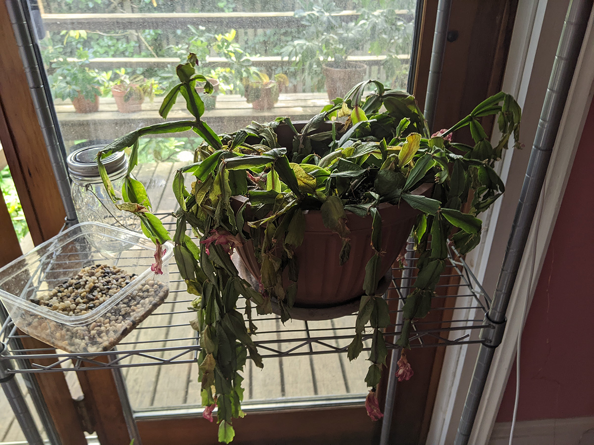 i took the thai basil and nigella seedlings and put them in my saddlebag. i also moved out most of my houseplants except the pileas and the thanksgiving cactus. now that it's warm enough for the umbrella plants and prayer plants to be outside, and they do much better exposed to the elements than they do living indoors anyway. i'll need to do some repotting at some point them, the soil is all dried up and caked in fungus and mold. but that's a project for another day.