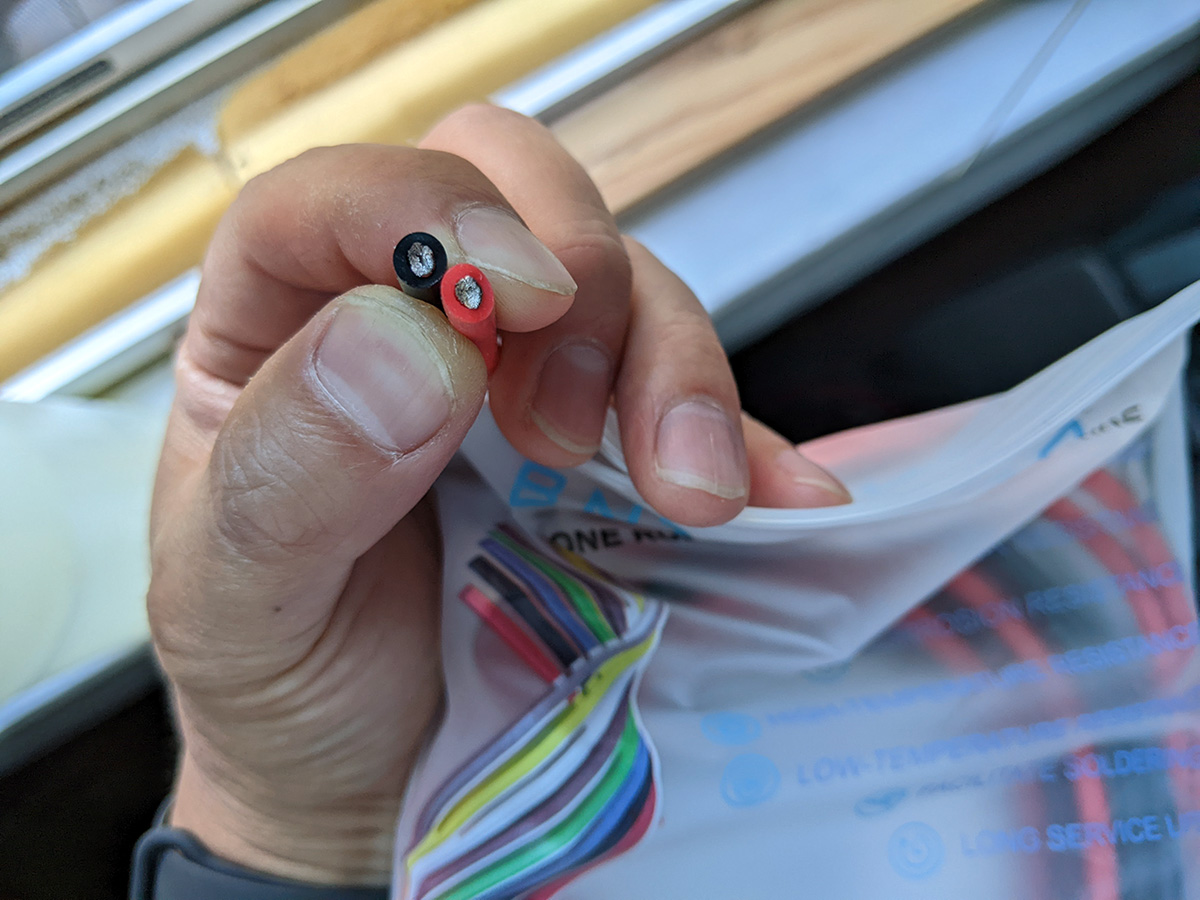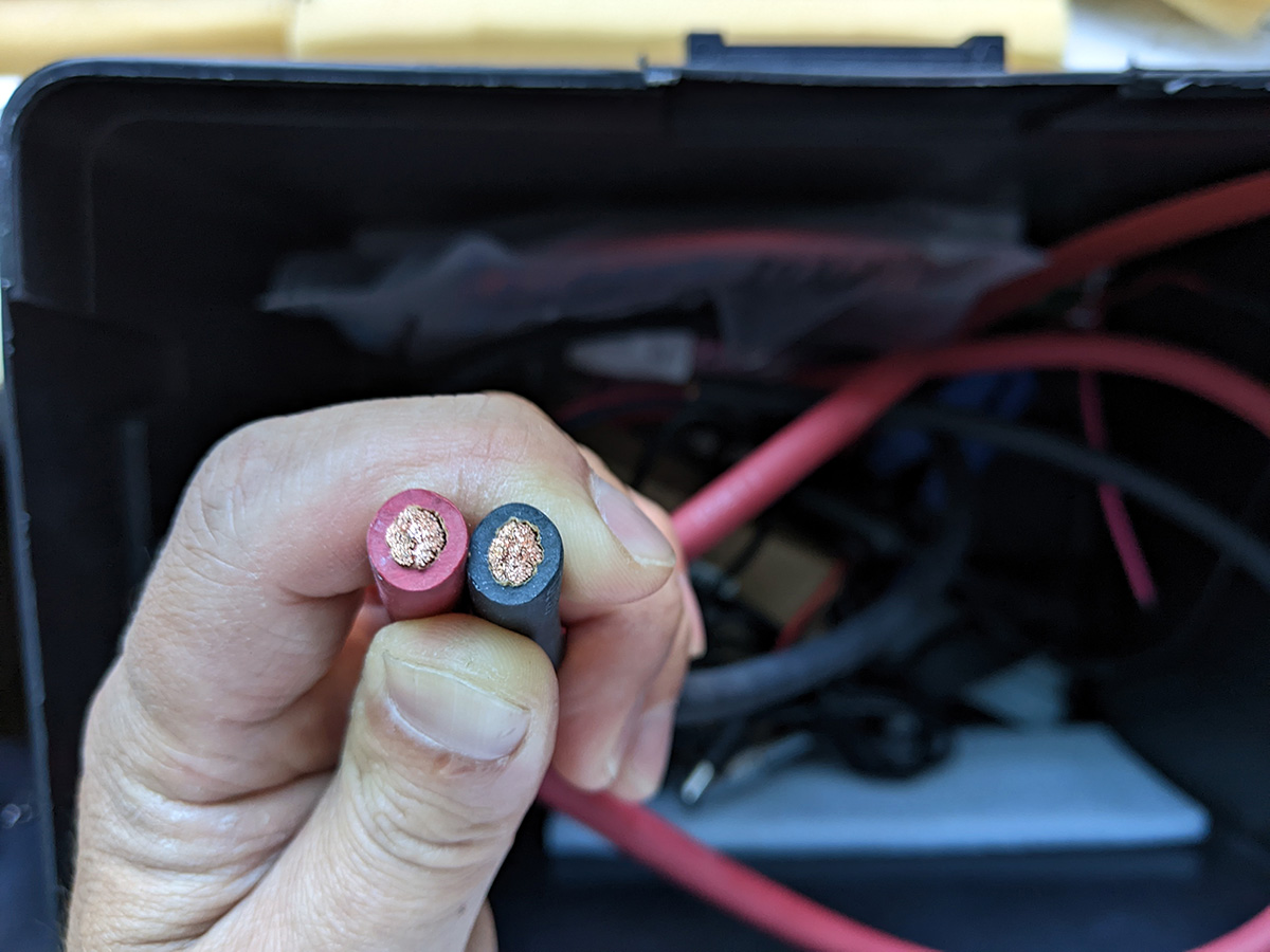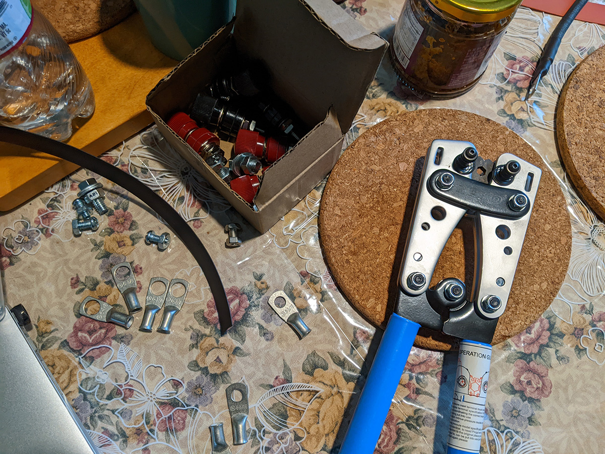 my father and i started piecing together one of the LiFePo4 battery boxes, now that we have most of the parts. first we made the 6 AWG wires that connect the batteries to the red/black terminal posts on top of the battery box. we crimped on a ring terminal first, which involved stripping one end of the 6 AWG wire (rated to 115A) then crimping the large terminal with NEIKO crimping pliers we bought 2 weeks ago. the pliers made simple work of high gauge crimping, an essential tool, not sure how we would've crimped it otherwise.