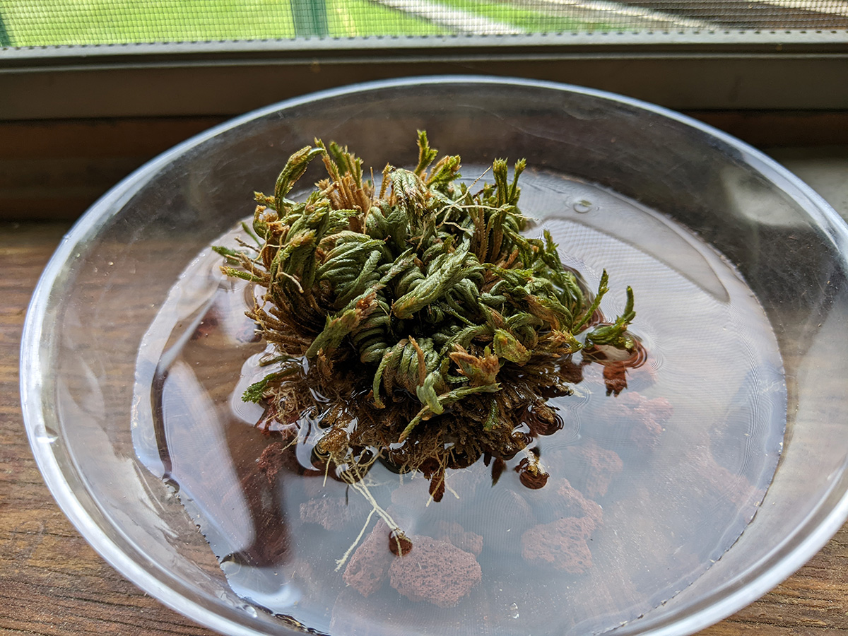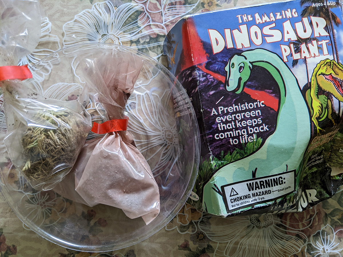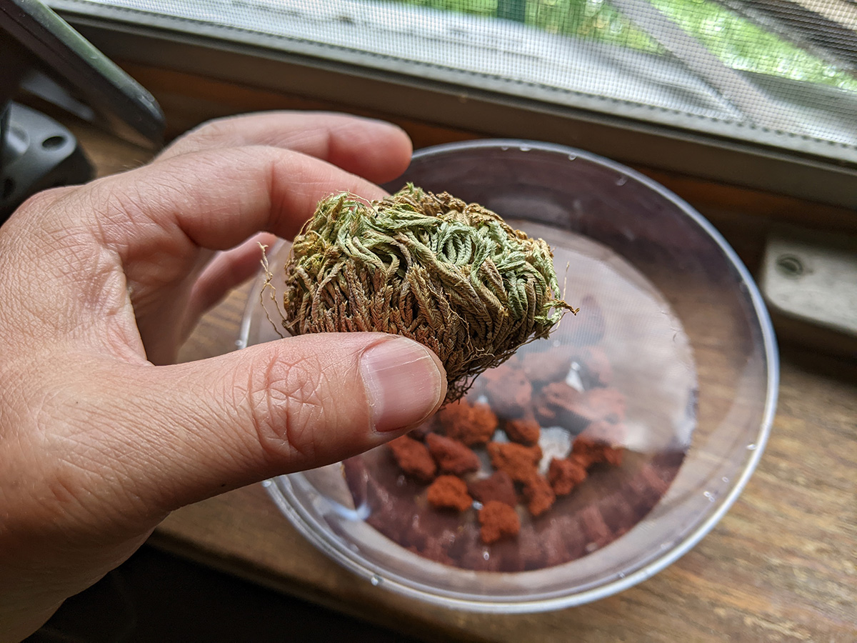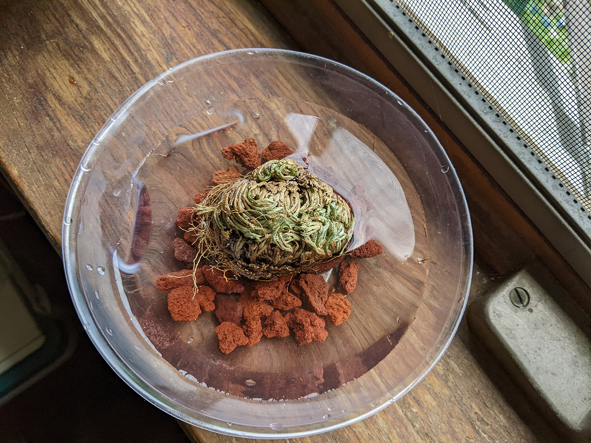 the reason why it took me so long to eat my lunch was because i was busy preparing my resurrection plant (Selaginella lepidophylla) for blooming. i got this package of resurrection plant - marketed as a dinosaur plant - from my neighbor don 1-2 years ago. it'd been sitting in my house, waiting to be bloomed. of course i set up my gopro so i could get a time lapse video of the resurrection plant in action. not only did it come with one dried plant, but also a plastic dish and some red lava rocks from new mexico. i put it out on the windowsill in the sunroom so it could get some sun as well. as soon as i soaked the plant in some water, it started to unfurl. what was once a dried up ball opened up over the hours to become a green fern.
