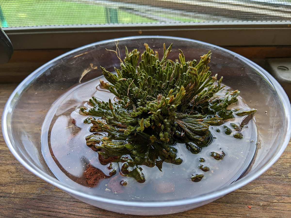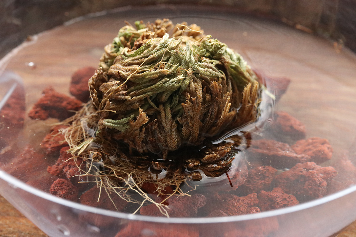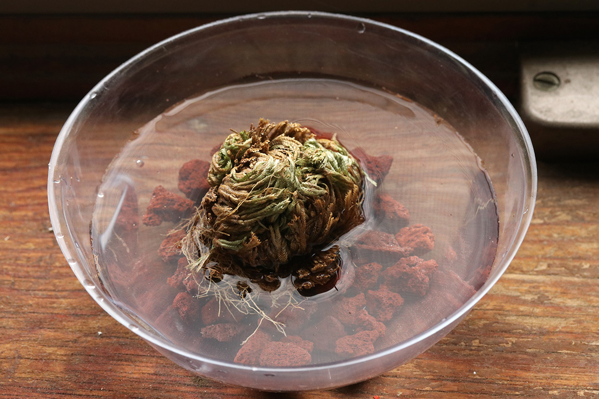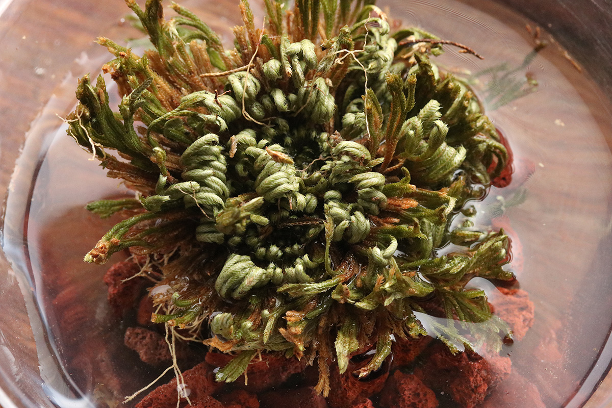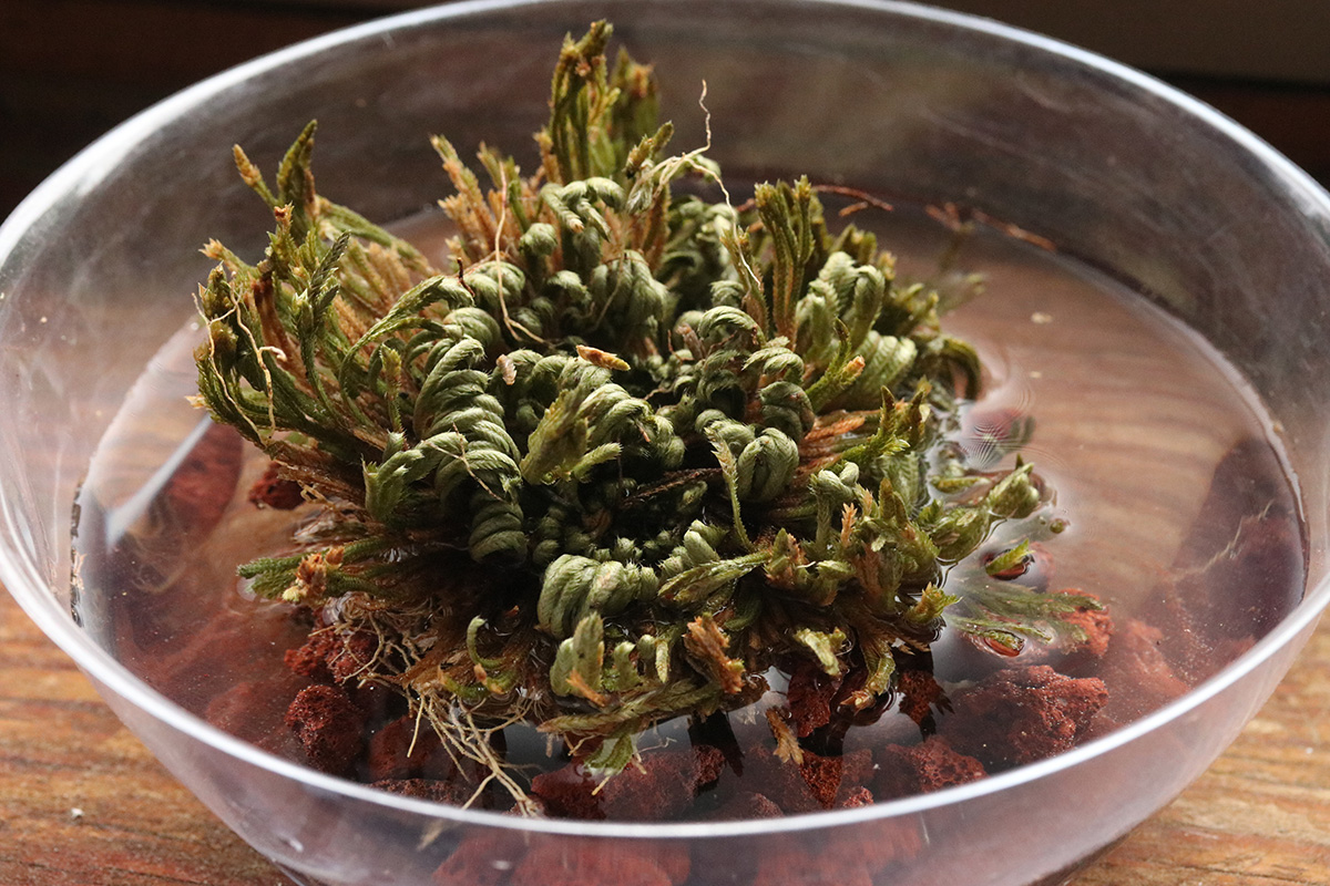 the reason why it took me so long to eat my lunch was because i was busy preparing my resurrection plant (Selaginella lepidophylla) for blooming. i got this package of resurrection plant - marketed as a dinosaur plant - from my neighbor don 1-2 years ago. it'd been sitting in my house, waiting to be bloomed. of course i set up my gopro so i could get a time lapse video of the resurrection plant in action. not only did it come with one dried plant, but also a plastic dish and some red lava rocks from new mexico. i put it out on the windowsill in the sunroom so it could get some sun as well. as soon as i soaked the plant in some water, it started to unfurl. what was once a dried up ball opened up over the hours to become a green fern.
