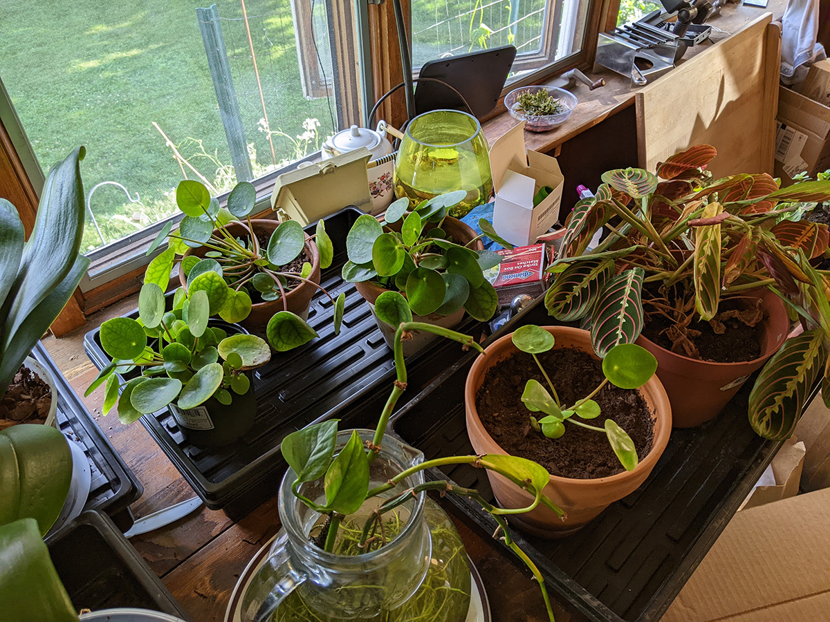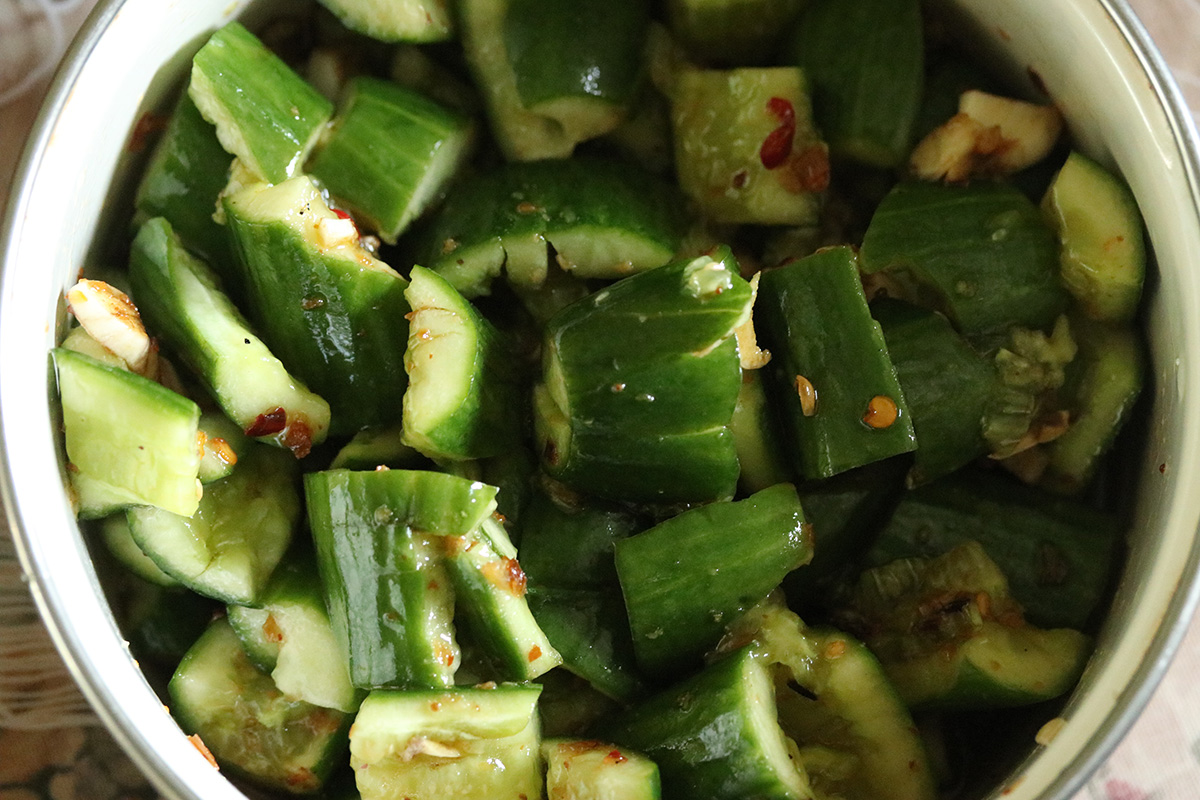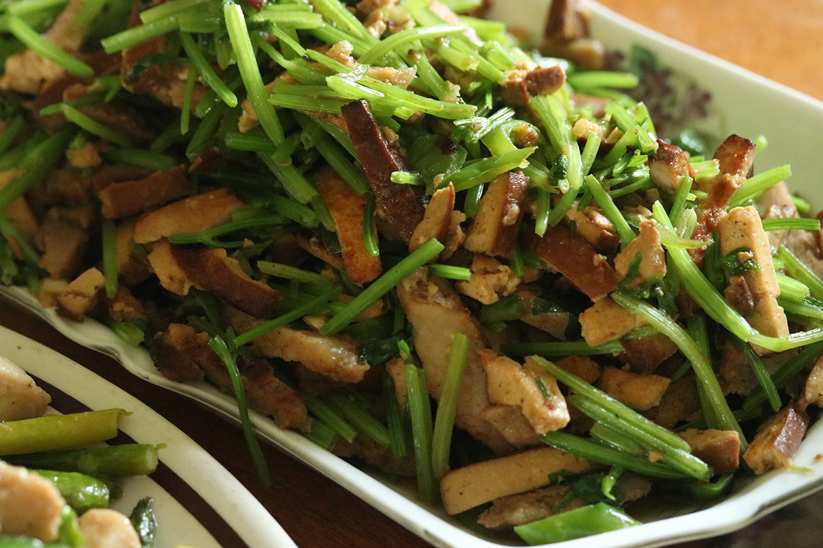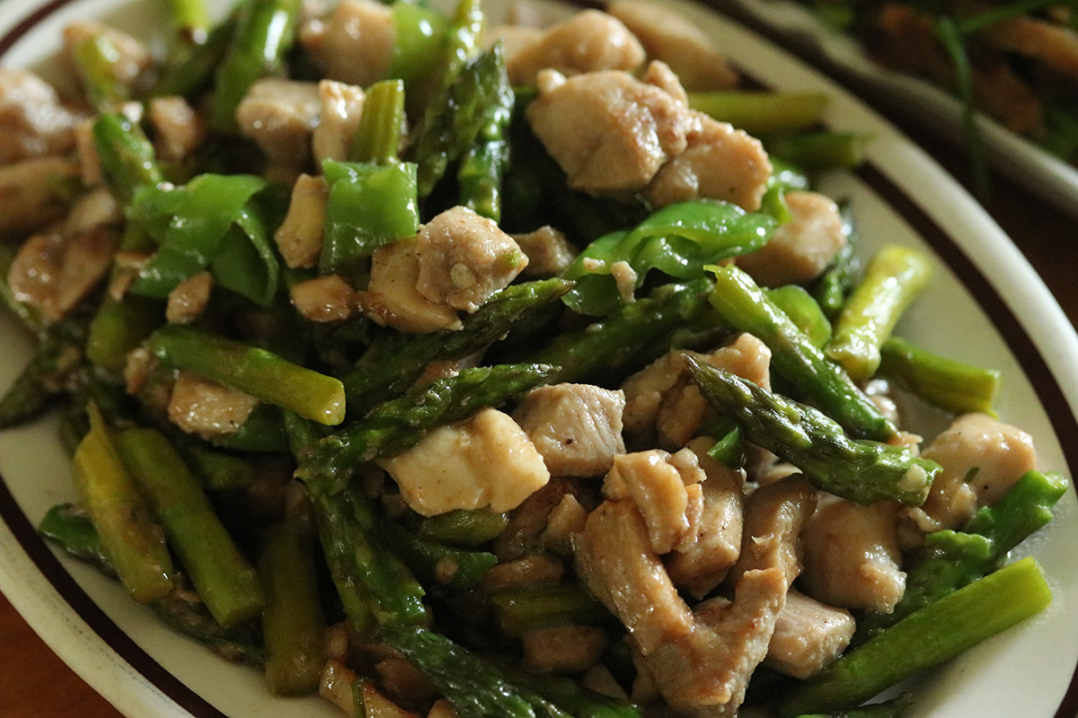 my mother spent most of the day in the bedroom watching her japanese/korean drama on the imac, crocheting her flowers. today she was making daisies. around 5pm she came out to make dinner. earlier she was outside harvesting a bunch of chinese celery stalks to make a tofu and leftover porkchop stirfry. she also made a chicken and asparagus stirfry along with a bowl of smashed cucumbers.