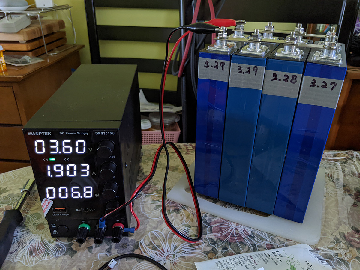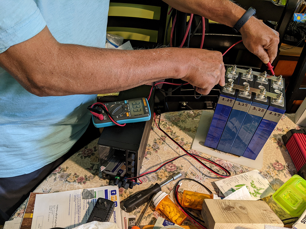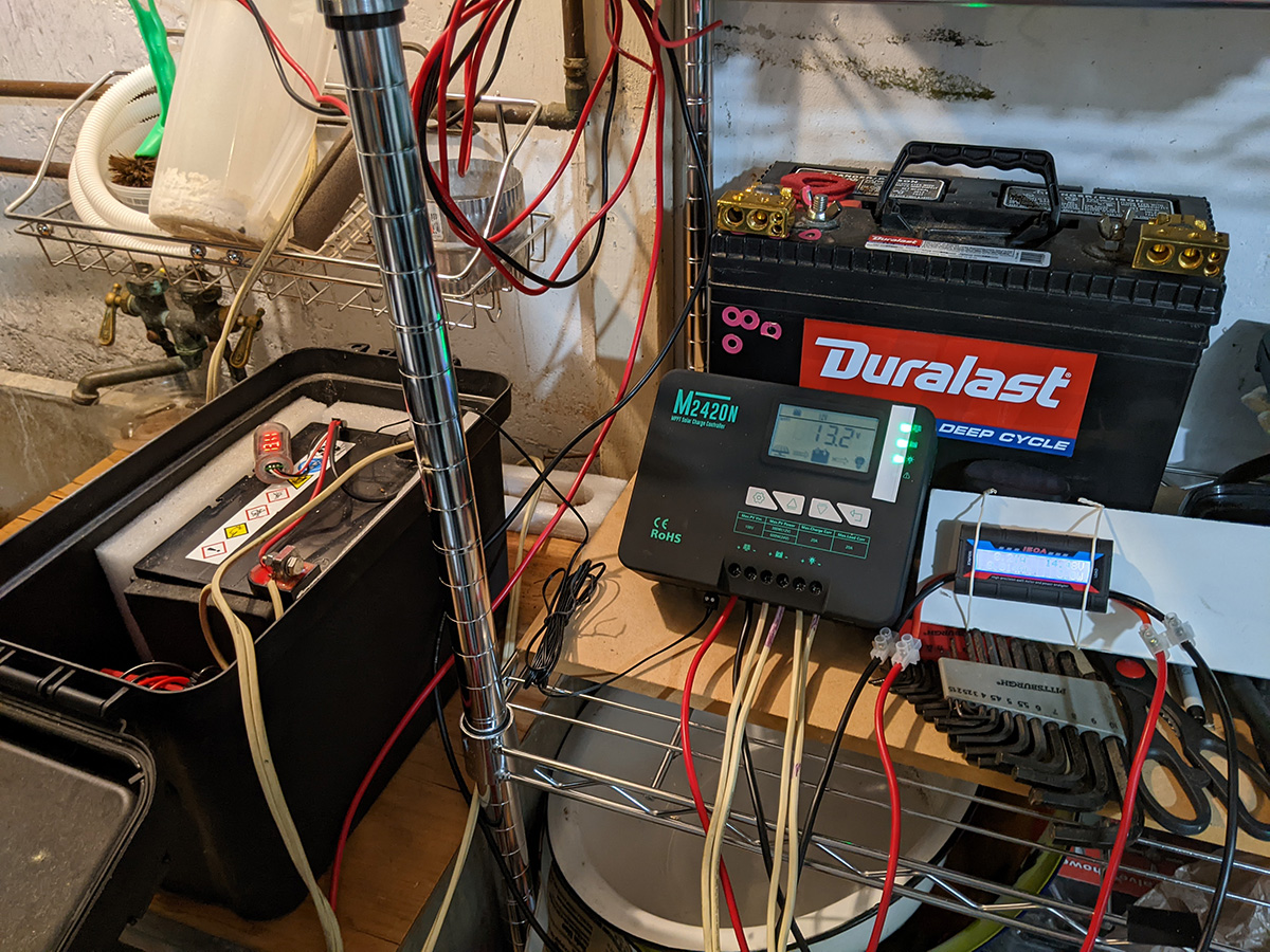 once the LiFePo4 cells have been charged to 3.60V, we can finally assemble the battery and put it to use. that also meant we needed to put back our backyard flexible solar panel. up until now, we've been charging the 12V 35Ah lead acid battery using a trickle charge, ever since some critter chewed up the solar panel wires. we ran into some problems however when i tried to read the outlet of the 100W solar panel with the multimeter and got zero. we tried the smaller 50W panel and that worked fine, so we opted to just use the 50W panel for the time being. while i pulled the red/black 12 gauge wire (copper clad aluminum) from the window to the solar panel hanging from the wall, my father was in the basement connecting all the wires: solar panel wires into our 100A in-line watt meter and power analyzer that goes into the MPPT solar charge controller which connects to the battery and also connects to the on-demand water pump. we tested it out, everything seems to be working. once the battery box is ready, all we need to do is swap out the battery and change the MPPT controller so it uses a lithium-based solar charging profile.